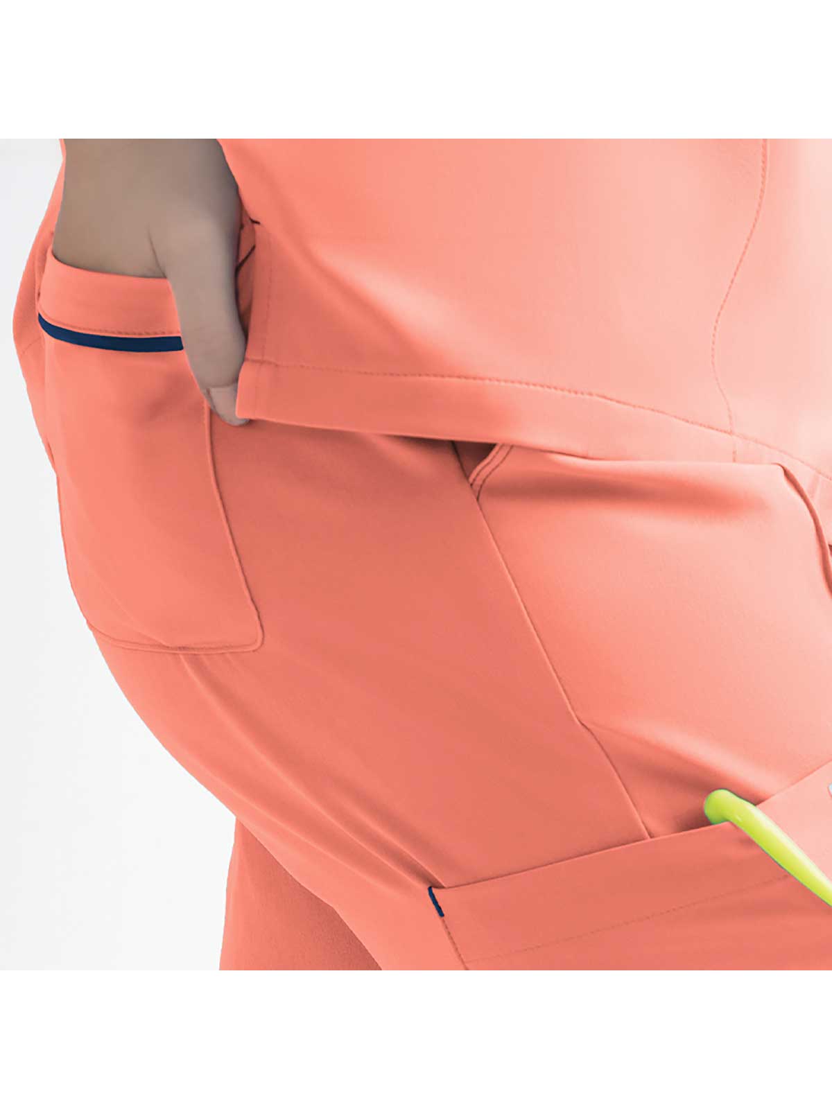"*Women's mock wrap top *Contrast/DTM knit side panel for added extra flexibility *Two front patch pockets with inner utility tape *Back yoke and darts for added style and shape" Mock-wrap V-neckline Short sleeves Back yolks and darts Contrast knit stretch...