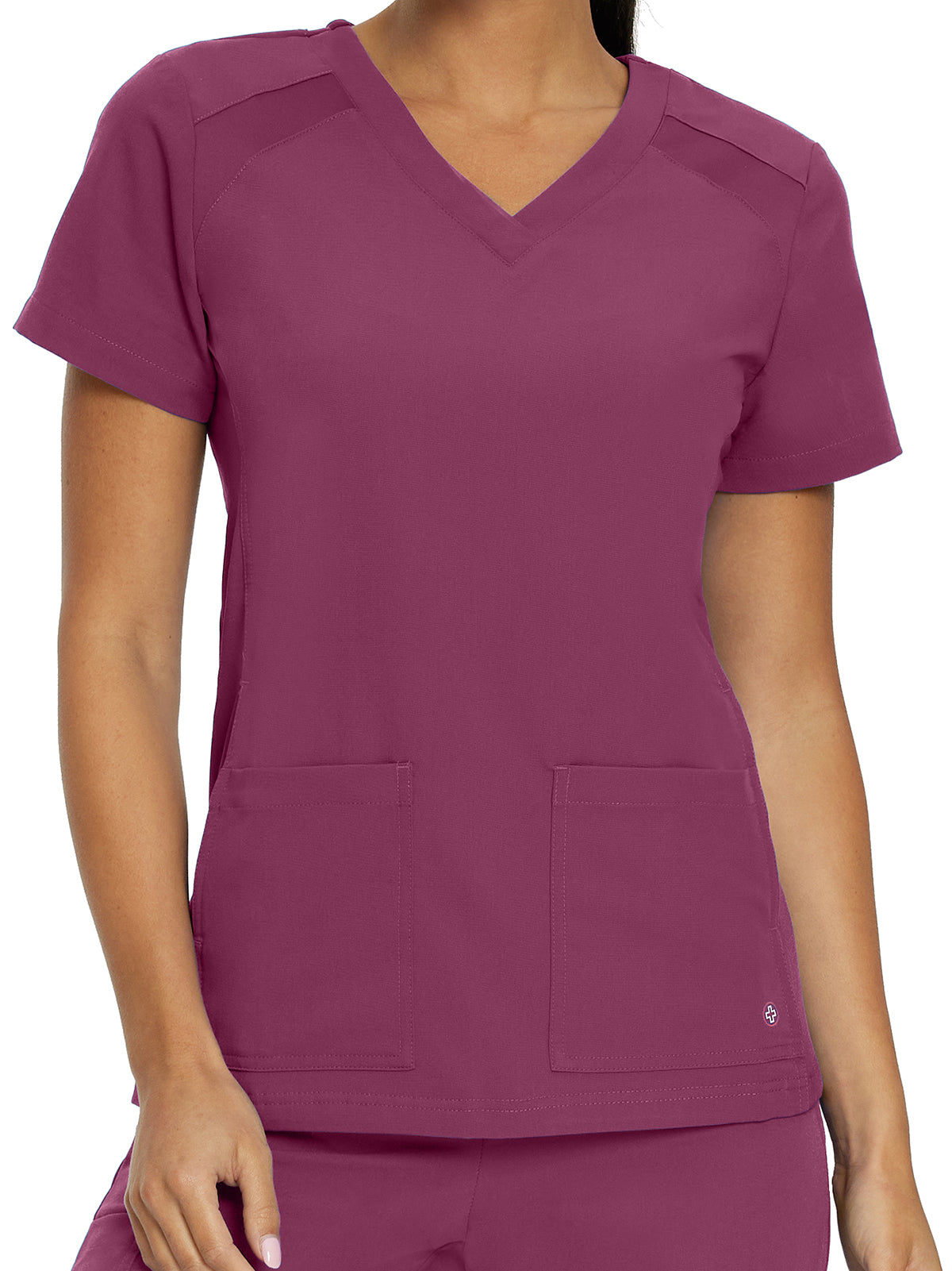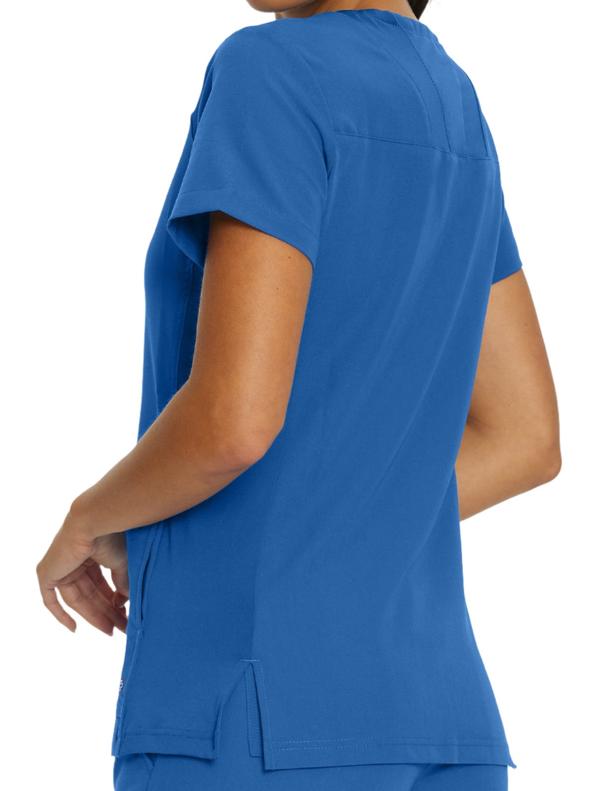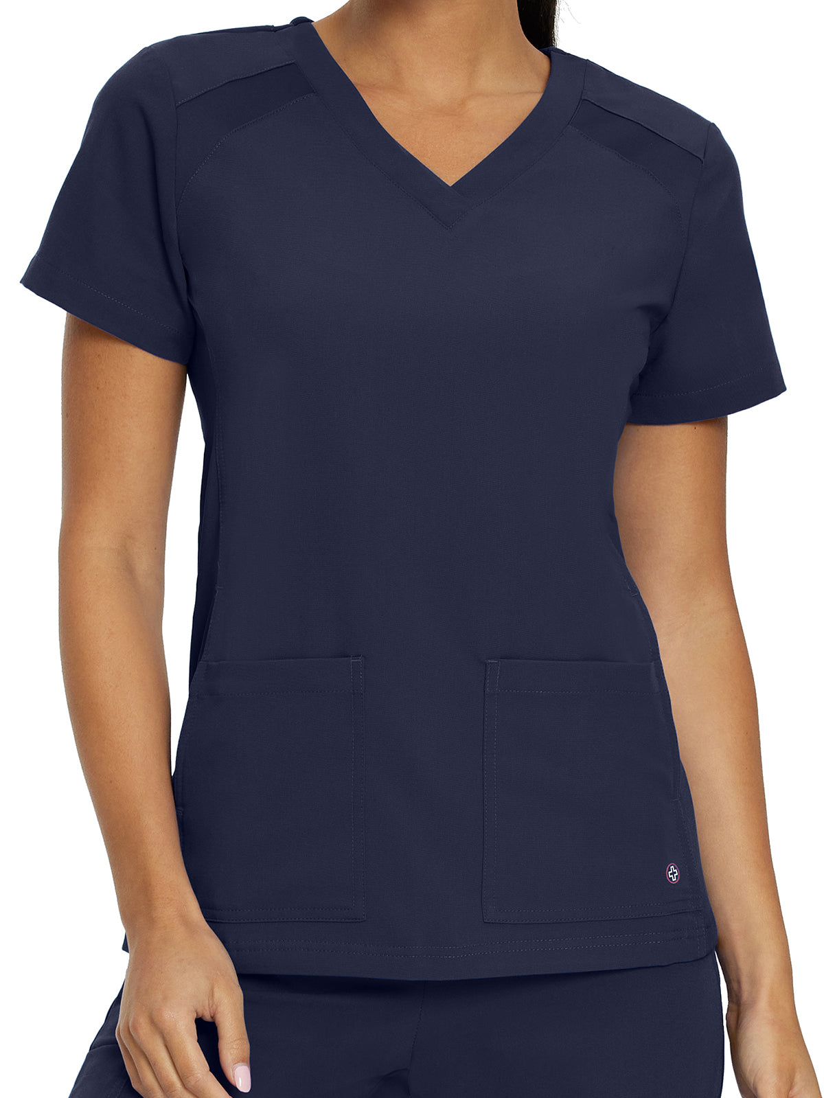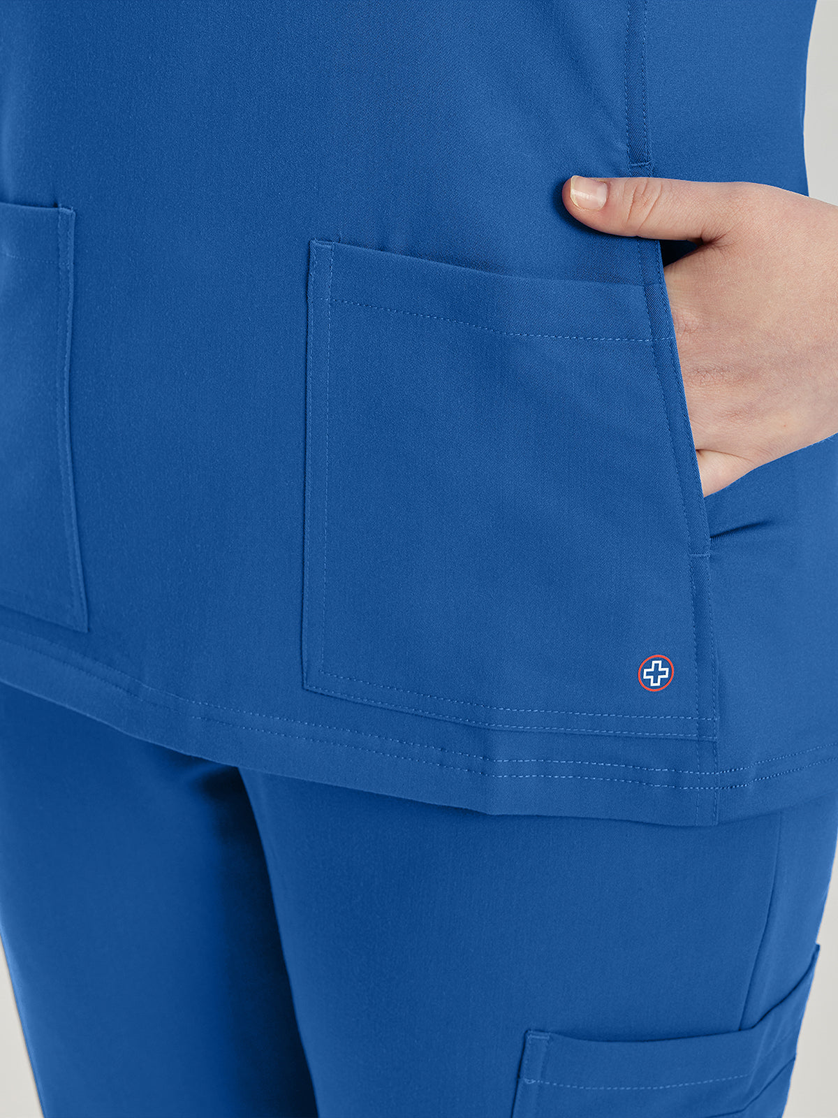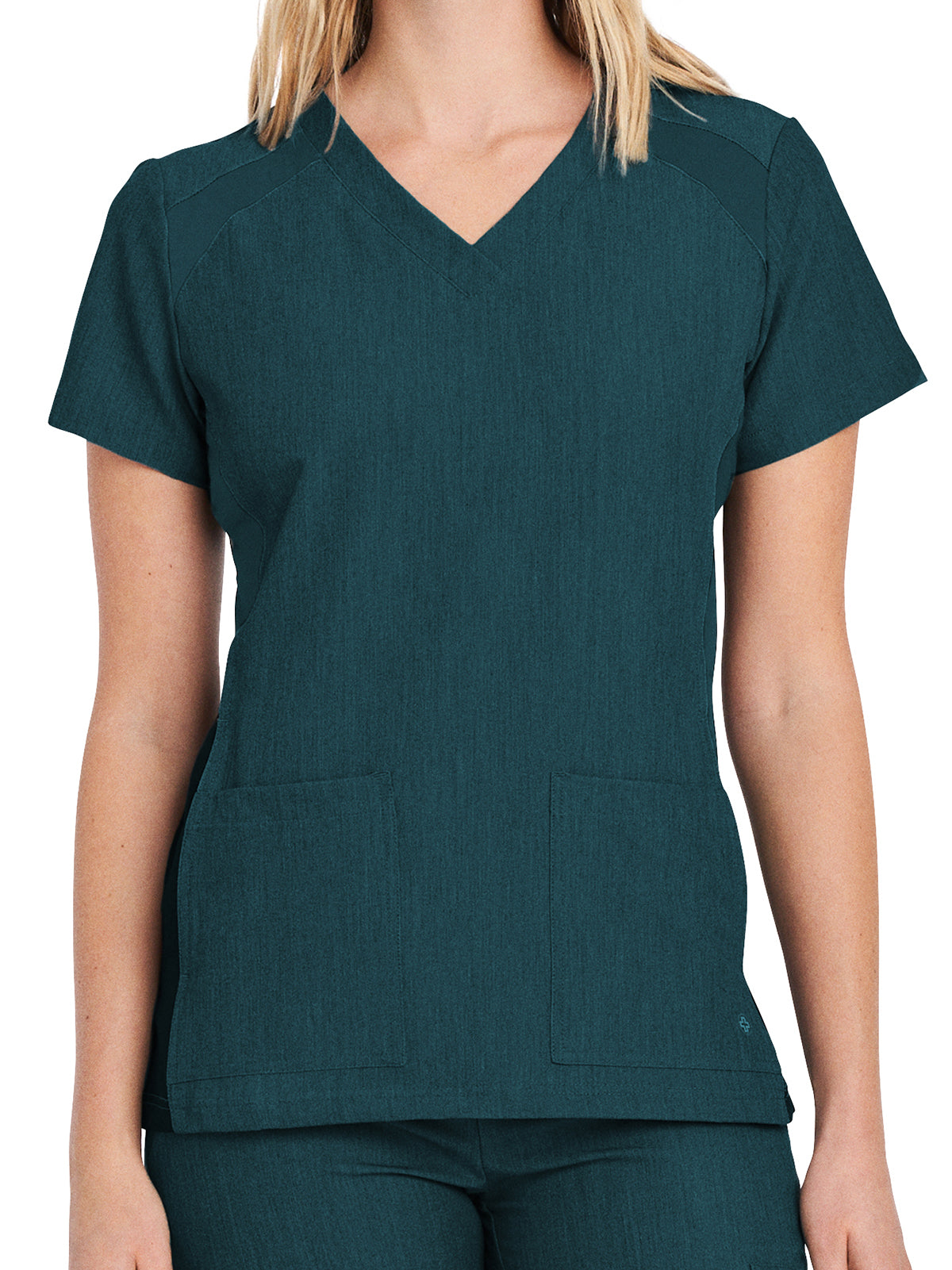At White Cross, we know that healthcare professionals are often called upon to be exceptional, which is why we make our garments exceptional too. The V-Tess women's 4-pocket V-neck scrub top is fade resistant and wrinkle resistant with a jersey-knit front and back yoke for ventilation. This top also has front and back princess seams for feminine shaping, side vents for extra ease of movement, and a super stretch.