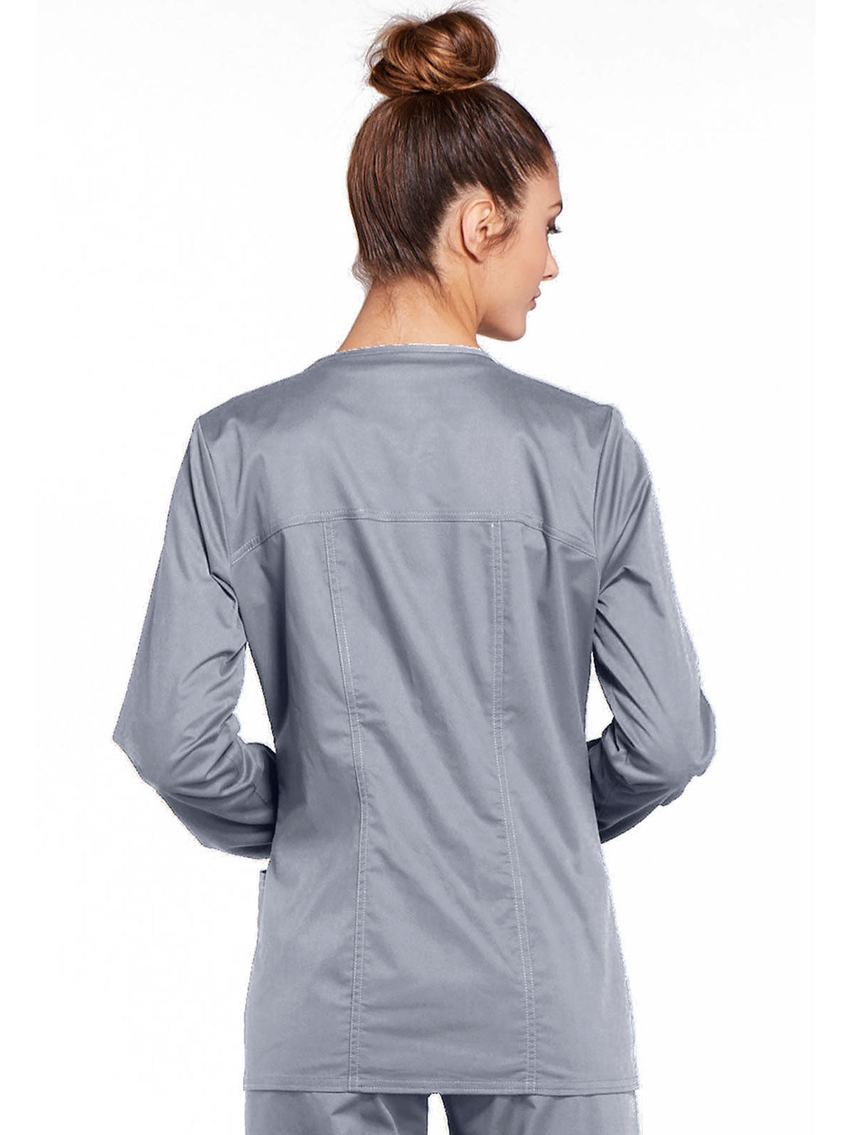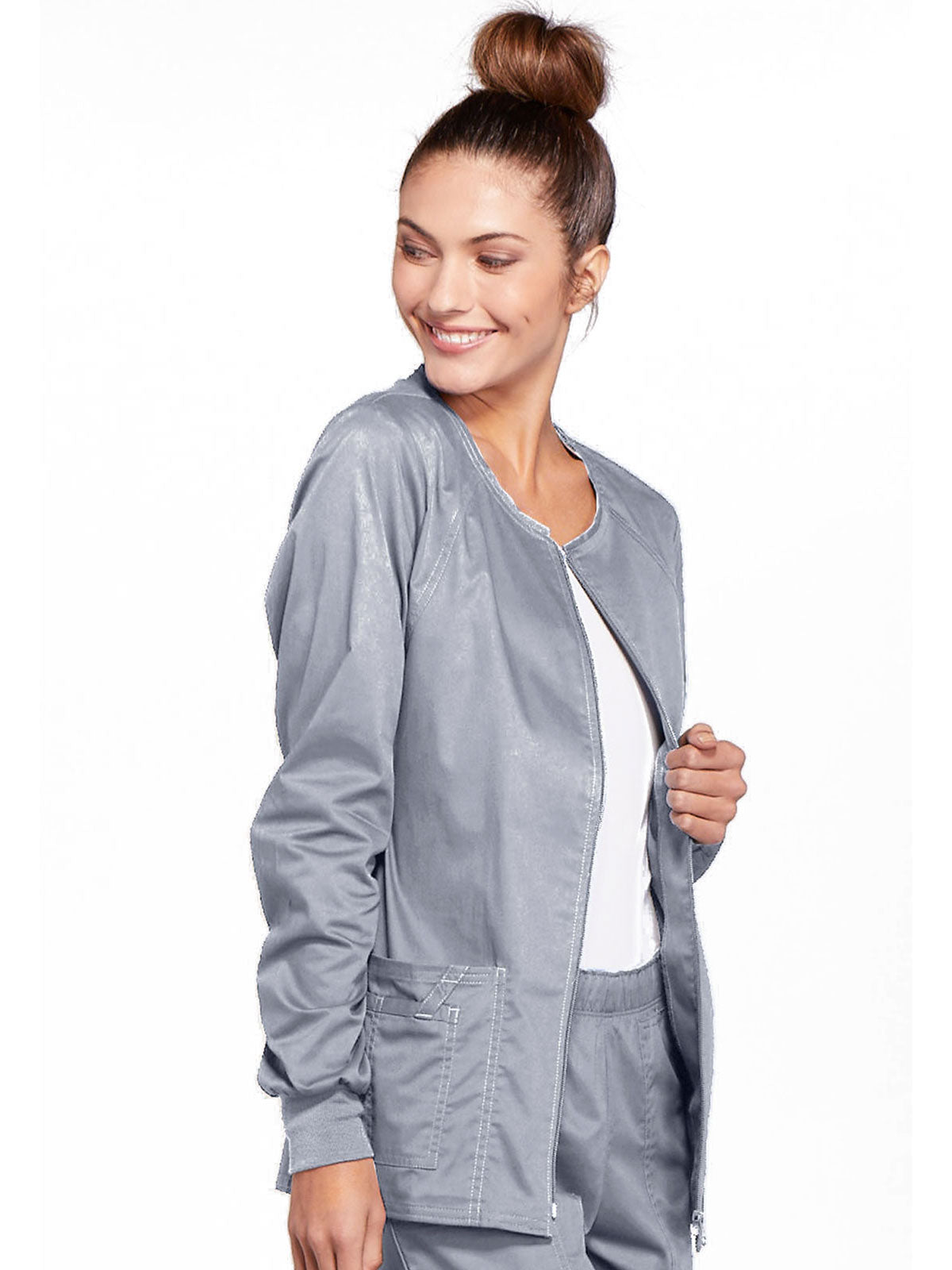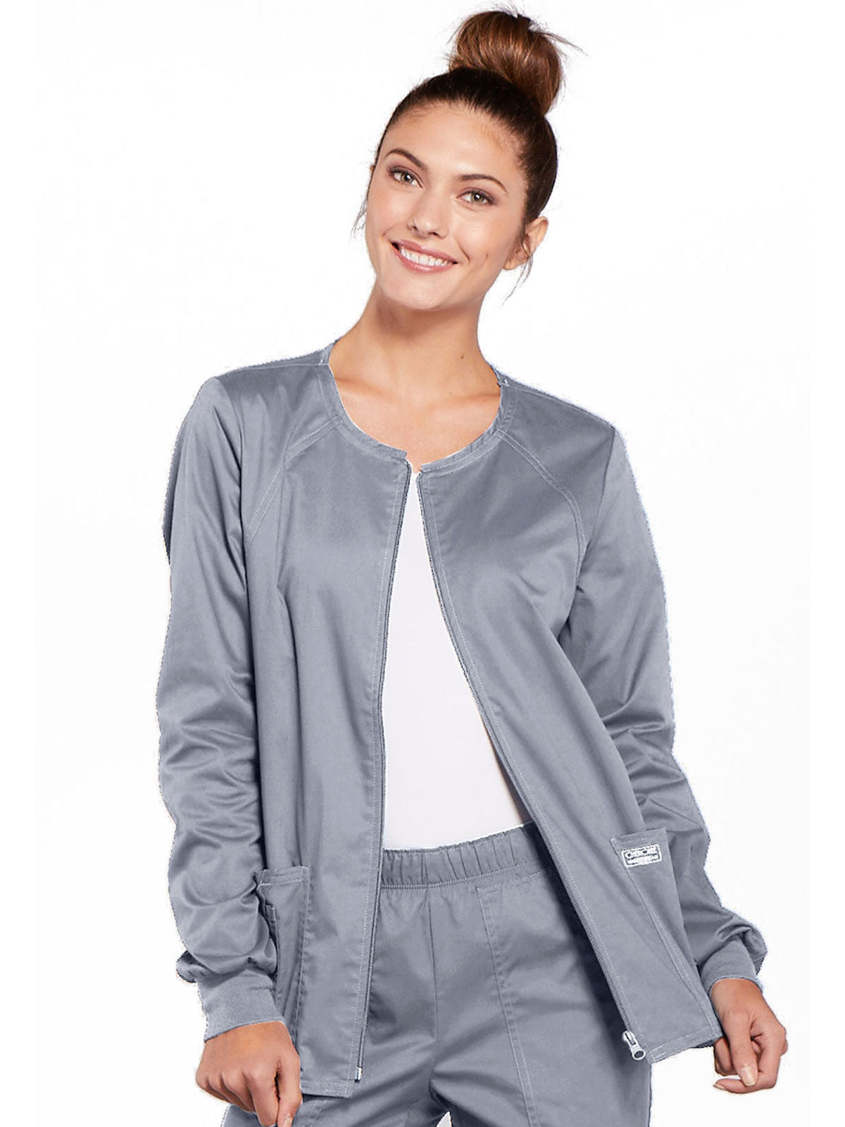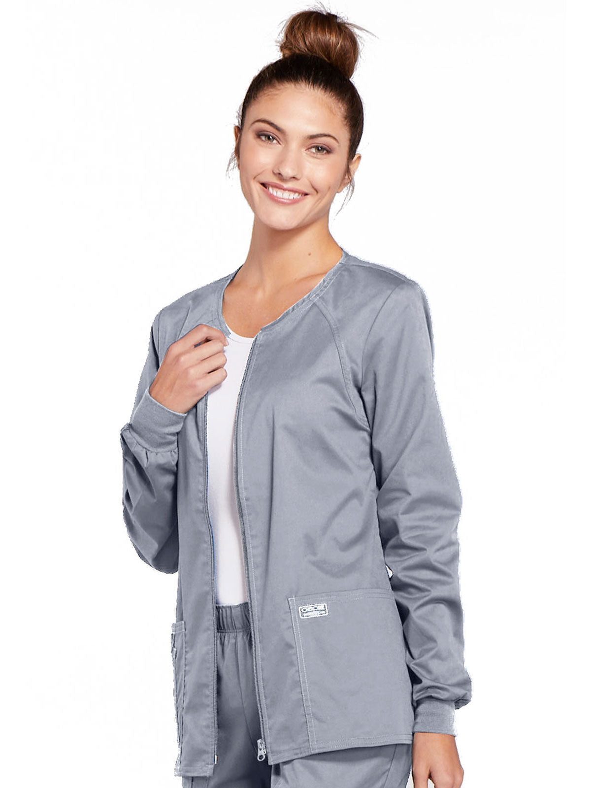 A Modern Classic fit round neck Cherokee workwear zip front jacket features two patch pockets, a right side pocket with a sectional pocket and I.D. loop, front shoulder yokes, back yoke, back princess seams for slimming fit, and matching knit cuffs. Center back length: 27".
