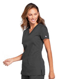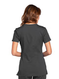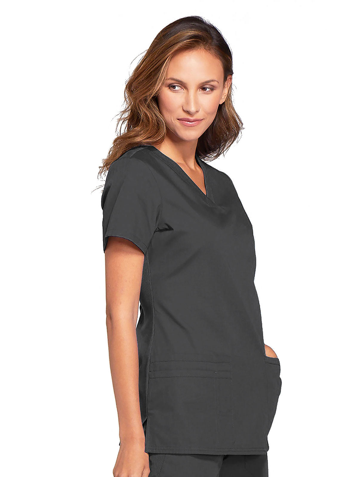 A Contemporary fit V-neck top features front patch pockets (the right with an exterior pocket and pen slot, the left with a hidden instrument loop), side vents and stretch rib-knit back panels for movement and extra comfort. Center back length: 27"