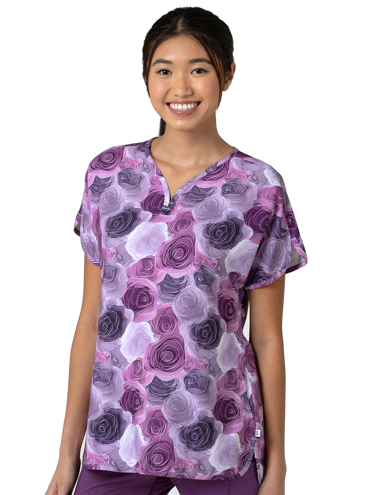 The Wink Women's Dolman Print Scrub Top is designed to let your unique personality shine, making those long shifts feel a little brighter. The Y-neck and sophisticated dolman sleeves with binding details add a touch of elegance to your everyday workwear.