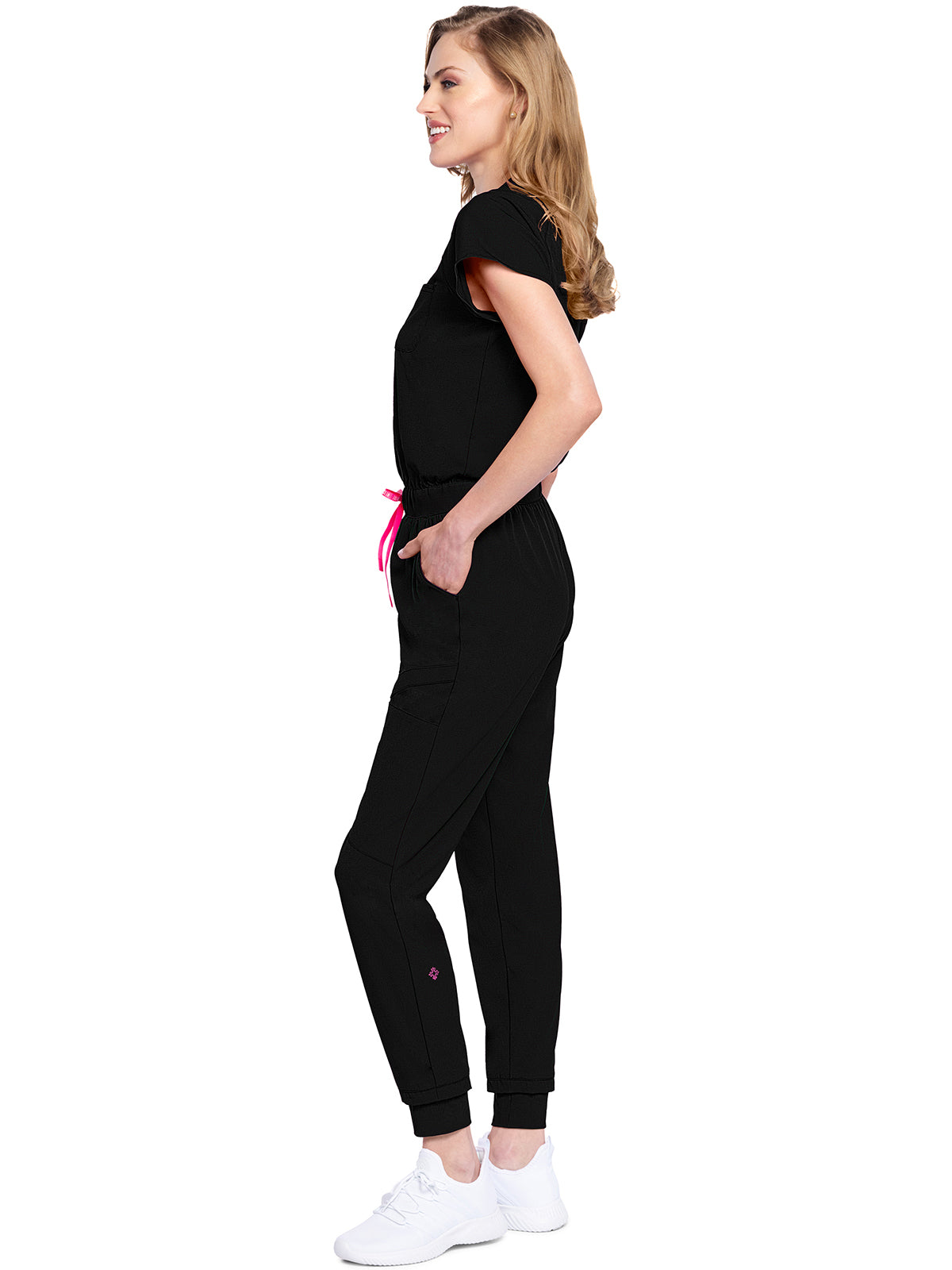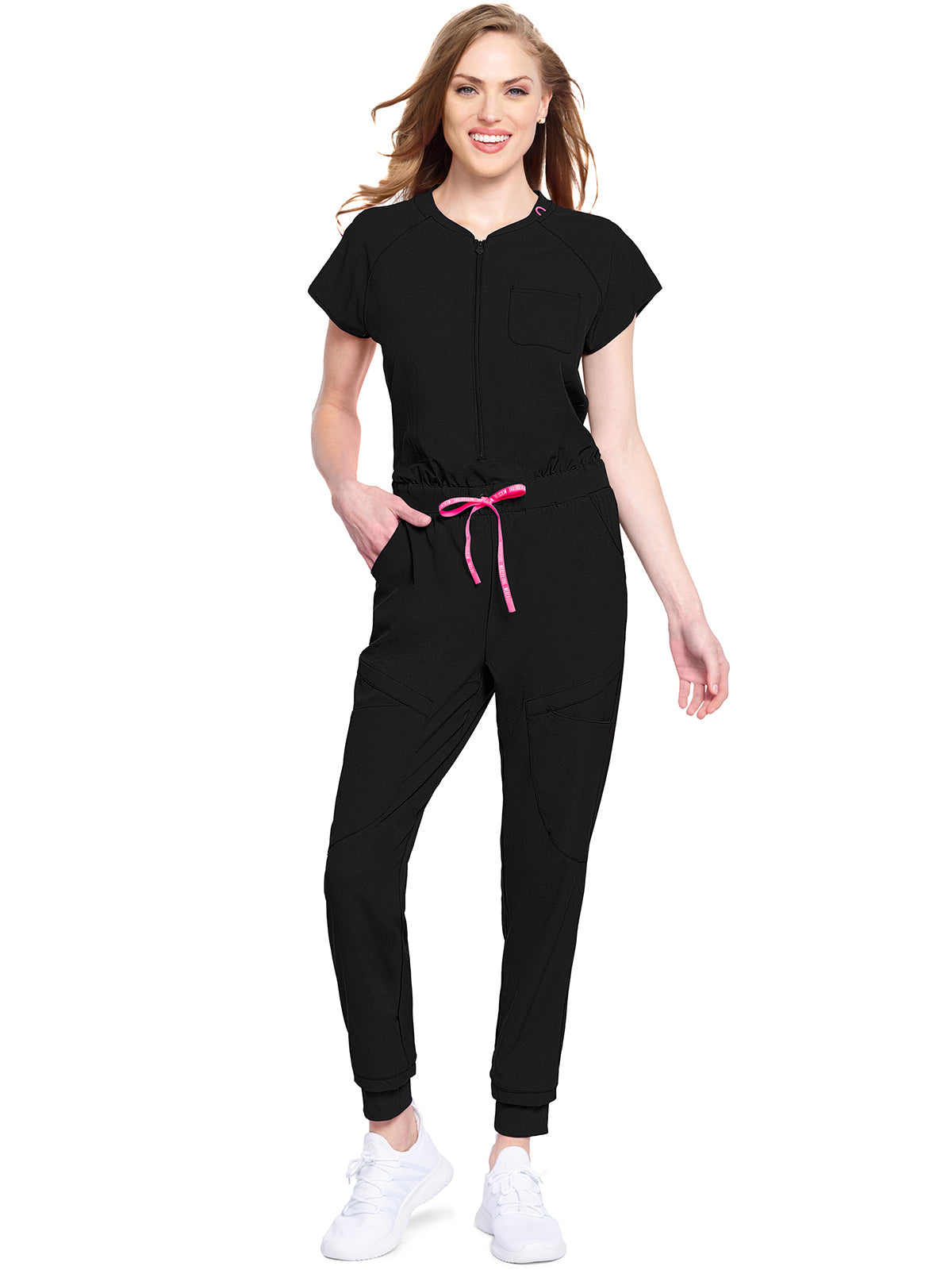 Top-to-bottom style in one fashionable piece. This Missy fit zip front jumpsuit features a shaped neckband with dyed-to-match rib-knit trim and a bungee ID badge loop. There are five pockets for organized storage: one chest patch pocket, two front pockets, and two cargo pockets. An elastic-reinforced rib-knit waistband with signature color logo drawstring provides security and adjustability. Dyed-to-match rib-knit storm cuff hem. Inseam: 29"