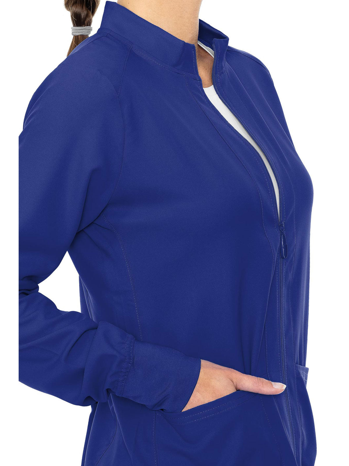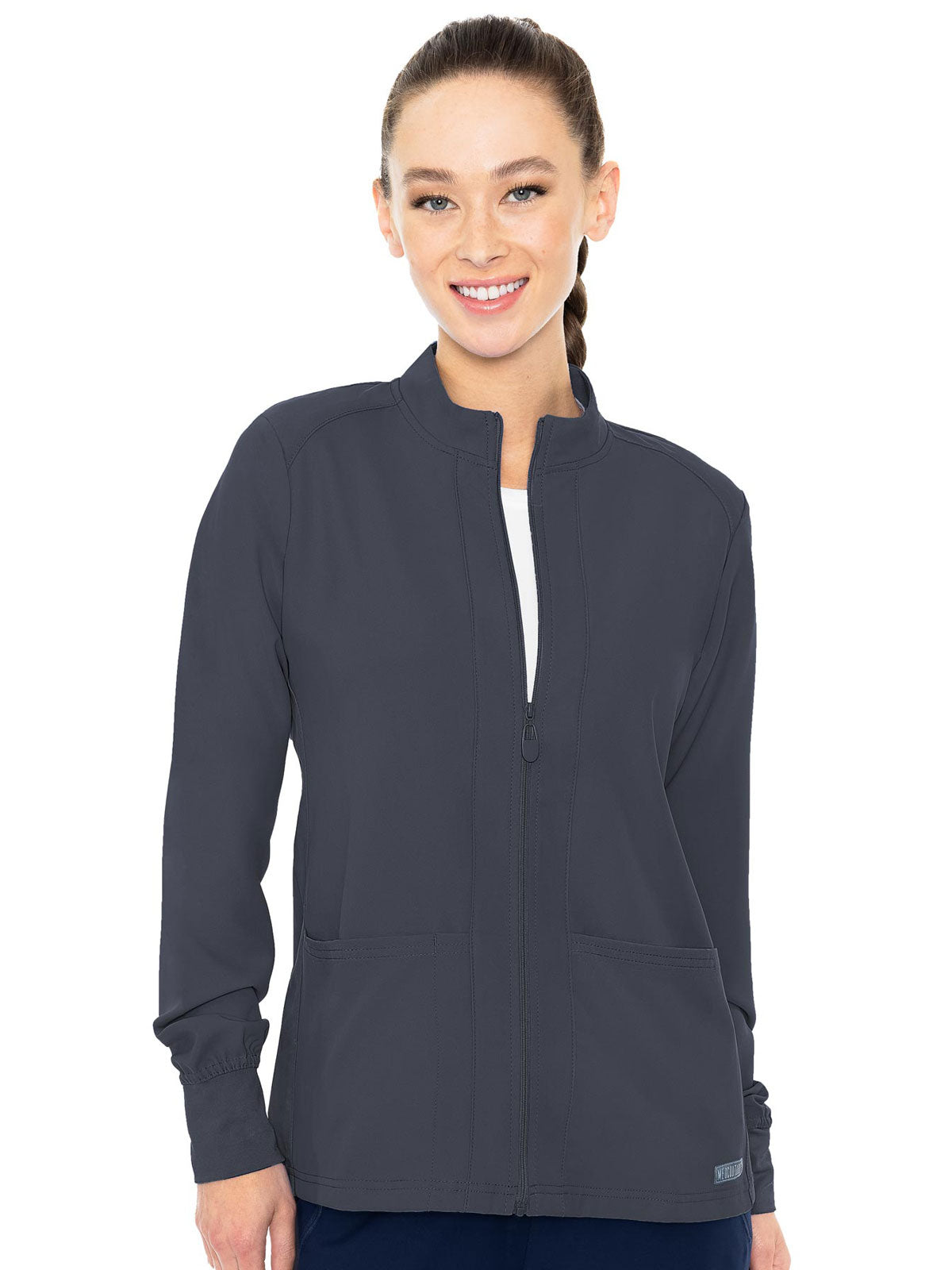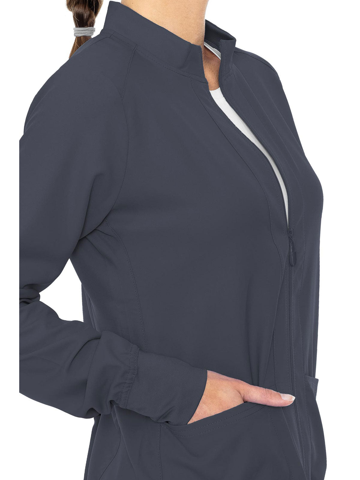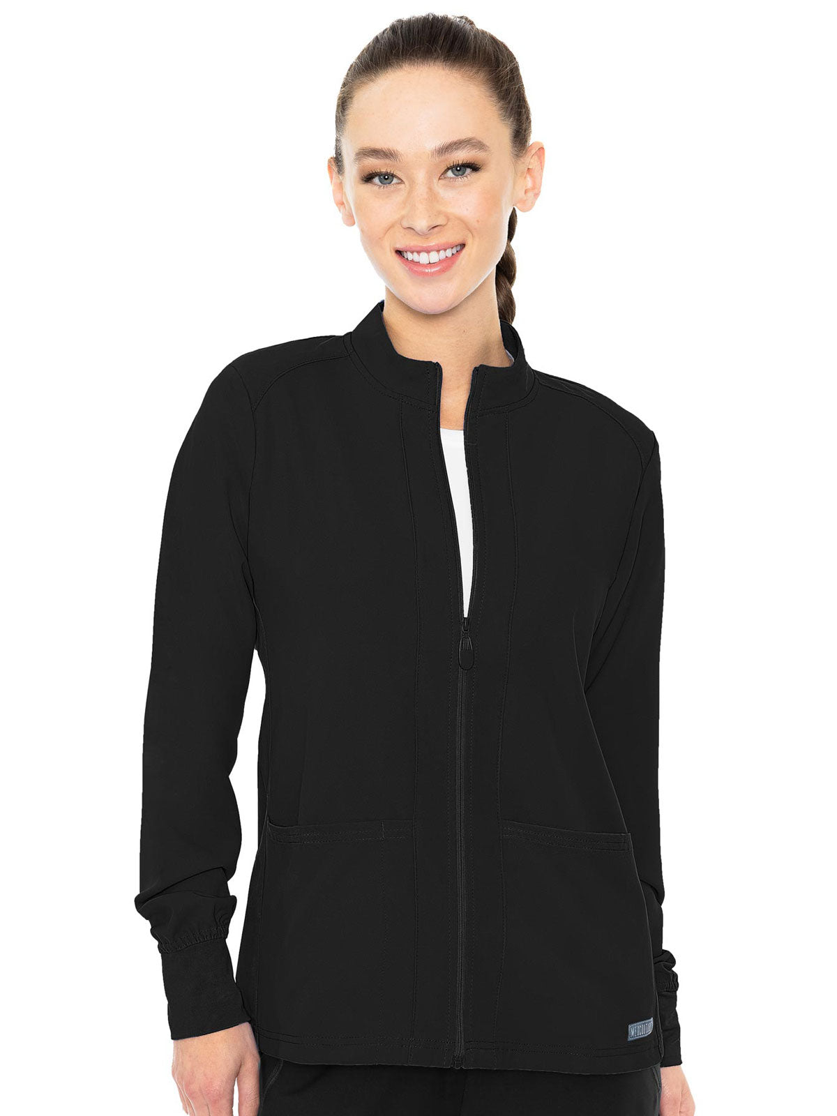 Youre always on. You need a sporty comfy warm up jacket thats not only inspired by activewear-but actively inspiring to wear. The soft knit cuffs and breathable fabric help you keep your cool and the pockets help you keep it all together. | Full zip front| Two patch pockets| One pen pocket| Insight Motion Fabric| R: XS-5X (26in.)