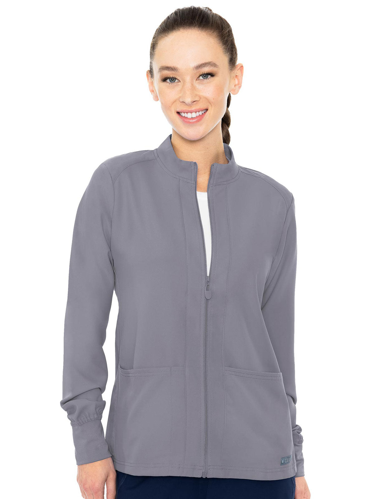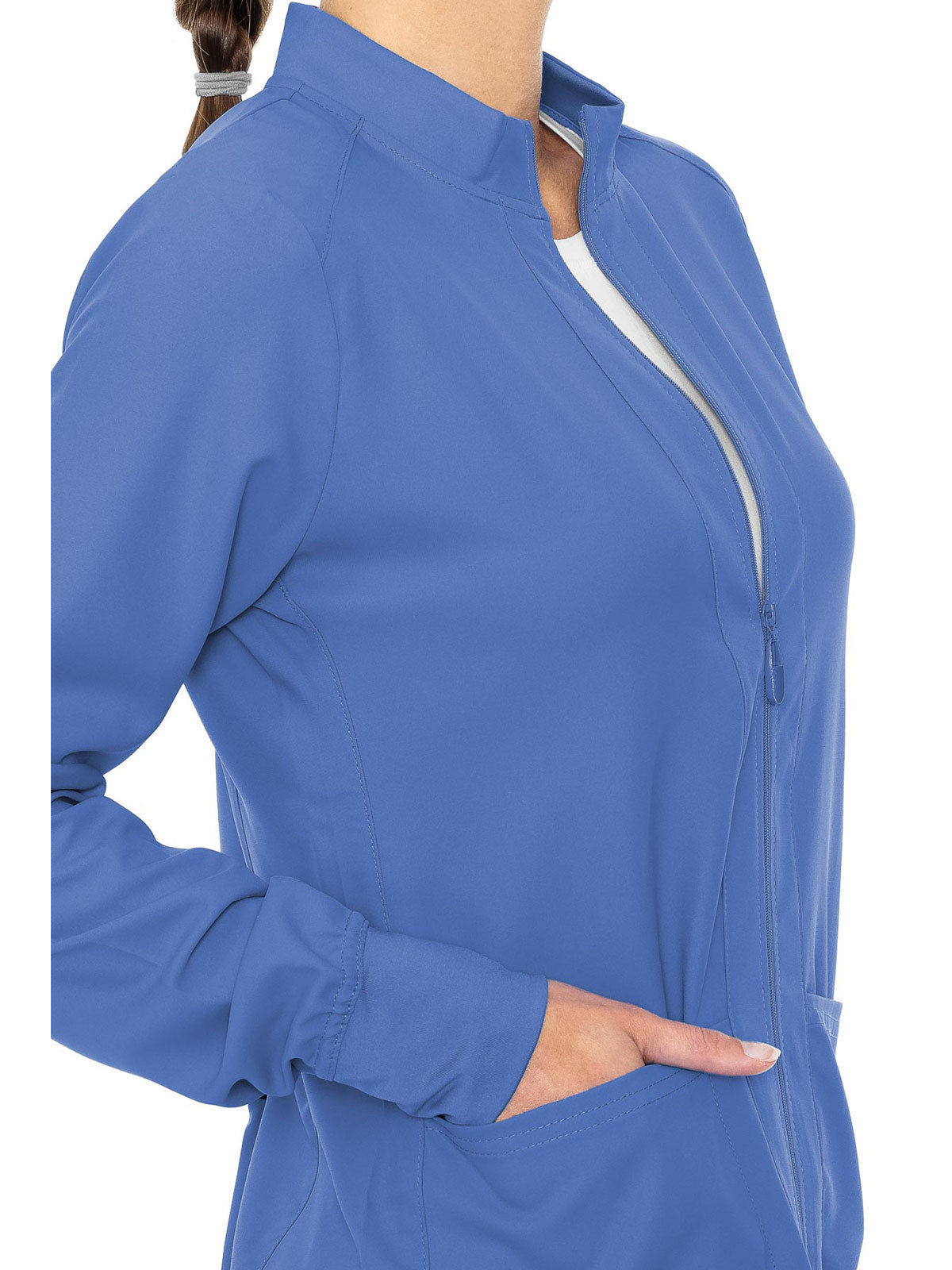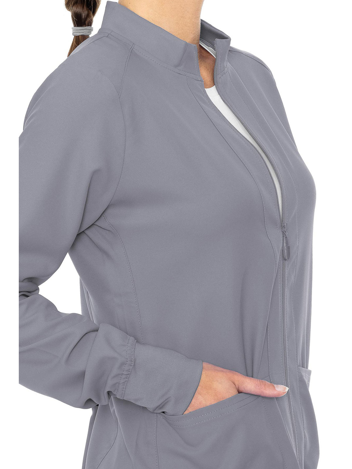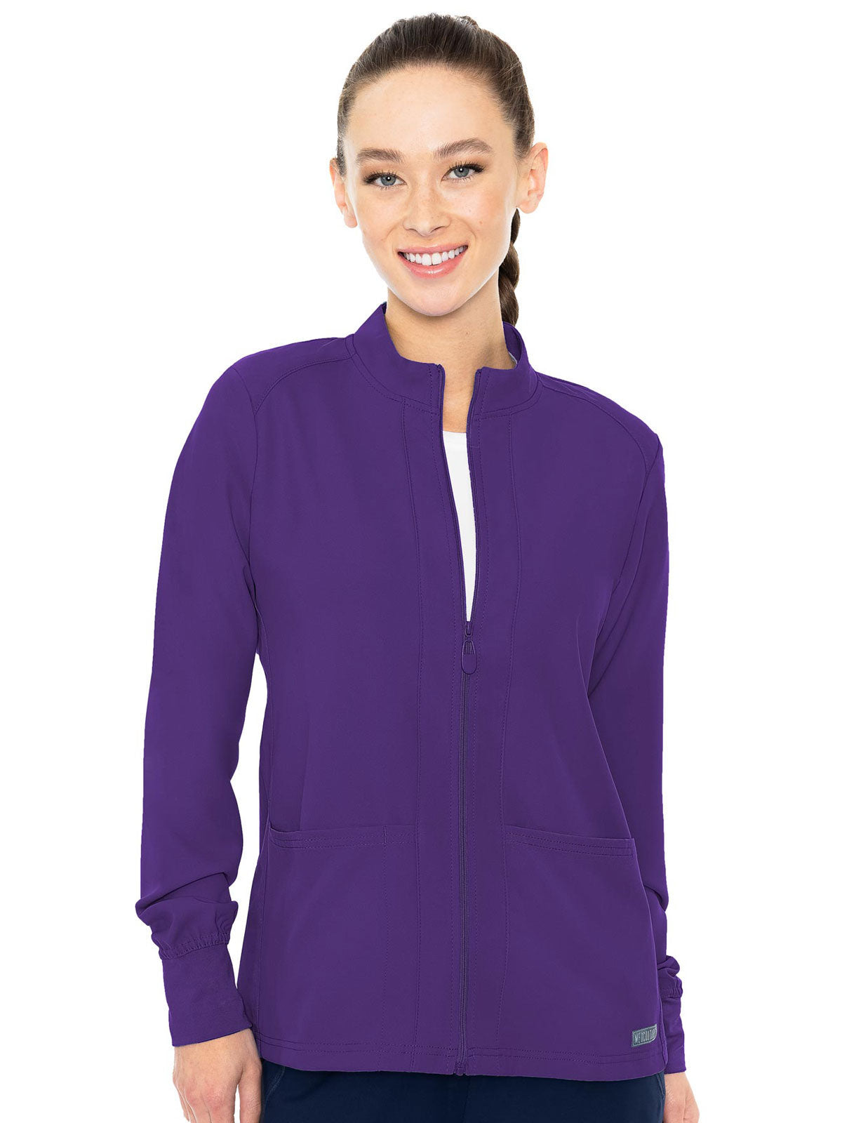 Youre always on. You need a sporty comfy warm up jacket thats not only inspired by activewear-but actively inspiring to wear. The soft knit cuffs and breathable fabric help you keep your cool and the pockets help you keep it all together. | Full zip front| Two patch pockets| One pen pocket| Insight Motion Fabric| R: XS-5X (26in.)