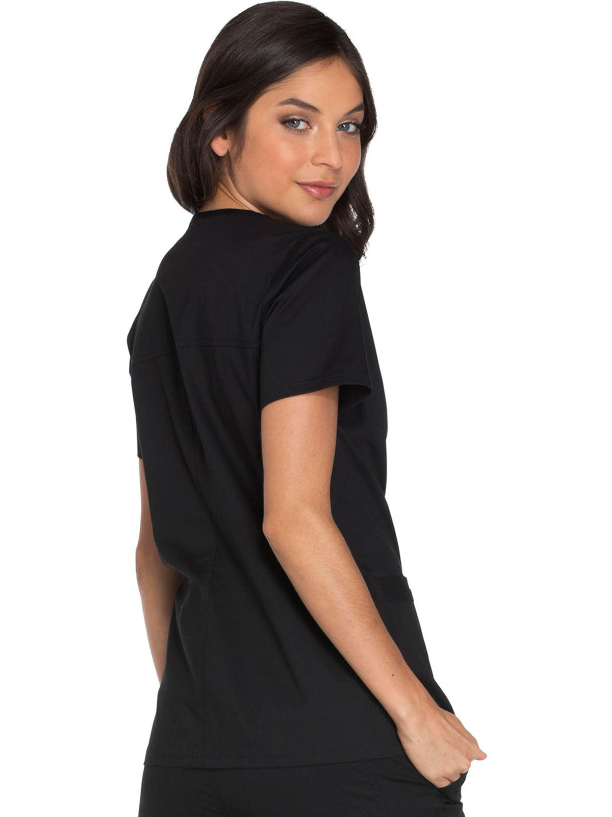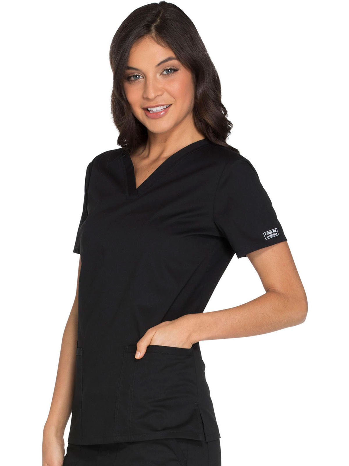 A Modern Classic fit cherokee core stretch scrub V-neck top features two patch pockets (the right with an interior pocket, the left with a pen slot and hidden instrument loop), bungee ID badge loop at the neckline, a back yoke and side vents. Center back length: 26"_x000D_