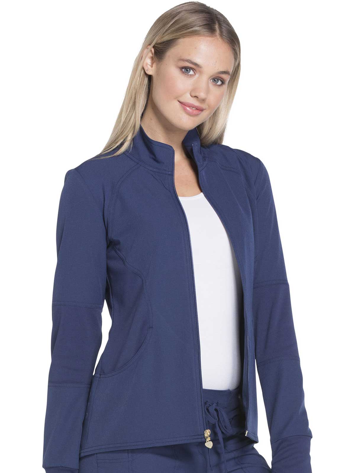 A Contemporary fit, zip front warm-up jacket has rib knit side panels, elbow panels and cuffs. Also featured are front pockets; front and back princess seams; and signature woven neck tape, triple-heart heat transfer and heart grommet detail. Center back length: 27"