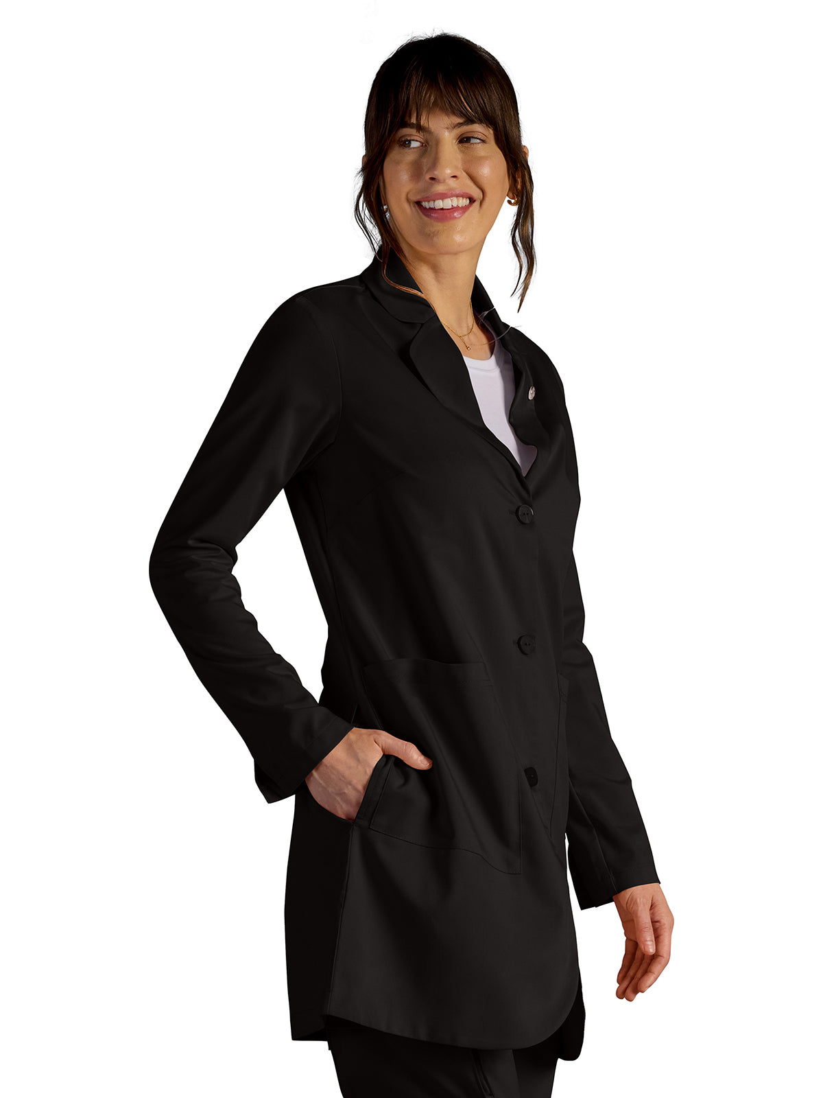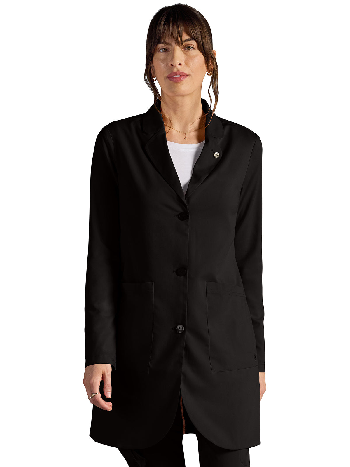The Modern fit Vera lab coat from Healing Hands x Dr. Kwane features a three-button closure with a rounded notch collar and rounded hem. Healing Hands logo buttons add a sophisticated touch. There are five pockets for organized storage: two front patch pockets, one hidden cell pocket, and two inside welt pockets. A back yoke provides a better fit across the shoulder while a back kick pleat gives more freedom of movement for longer strides and hurrying from appointment to appointment. There are front bust darts and back darts for fit and shaping. Side entry slits provide easy access to pants pockets. Signature Healing Hands lapel pin. Center back length: 34"