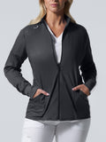 Stay warm and comfy in this sporty jacket. Its Modern Fit, has front and back princess seams, rib knit cuff sleeves, mock neck collar, an ID badge loop, and 3 pockets. Perfect for home to office wear.