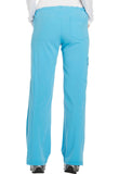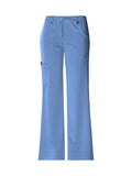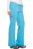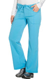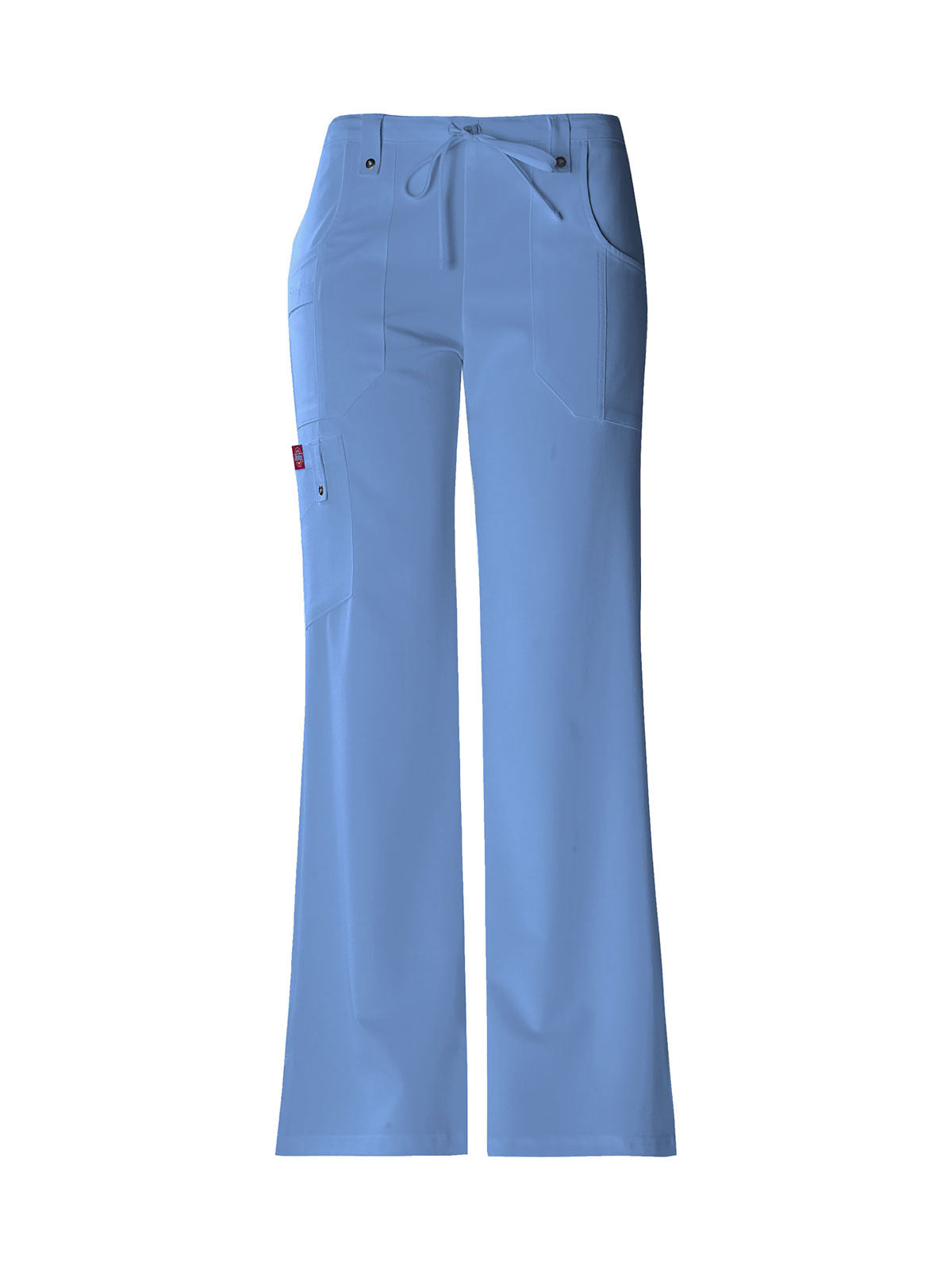 A Contemporary fit, mid rise, moderate flare leg pant features an adjustable drawstring with full elastic waist, and belt loops with decorative logo eyelet detail. Also featured are two patch pockets with pen slots on the right pocket, and a cargo pocket with self loops and logo eyelet. A back leg seam gives a flattering shape, and a back pocket and side vents complete the look. Inseam: 33 1/2".