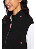 A Contemporary zip front vest features four patch pockets, knit side panels, removable hoodie, dotted-heart heat transfer and bungee instrument loops. Center back length: 25"