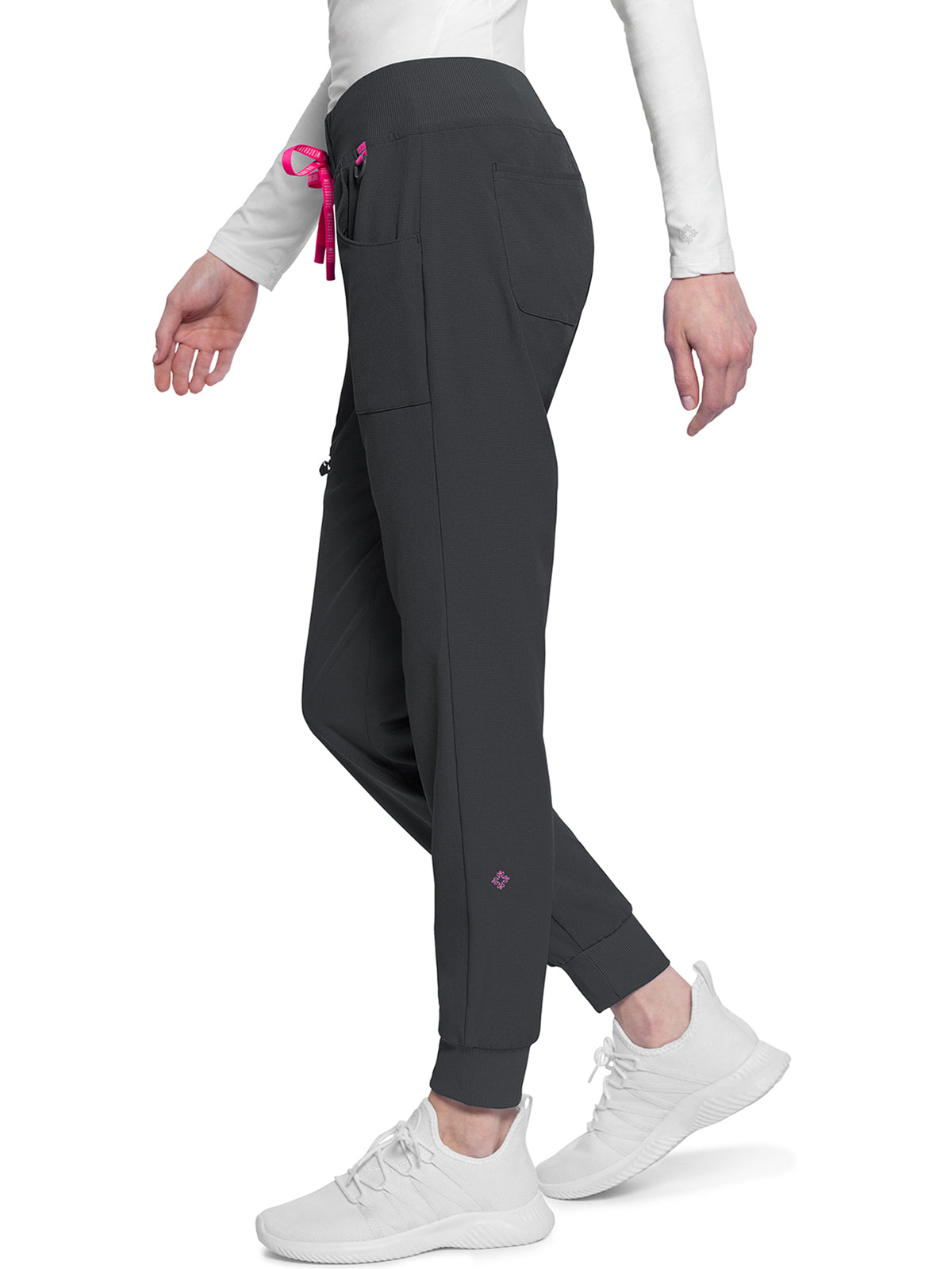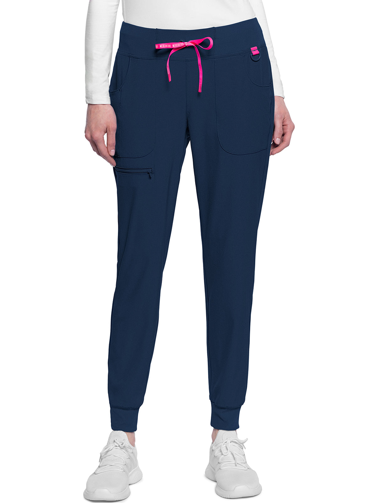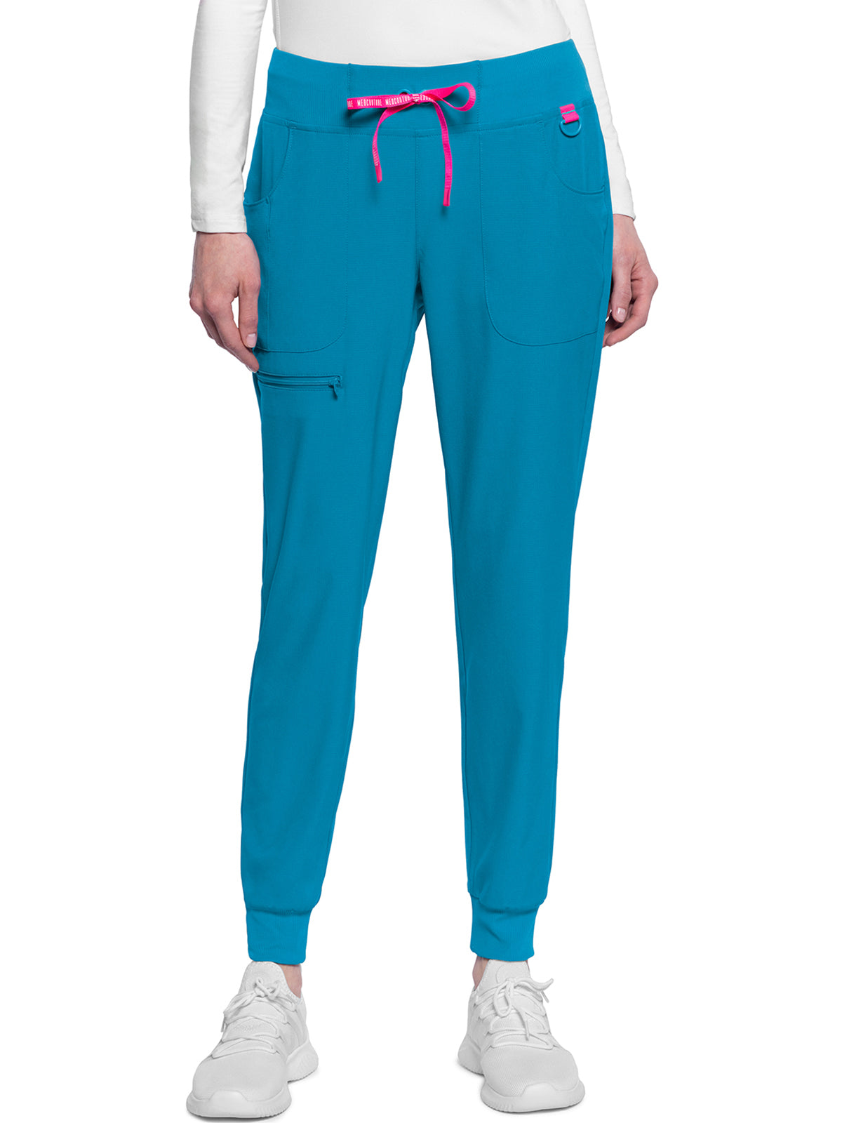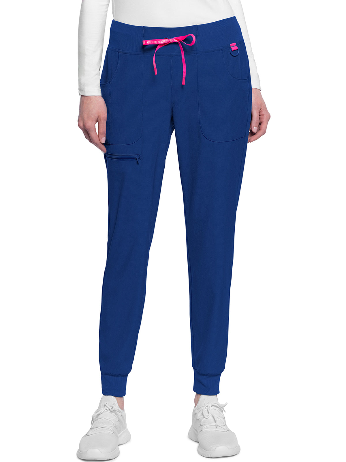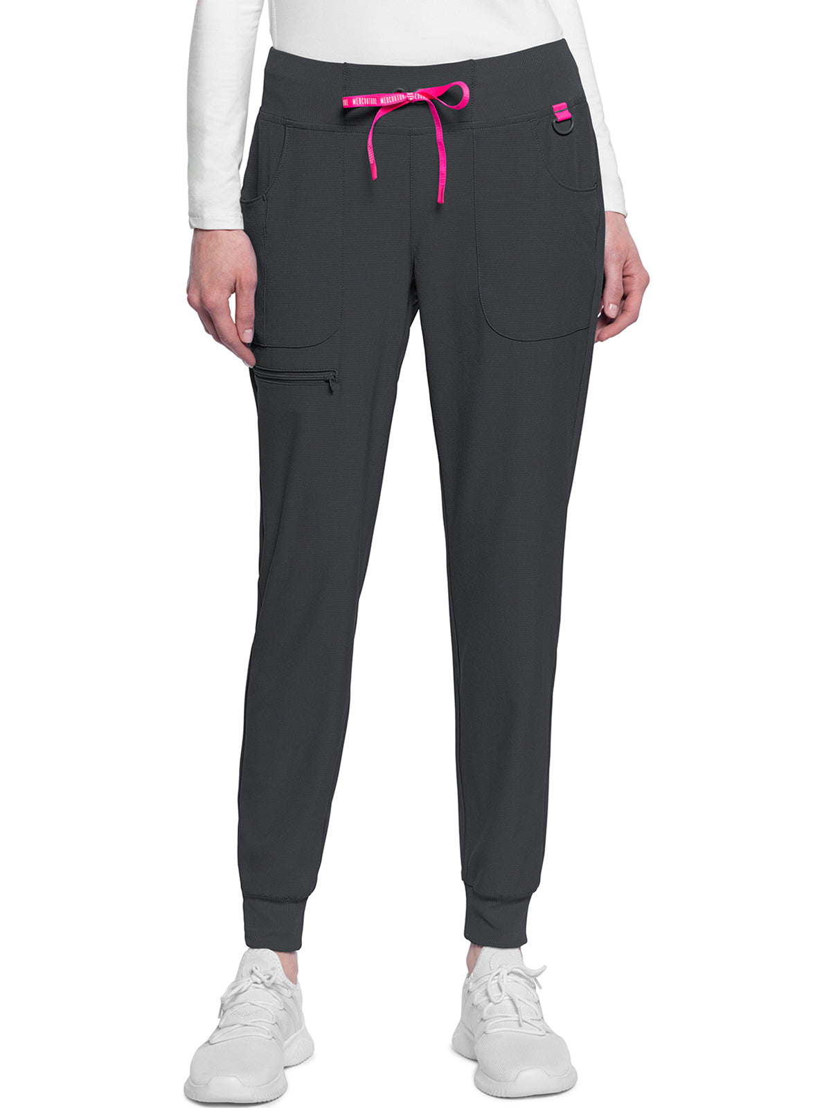 This Missy fit mid rise jogger features a rib-knit covered elastic reinforced waistband with signature color logo drawstring. There is a d-ring at the waistband and a locker loop at the center back waist. There are five pockets for organized storage: two front pockets (right with pen/instrument slot), one zipper cargo pocket, and two back patch pockets. Dyed-to-match rib-knit cuffs complete this jogger pant. Tapered jogger leg, 8 5/8" leg opening. Inseam: 29"