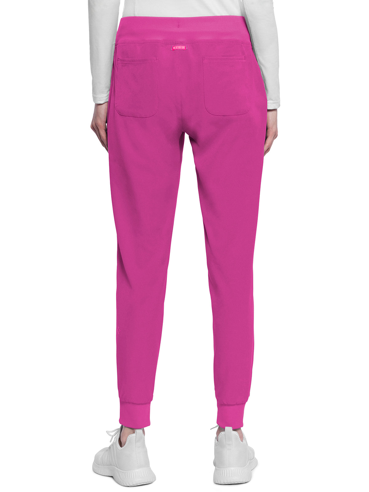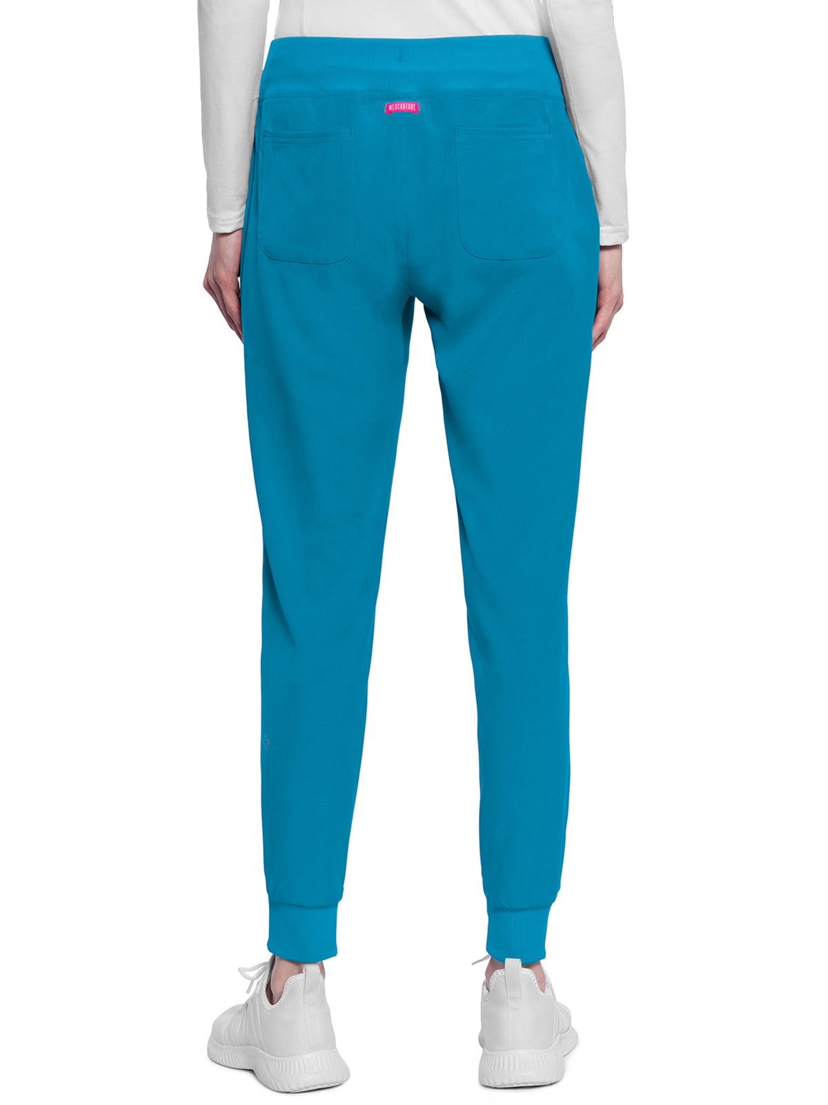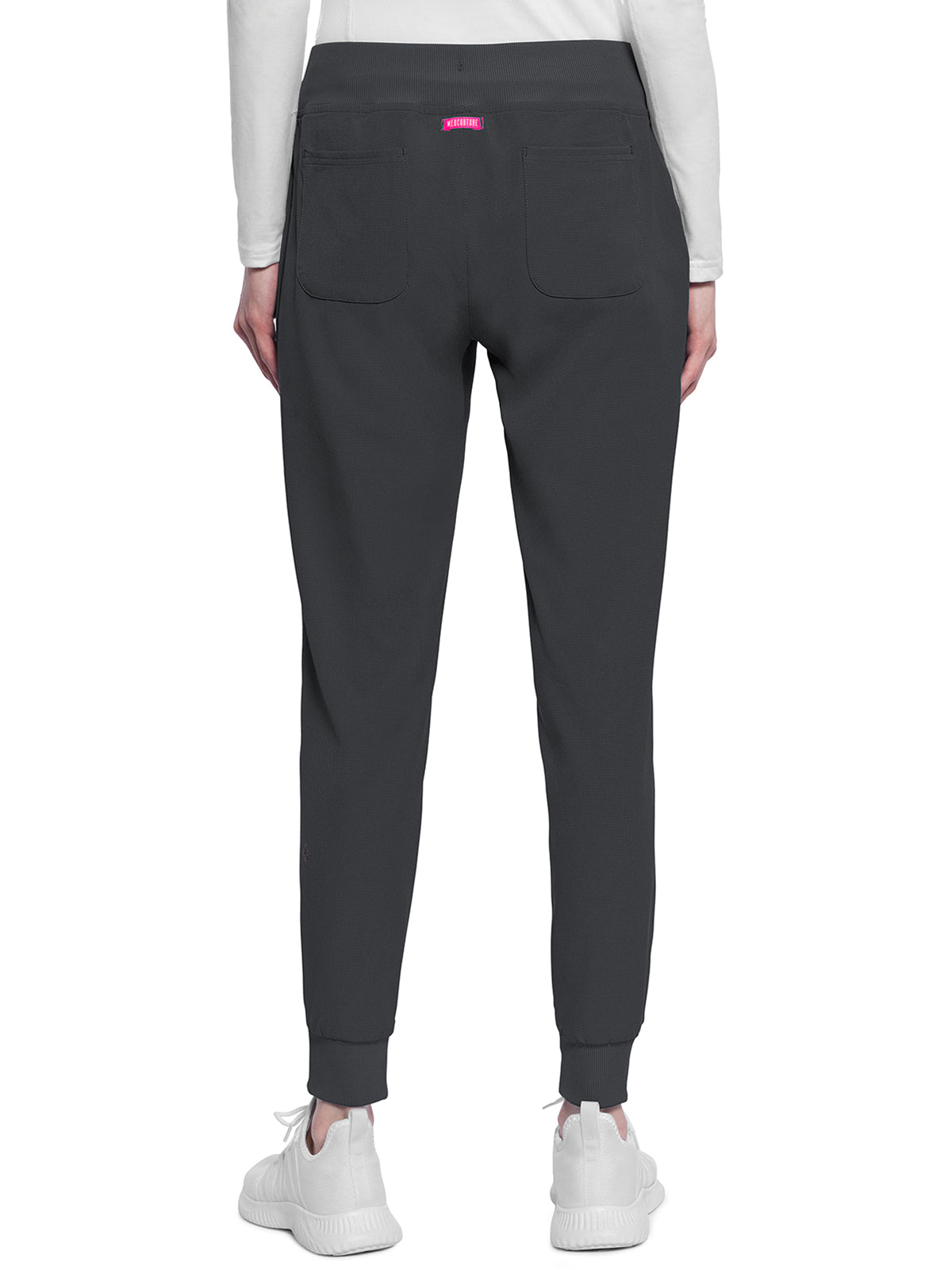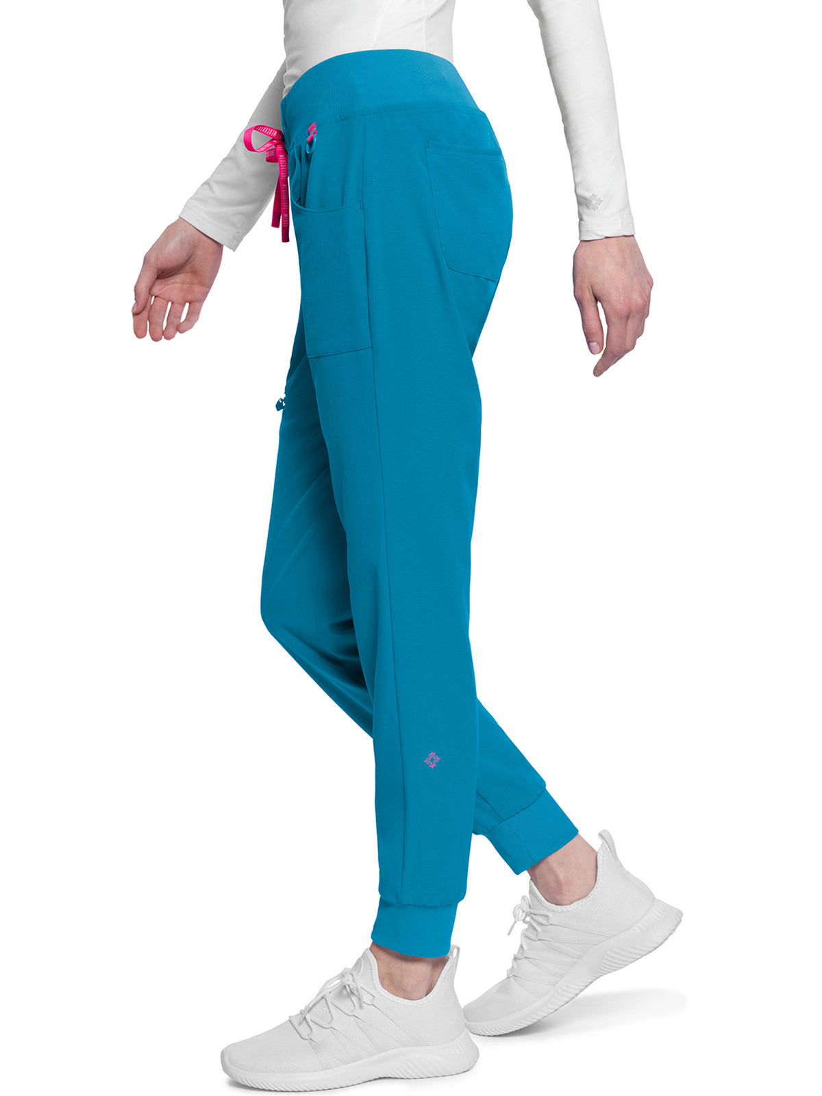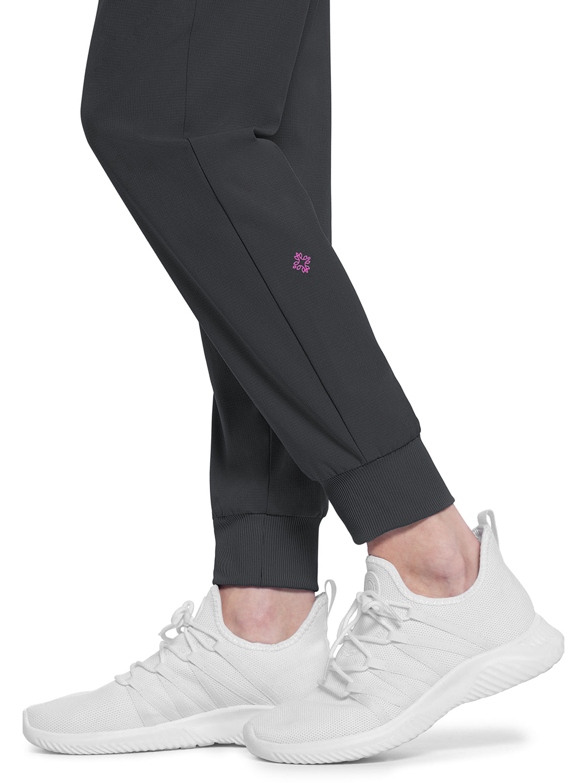 This Missy fit mid rise jogger features a rib-knit covered elastic reinforced waistband with signature color logo drawstring. There is a d-ring at the waistband and a locker loop at the center back waist. There are five pockets for organized storage: two front pockets (right with pen/instrument slot), one zipper cargo pocket, and two back patch pockets. Dyed-to-match rib-knit cuffs complete this jogger pant. Tapered jogger leg, 8 5/8" leg opening. Inseam: 29"