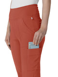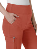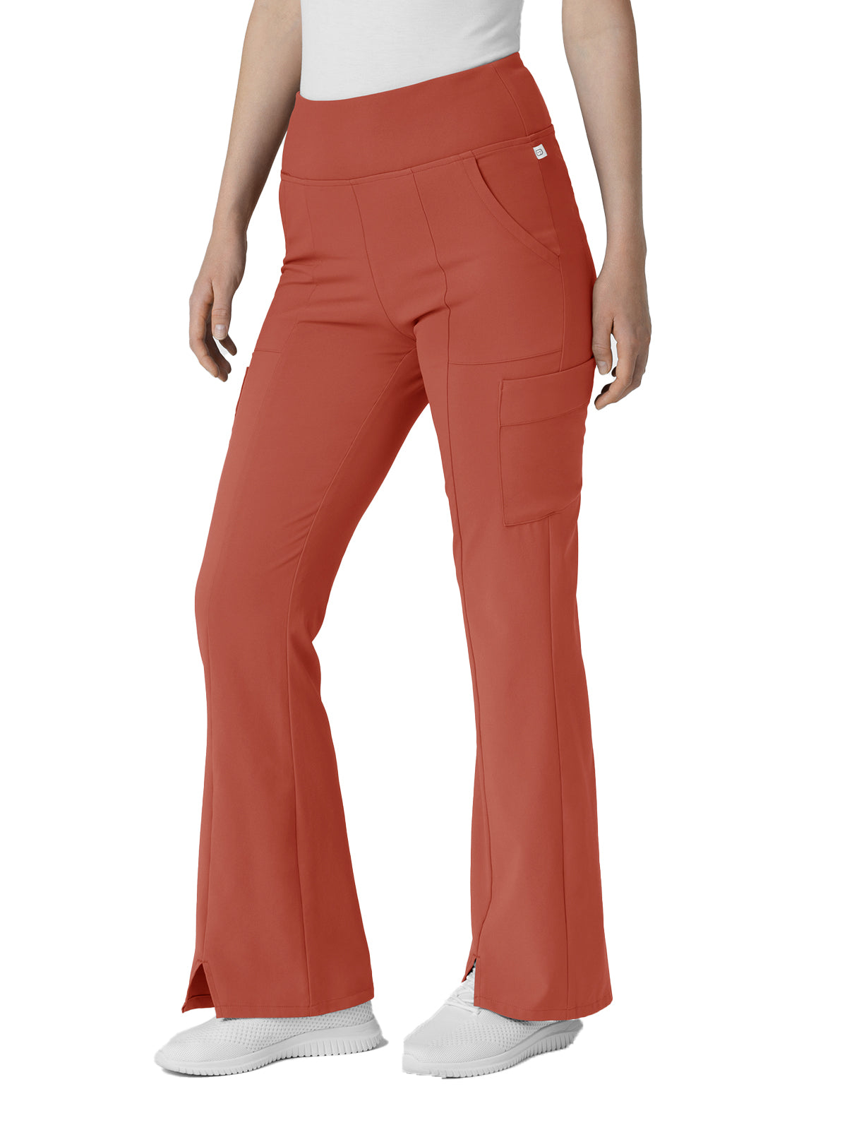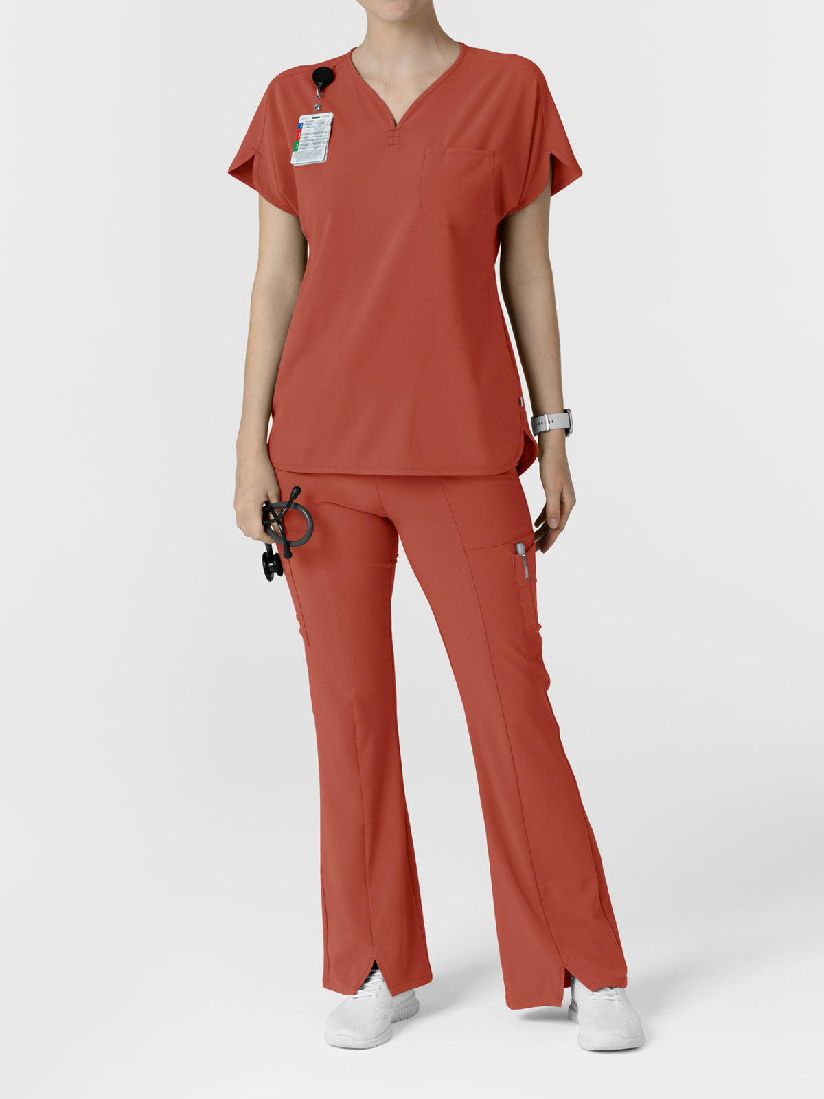 Your job is a daily adventure, and the Wink Women's Front Slit Flare Scrub pant is your perfect companion. Crafted from a polyester blend that allows effortless movement, they combine comfort and style effortlessly. Featuring fashionable flared legs and a front notch at the hem, these pants add a touch of trendiness to your work wardrobe. The knit waistband, reminiscent of your favorite yoga pants, offers exceptional comfort and features a badge loop and a hidden card pocket for your convenience. You'll find ample storage with two top-loading cargo pockets, two front pockets, and two back pockets with our Pocket Mate zipper pocket, keeping your essentials within reach. Plus, you can feel good about your choice, as these scrub pants are made from an environmentally and sustainable-friendly poly-blend fabric. Embrace the challenge of your profession in style and comfort with these Front Slit Flare Scrub Pants.