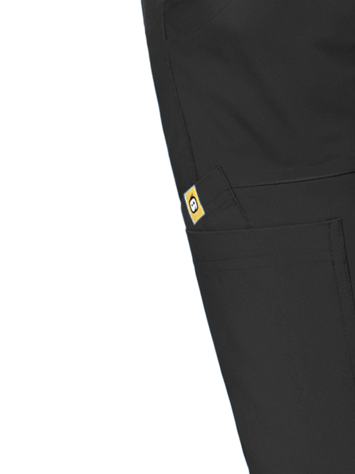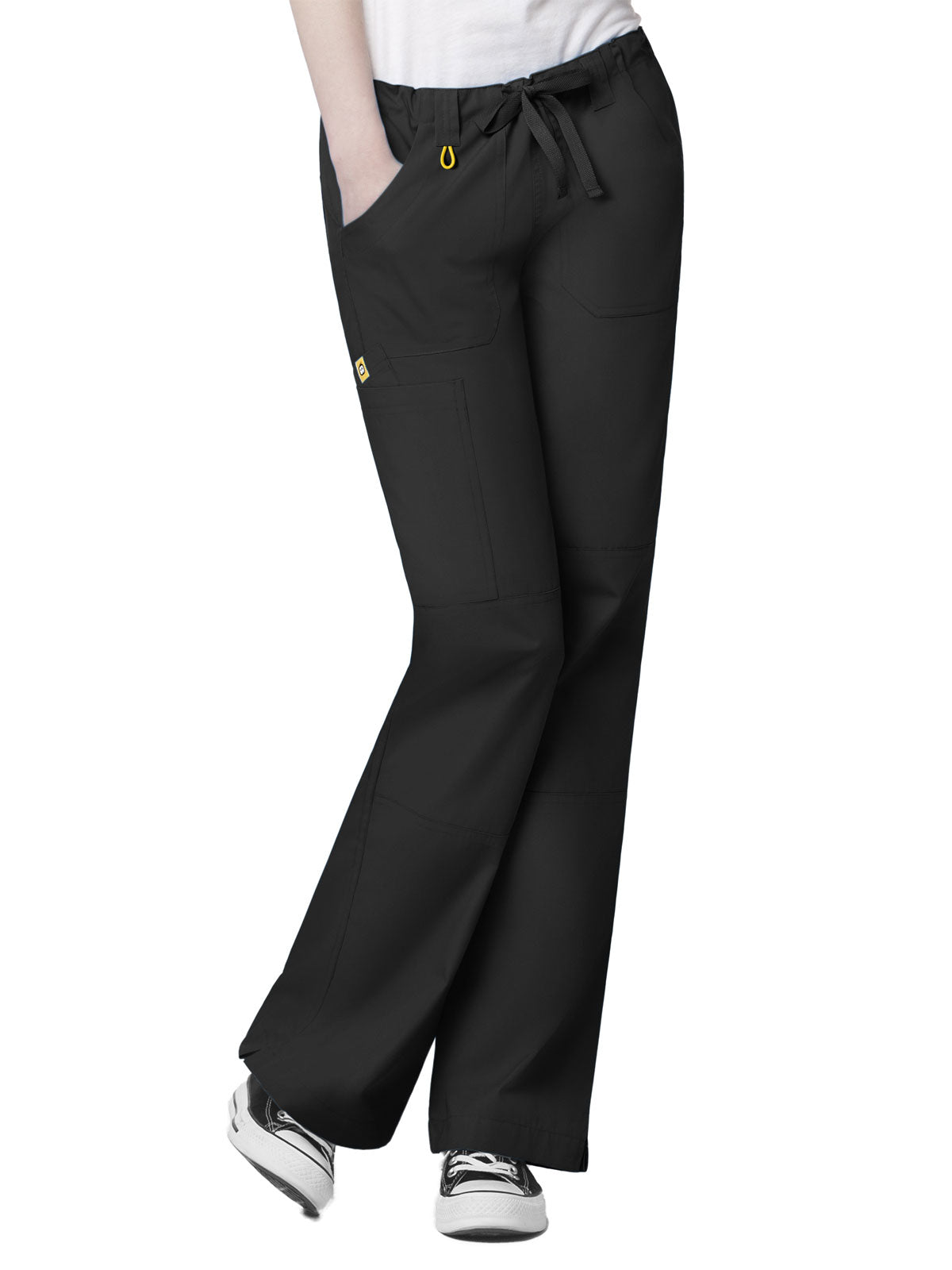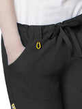 WonderWink Fit and True-Plus Fit Flat front full elastic waist with inside webbed drawstring 2 front slant pockets 2 stylized cargo pockets and cell phone pocket 2 back pockets with pen slot Utility loop at waist Bottom vents Available Size...
