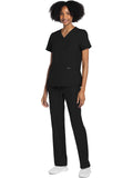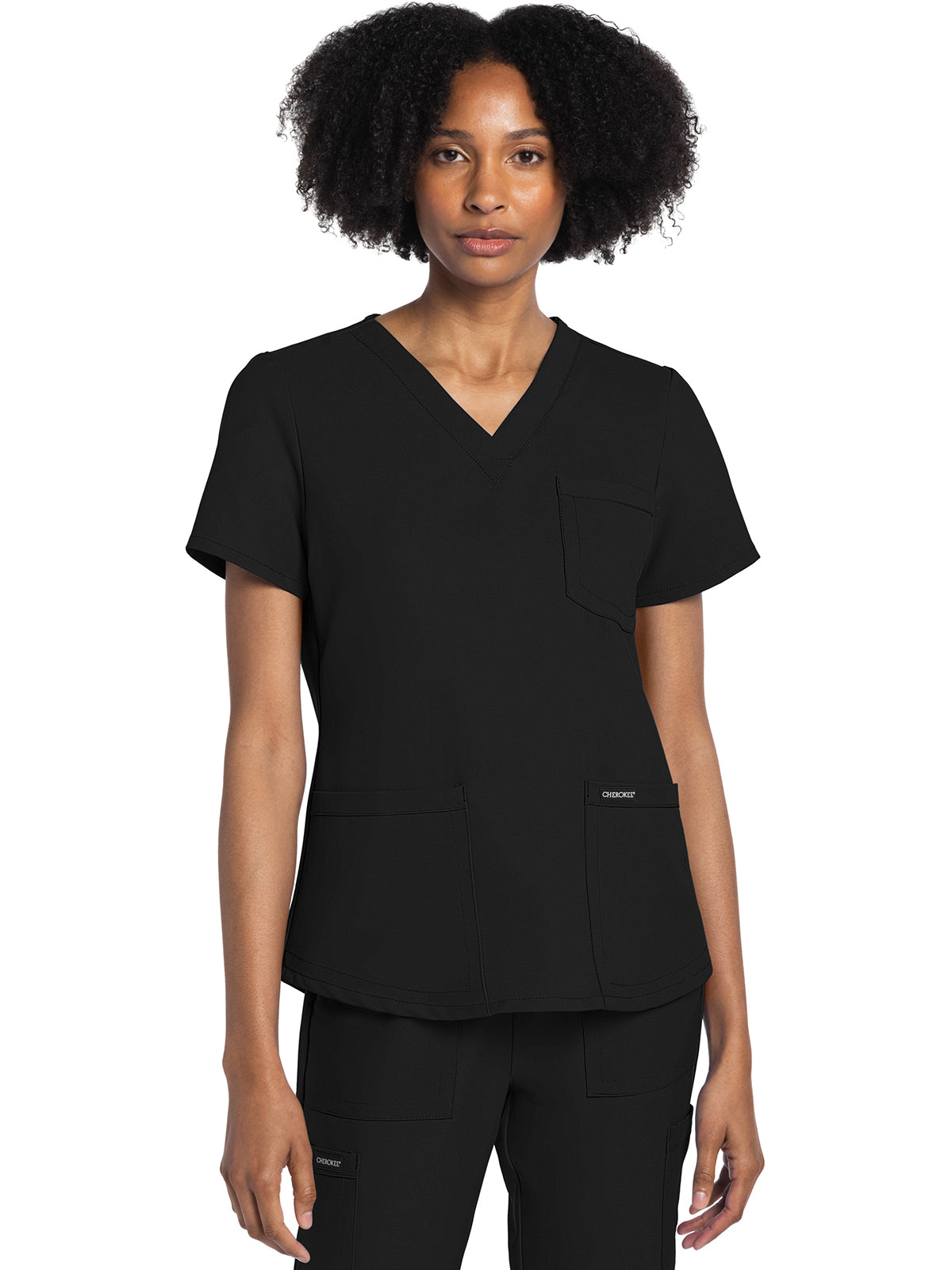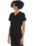 A v-neck top with shirttail hem elevates this style beyond a basic v-neck. There are a total of three pockets with reverse hem trim: a chest patch pocket and two roomy patch pockets. Decorative tonal topstitching adds the finishing touch to this scrub top. Modern Classic fit. Center back length: 26"