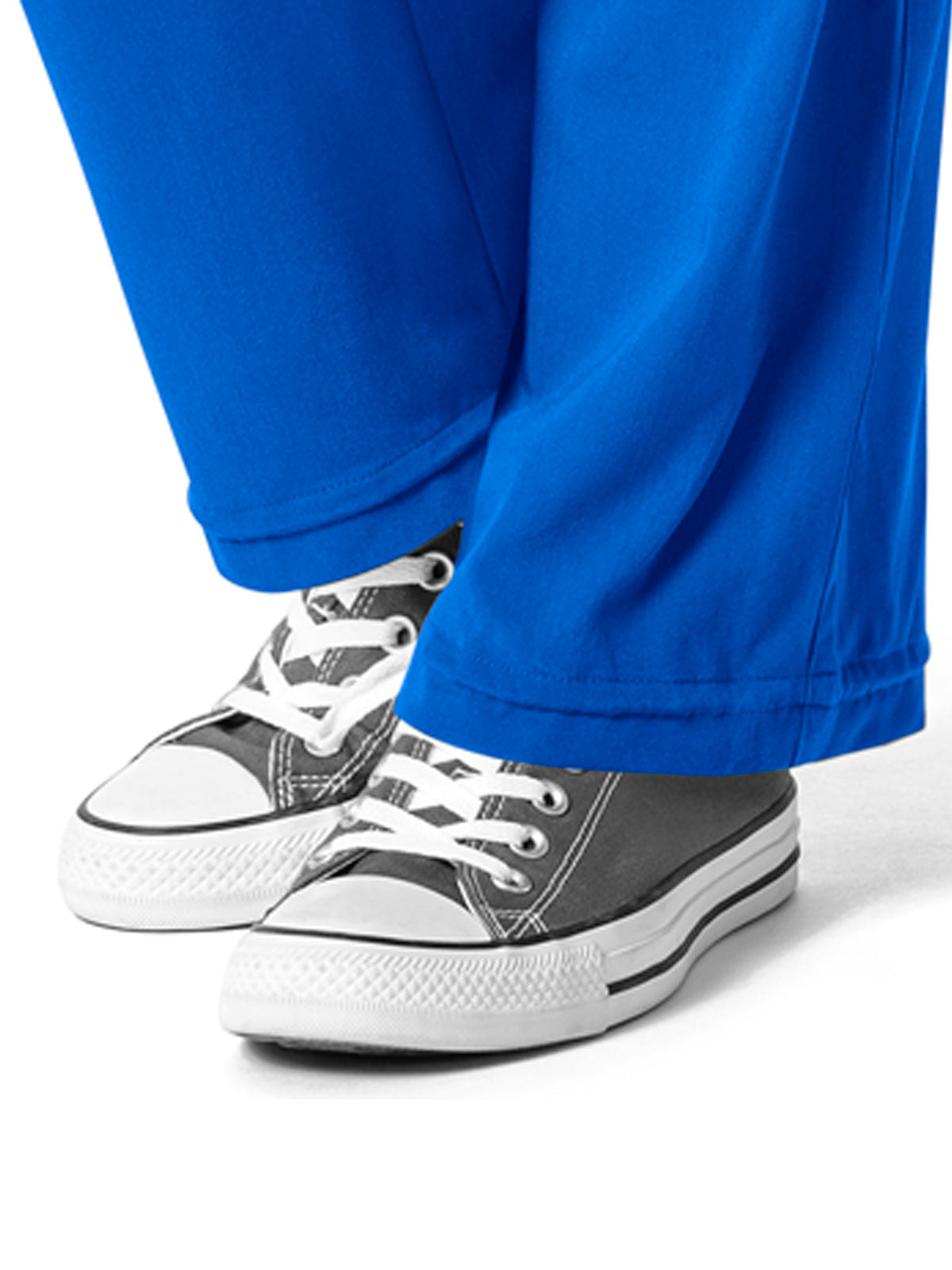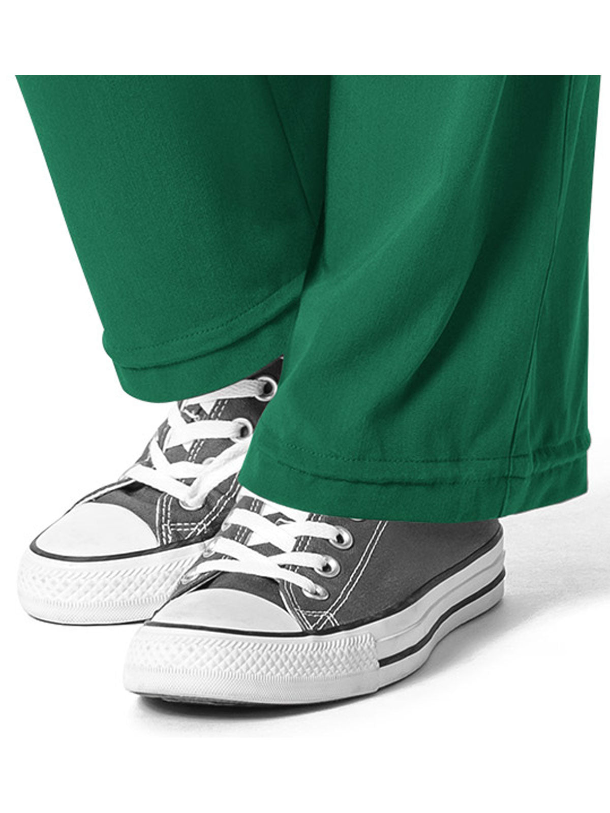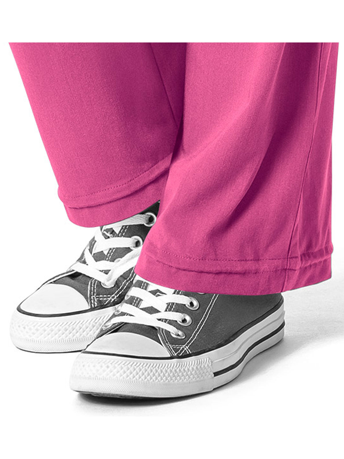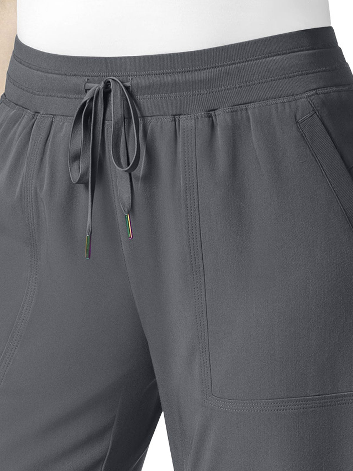 Dyed-to-match flat back rib knit waist with full drawstring.