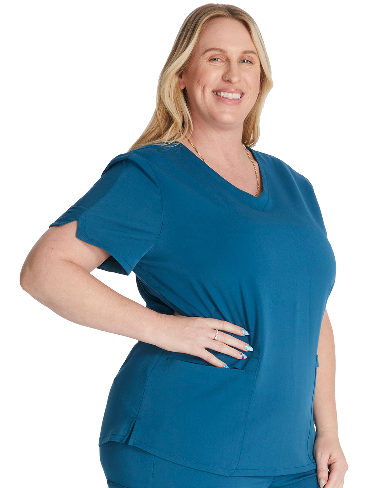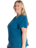 Introducing the Women's V-Neck 2 Pocket Scrub Top from Cherokee's Atmos collection. This top is perfect for daily wear and comes with a stylish v-neck design. Additionally, it features soft knit sleeves and side vents that provide flexibility during your shift. Stay comfortable and look your best in this top.