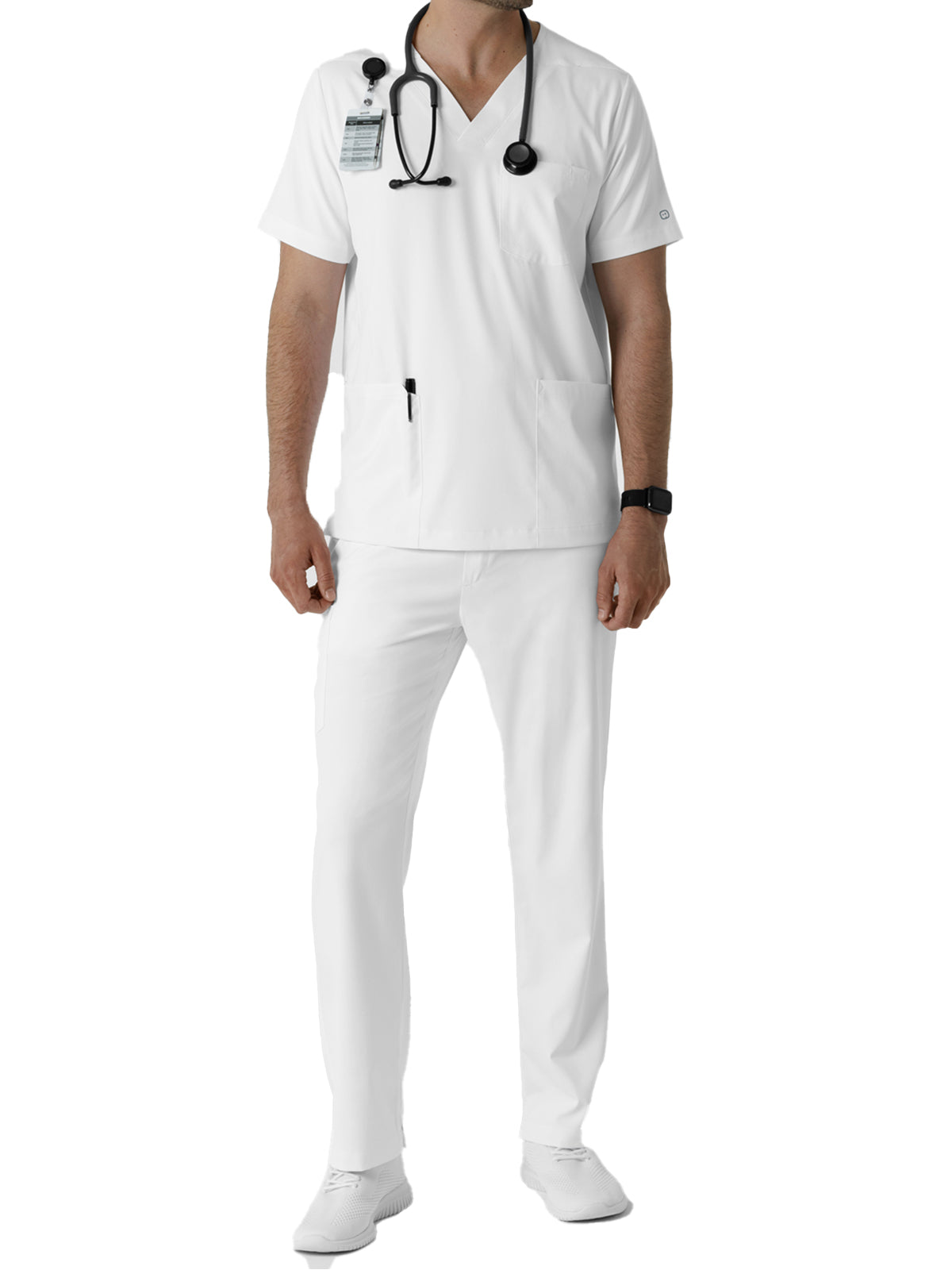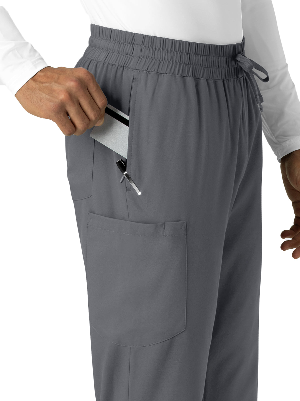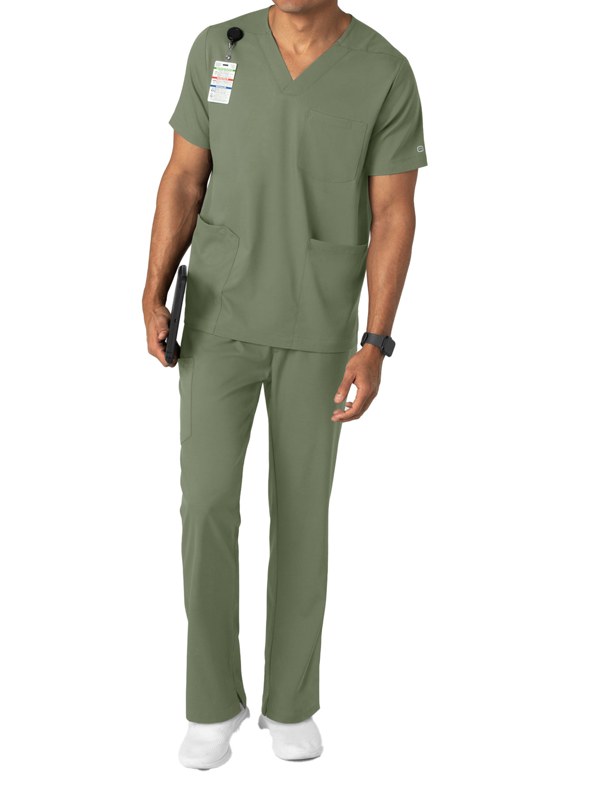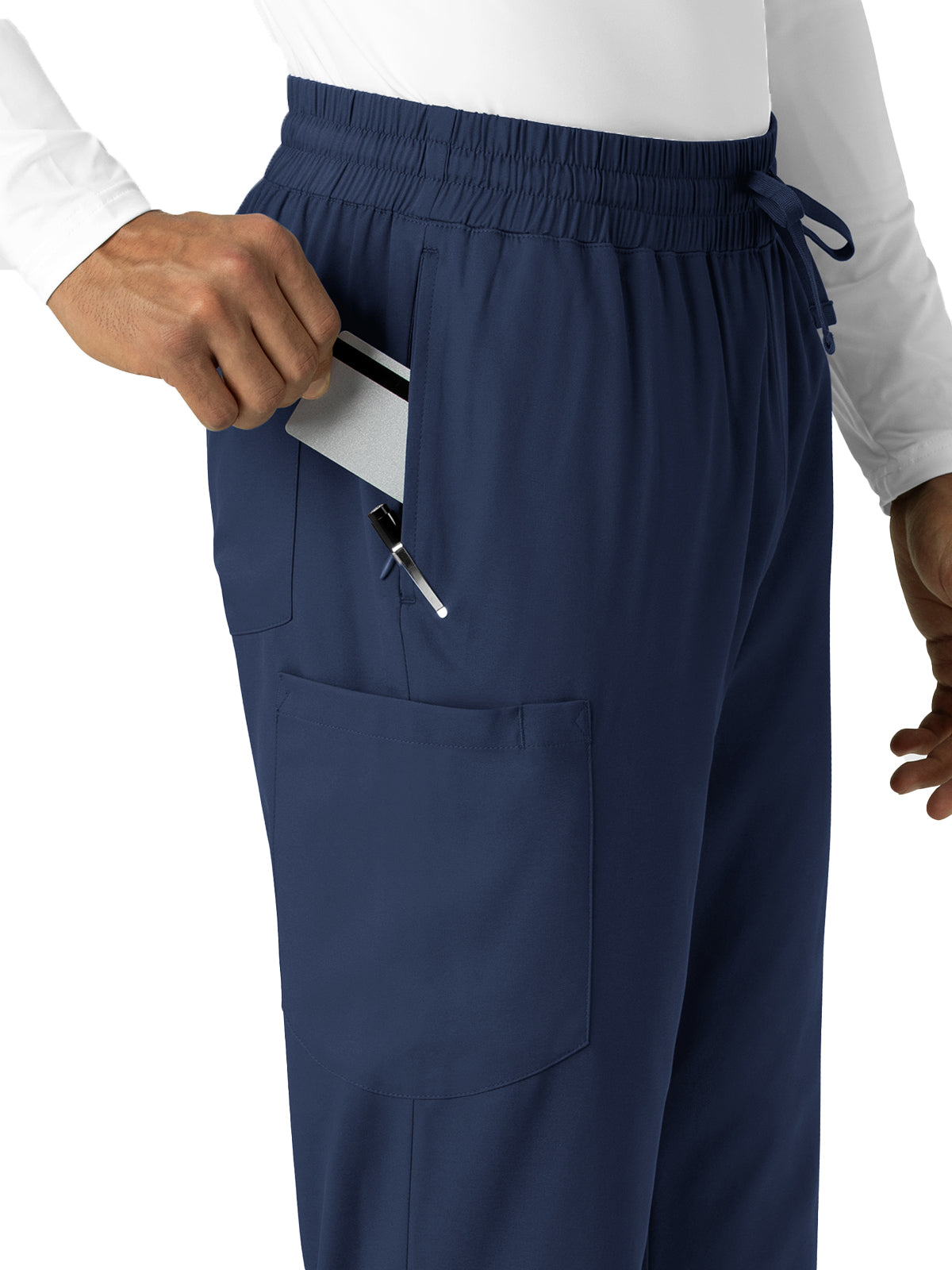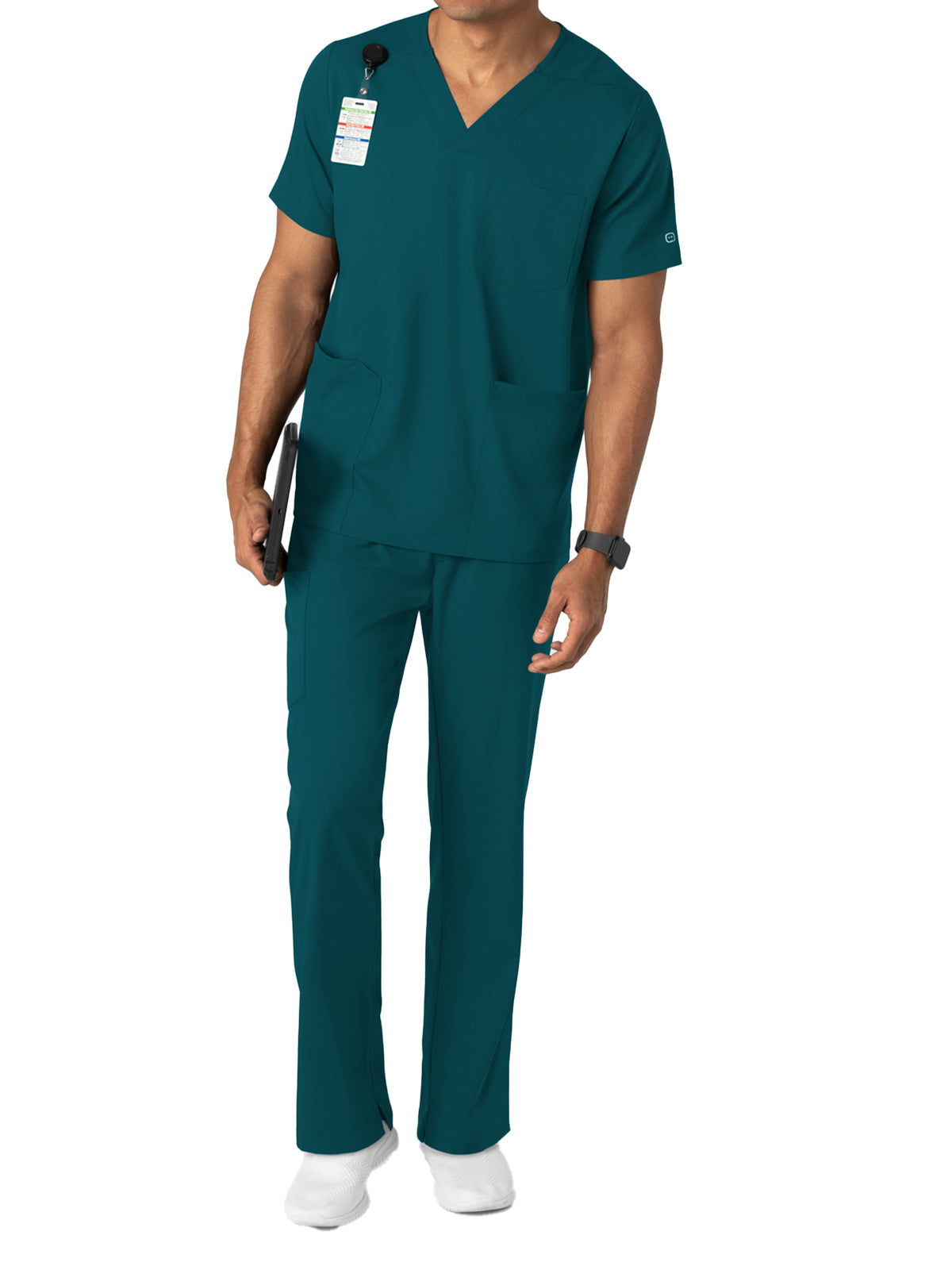 Fresh, modern, classic. These men's straight-leg scrub pants merge on-trend style with the functionality you need to be successful every shift. They're fabricated from a soft and stretchy fabric that's sustainably made, letting you feel good about doing your part to help protect the planet while you care for your patients. Get a customized, adjustable fit with a drawstring on the waist, which is made with a wide elastic band for comfort that never digs in or restricts your movement. Keep everything you need right by your side with two side-entry pockets plus a small security pocket that helps secure valuables you'd rather stay with you. A cargo pocket includes a bartack stitch for your pen. Internal vent slits let your scrub pants rest easy over your shoes, elongating the silhouette for a clean-lined drape. Built for bold confidence, these scrub pants give you the versatility you're looking for to make every shift one you can feel good about when it's done.