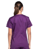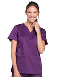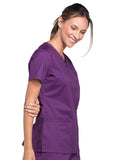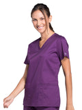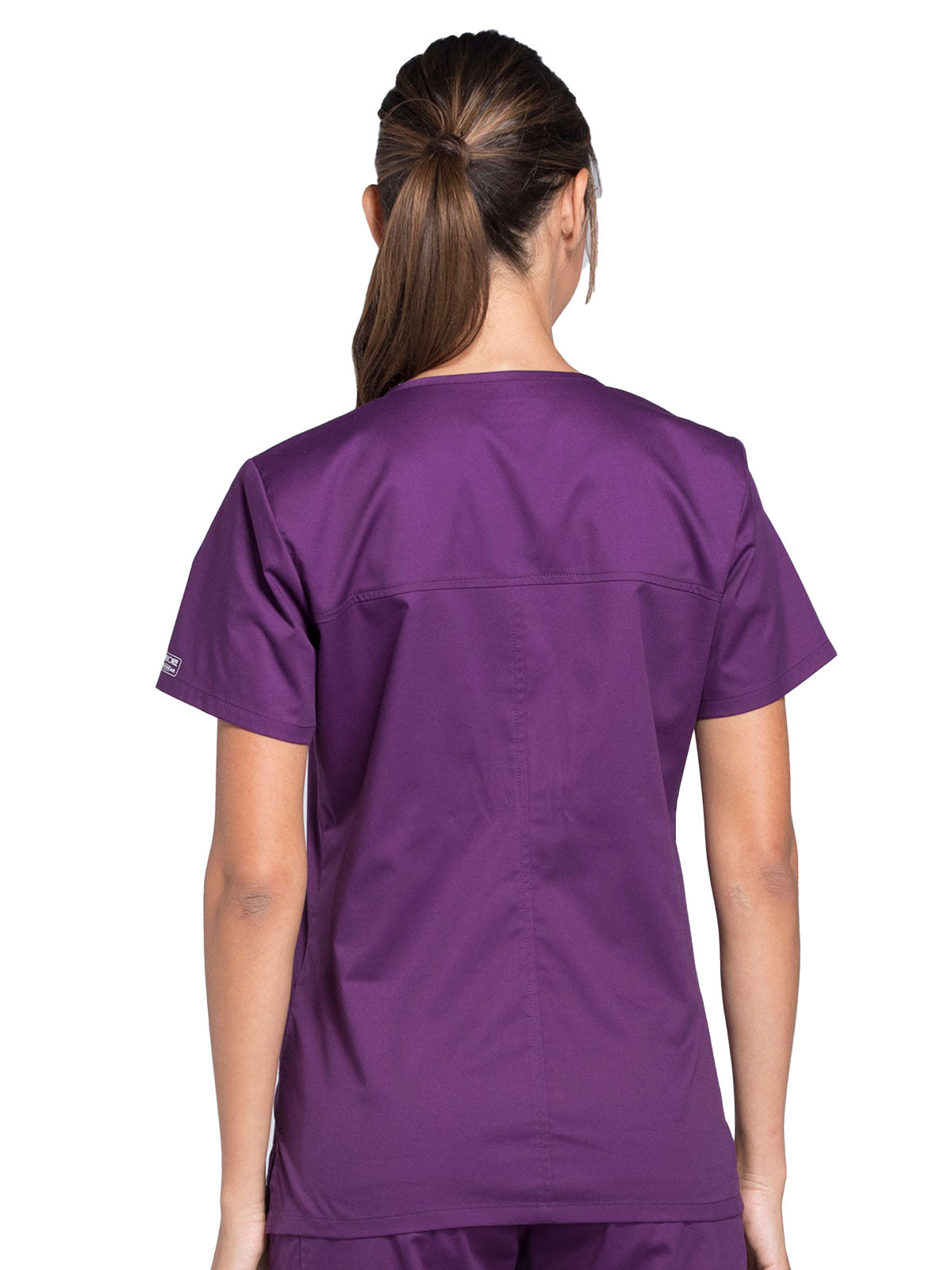A Modern Classic fit cherokee core stretch scrub V-neck top features two patch pockets (the right with an interior pocket, the left with a pen slot and hidden instrument loop), bungee ID badge loop at the neckline, a back yoke and side vents. Center back length: 26"_x000D_