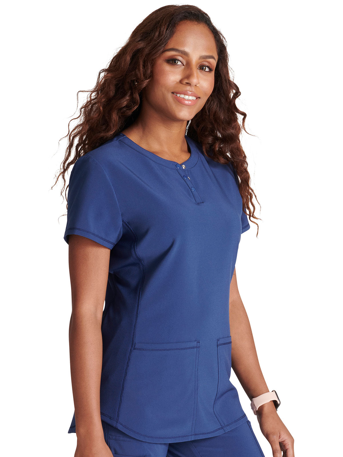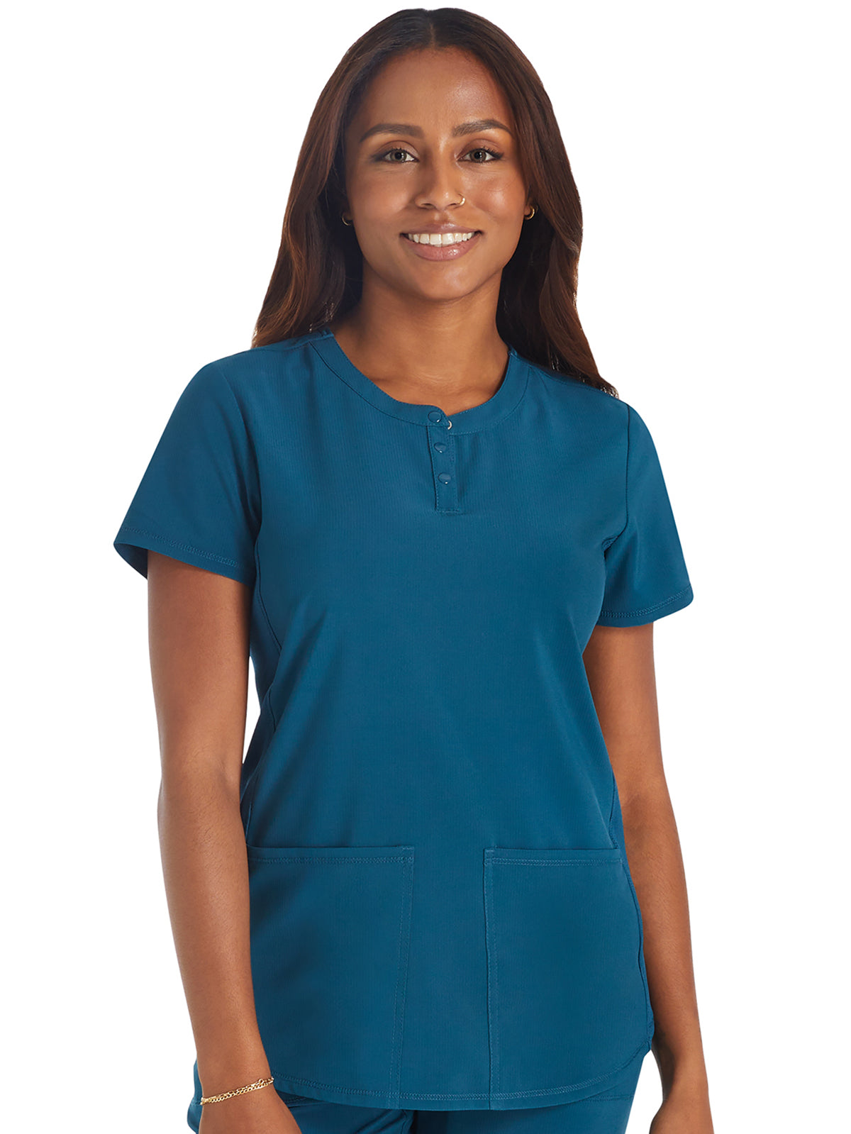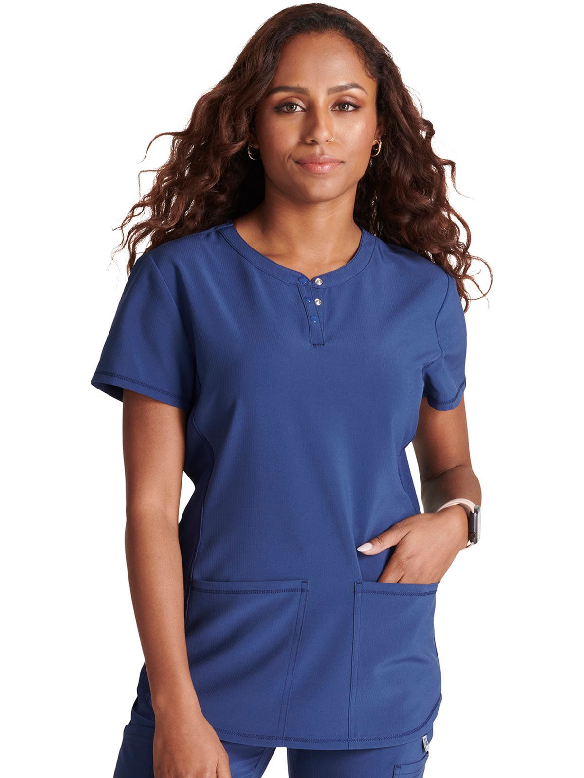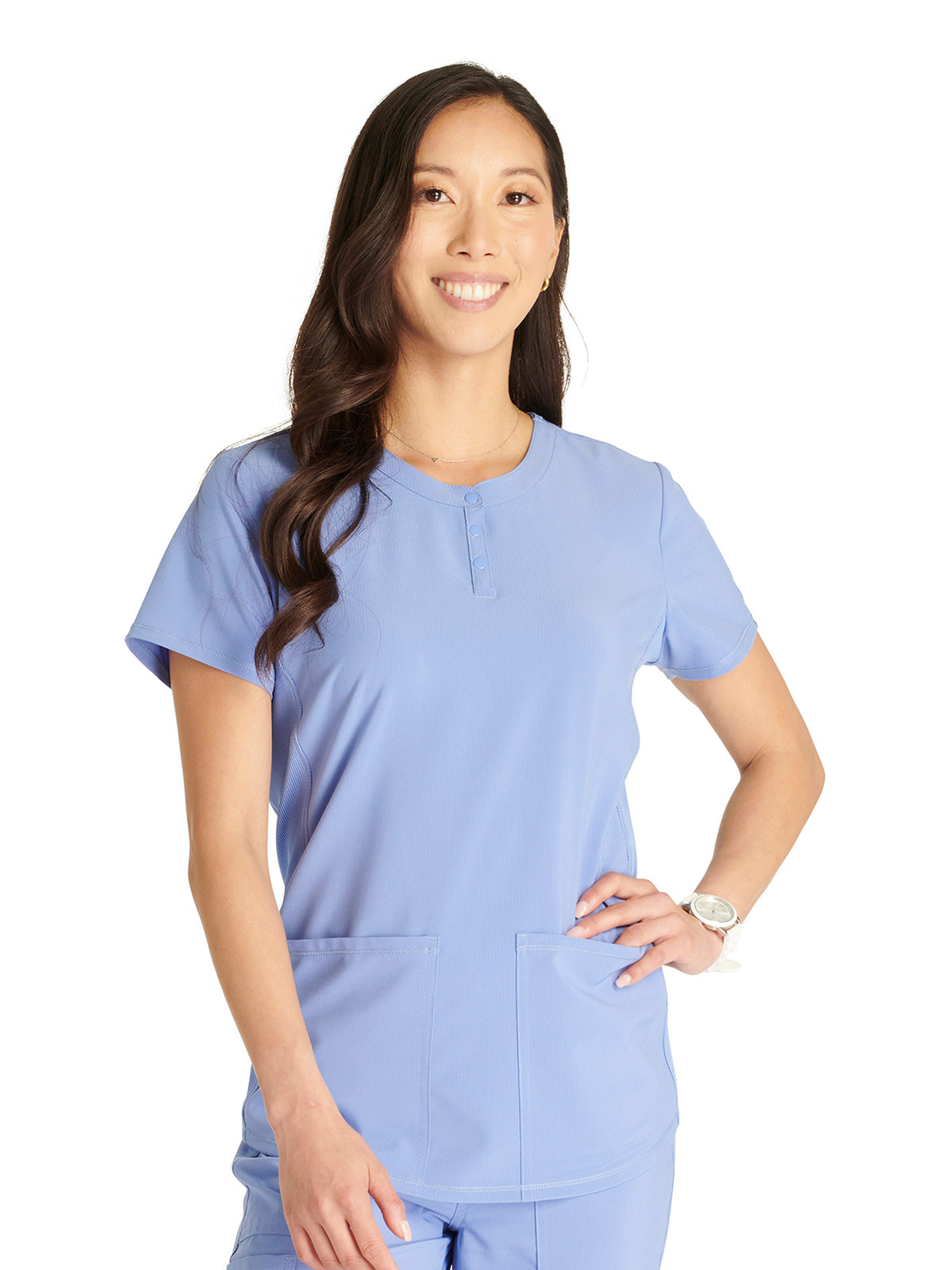 The Cherokee Women's Henley Solid Scrub Top is a modern and stylish addition to your professional uniform, featuring a Henley neckline with snap buttons, side knit panels, and front pockets for essential items.