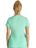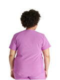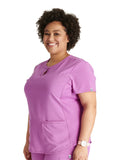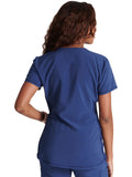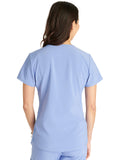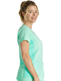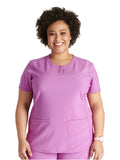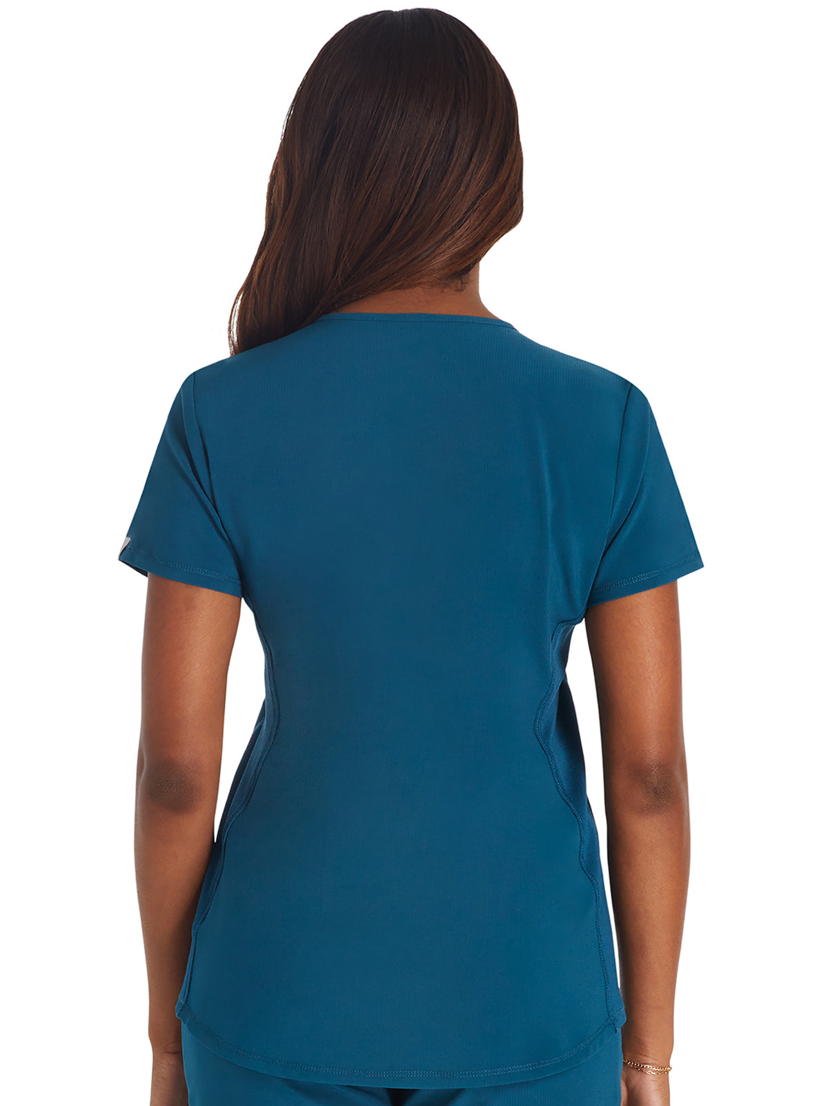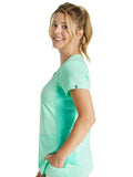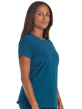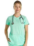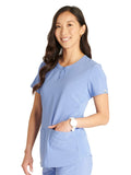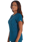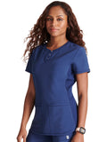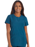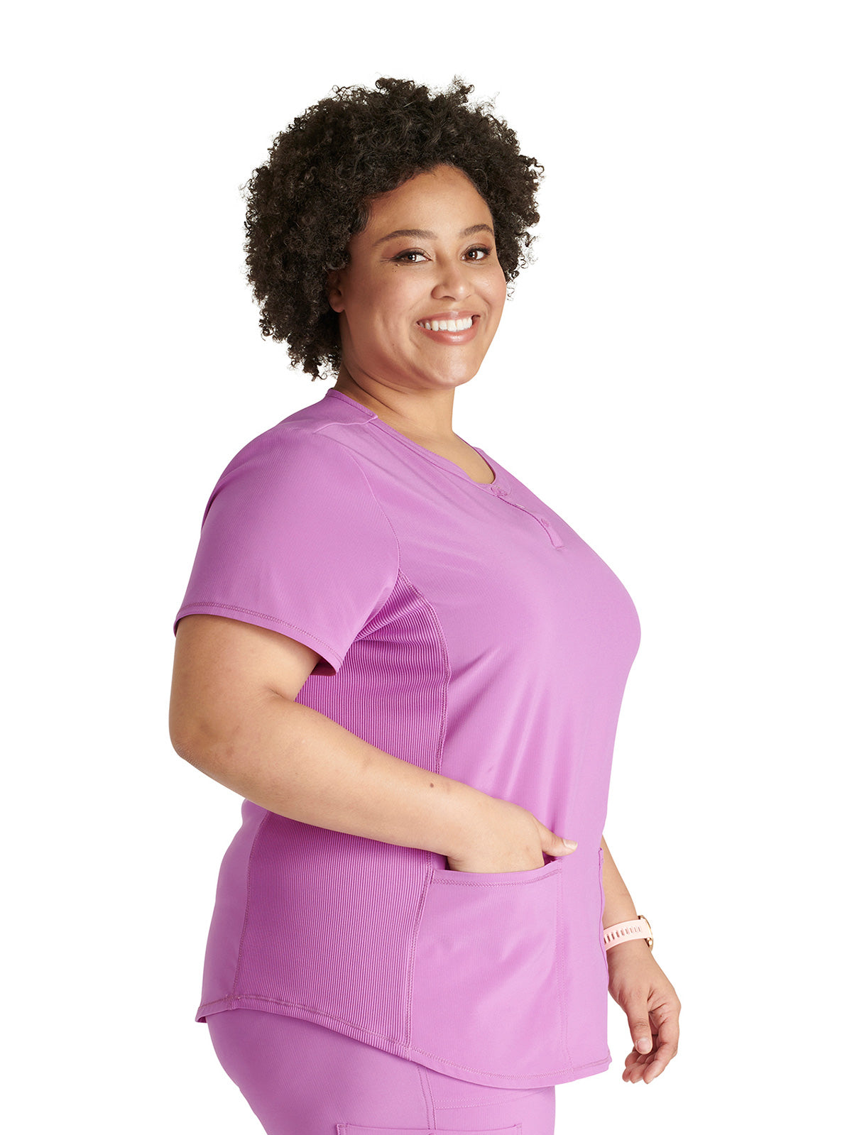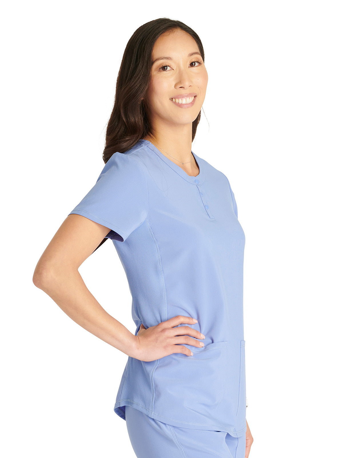 The Cherokee Women's Henley Solid Scrub Top is a modern and stylish addition to your professional uniform, featuring a Henley neckline with snap buttons, side knit panels, and front pockets for essential items.