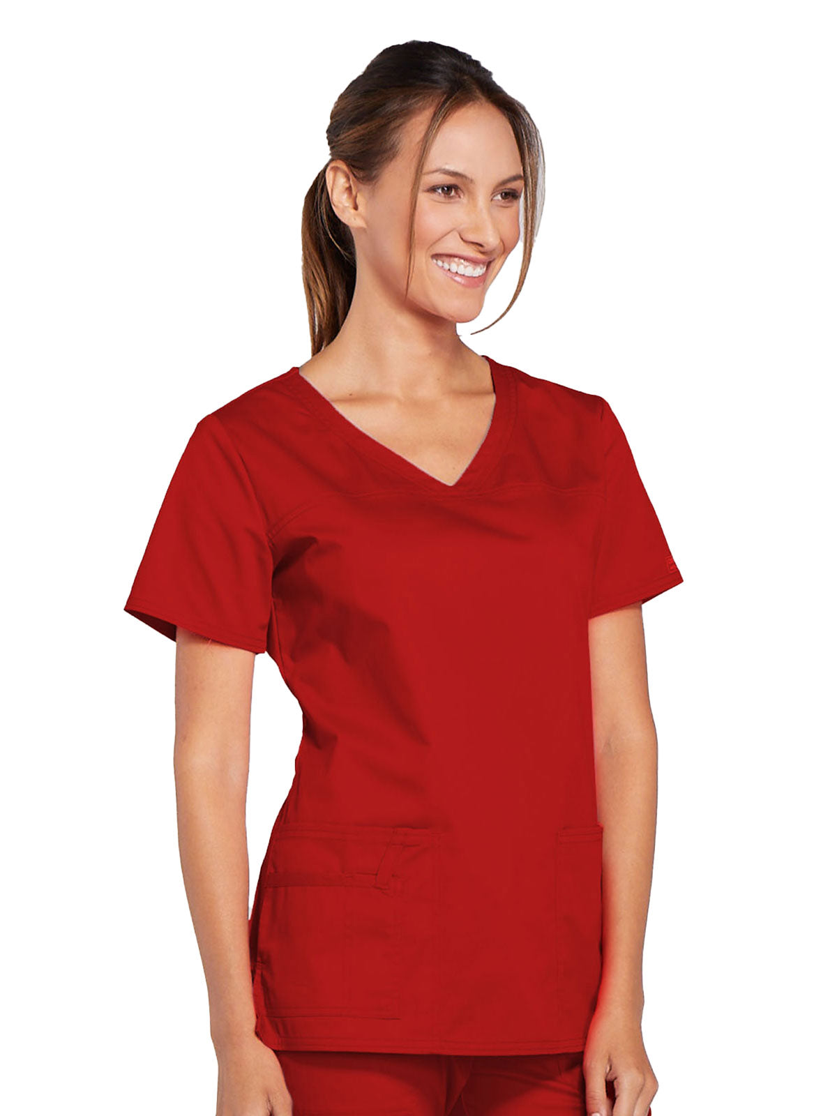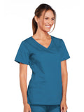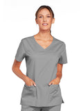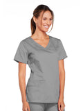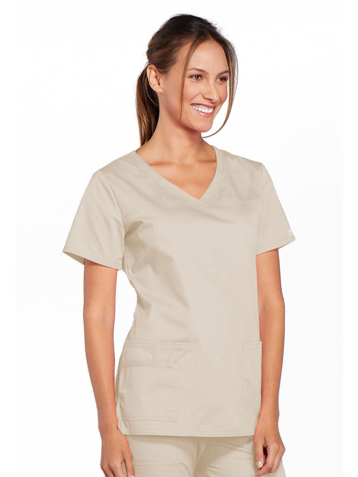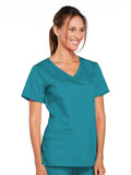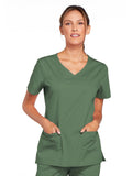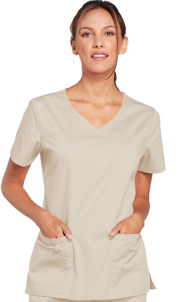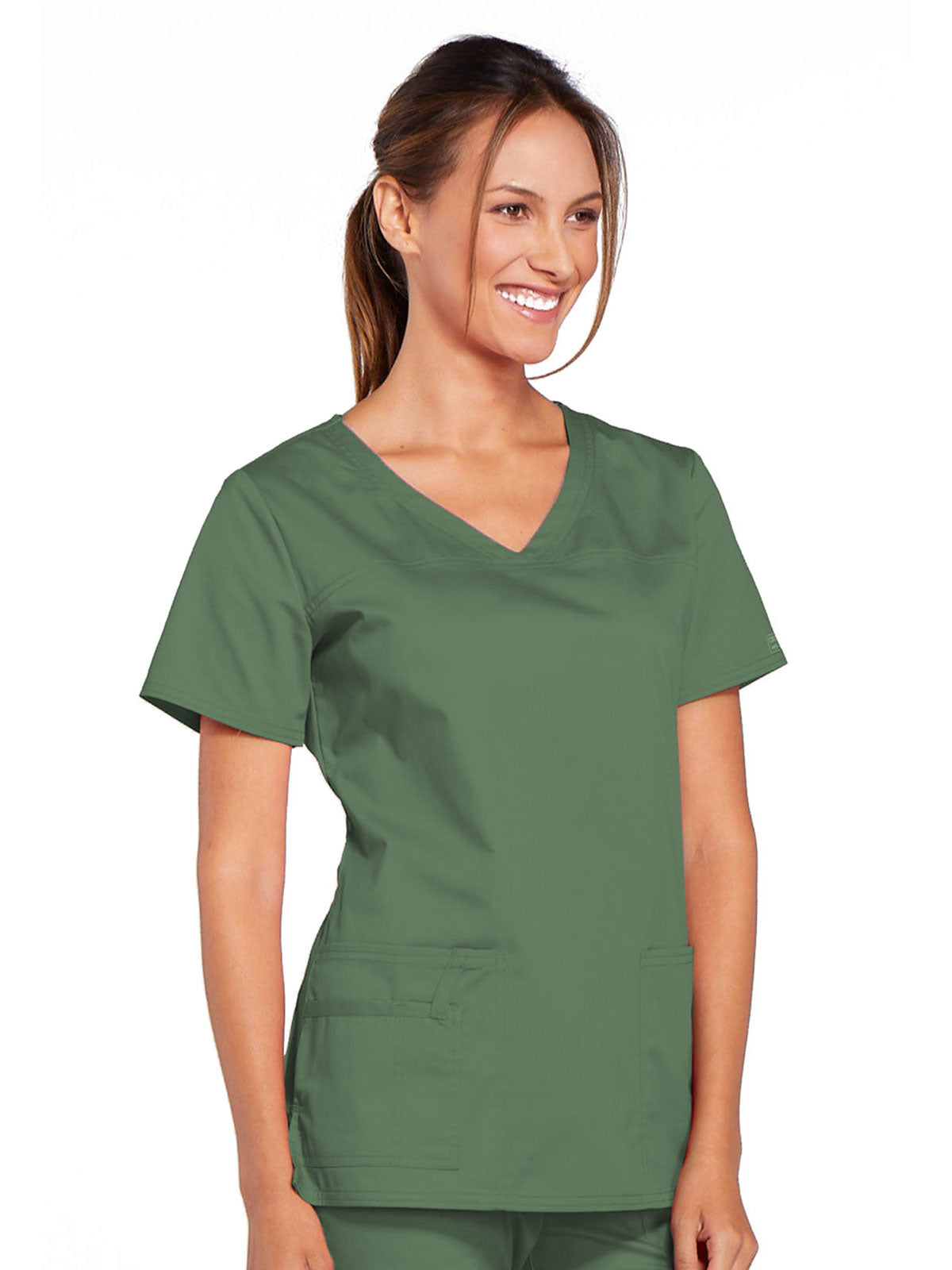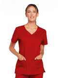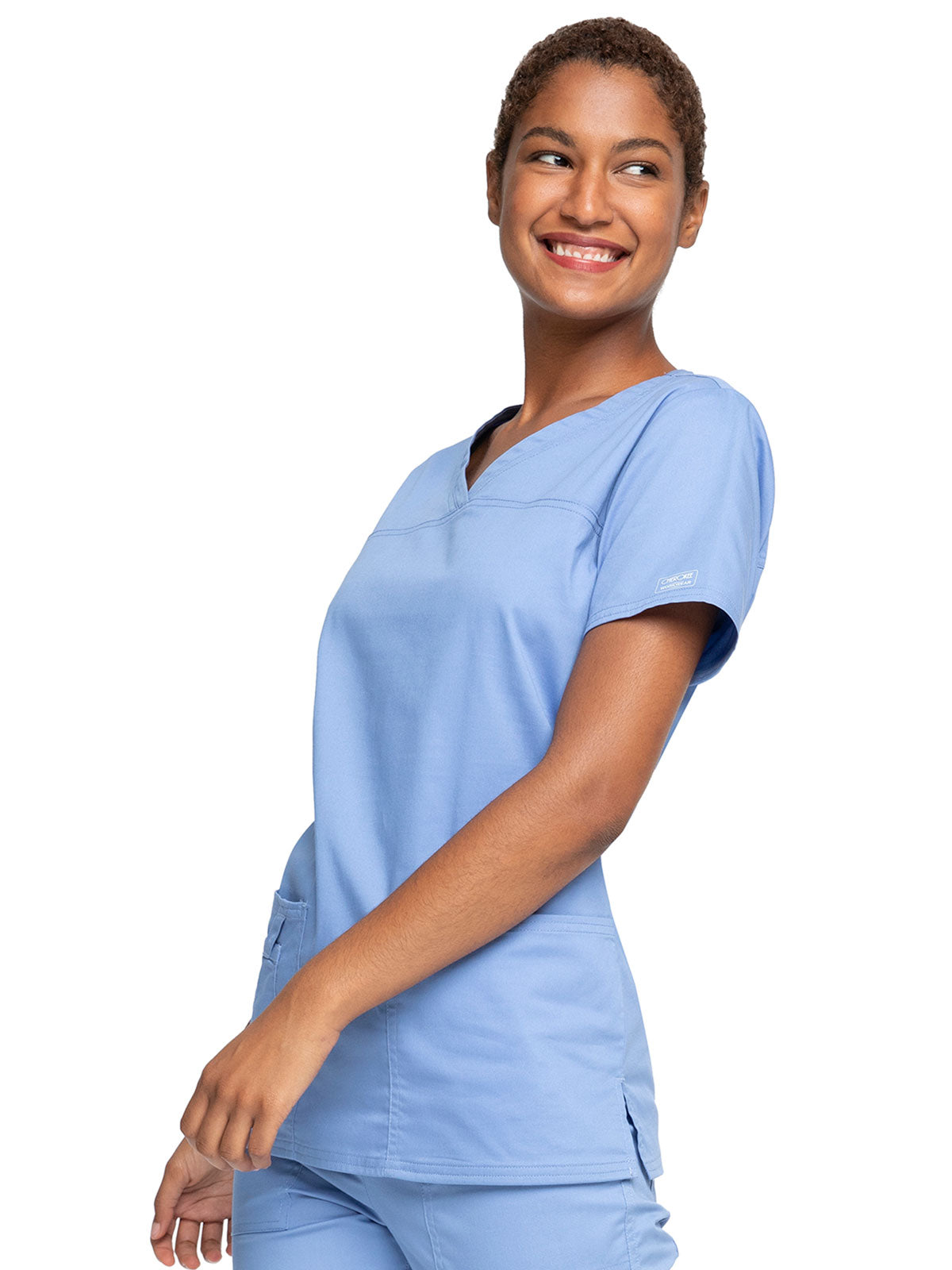 A Modern Classic Cherokee workwear core fit V-neck top features crossover front yokes and patch pockets. The right side pocket has a sectional pocket and I.D. loop. A back yoke, back princess seams, and side vents complete the picture. Center back length: 27".