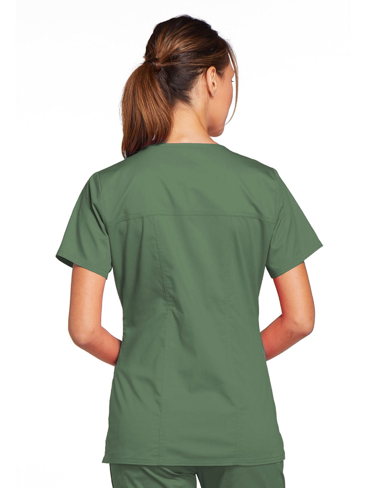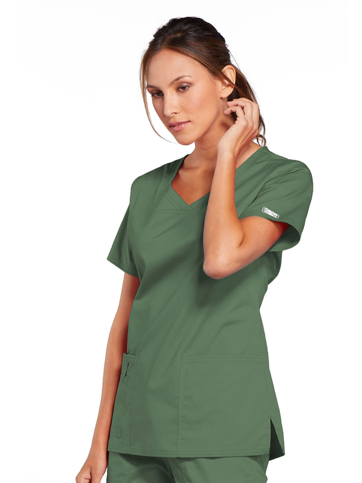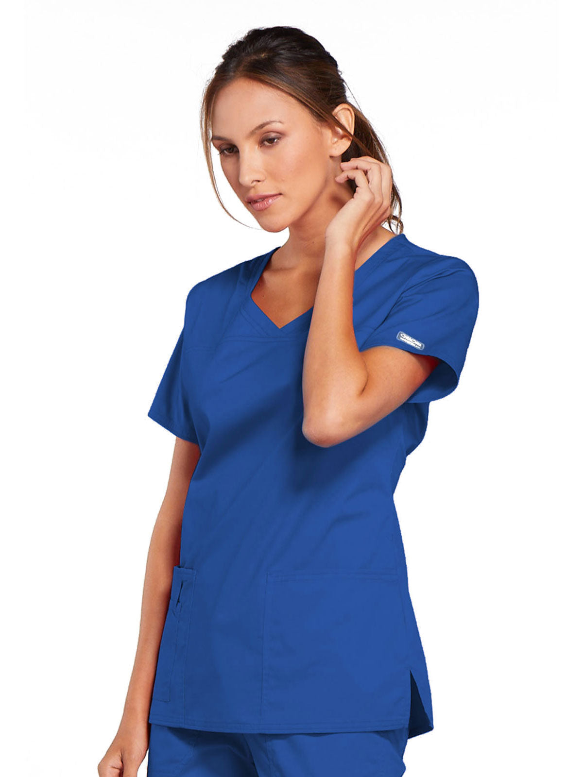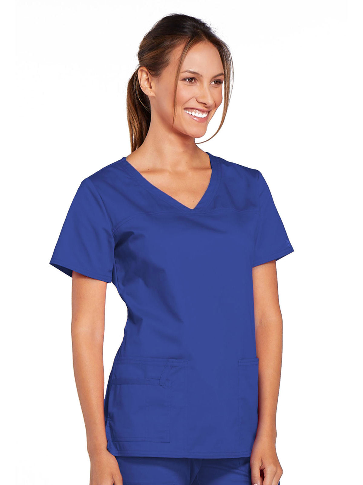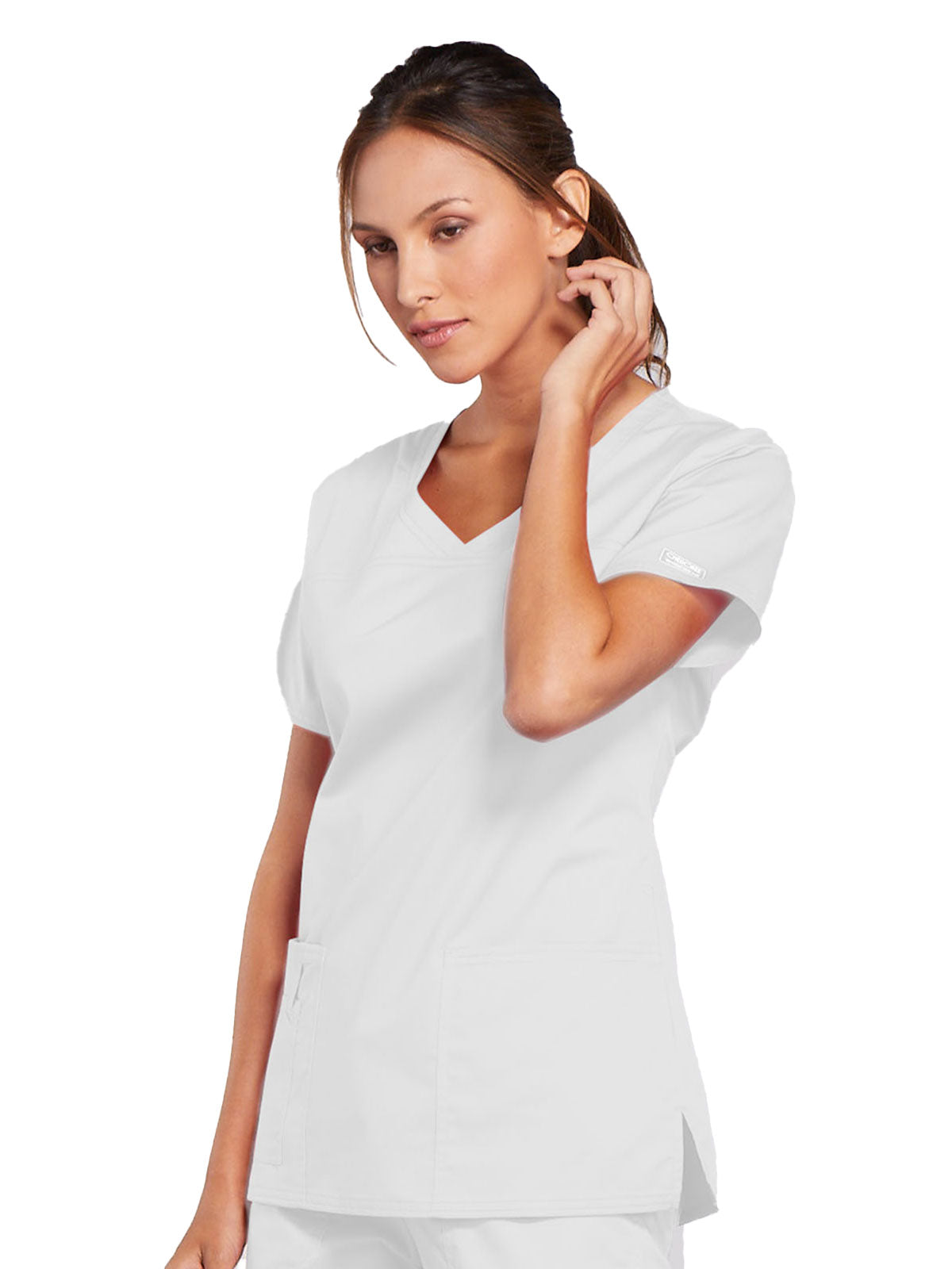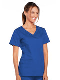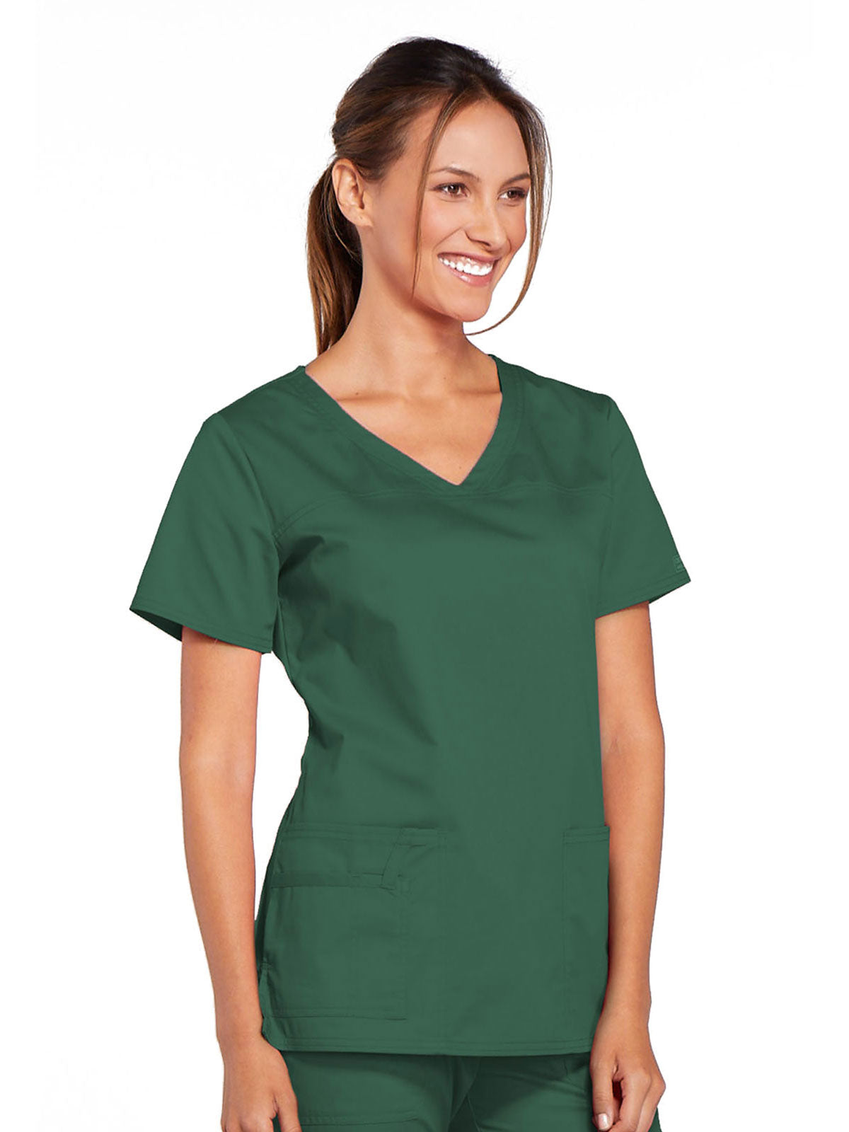 A Modern Classic Cherokee workwear core fit V-neck top features crossover front yokes and patch pockets. The right side pocket has a sectional pocket and I.D. loop. A back yoke, back princess seams, and side vents complete the picture. Center back length: 27".