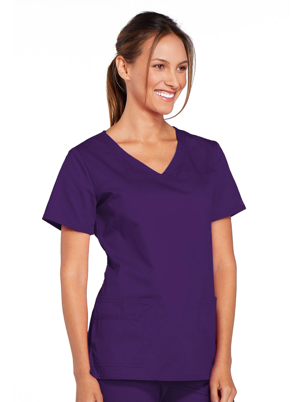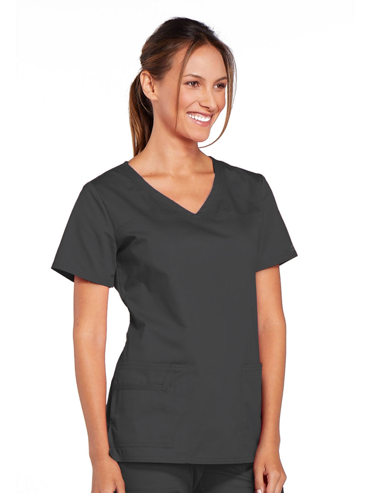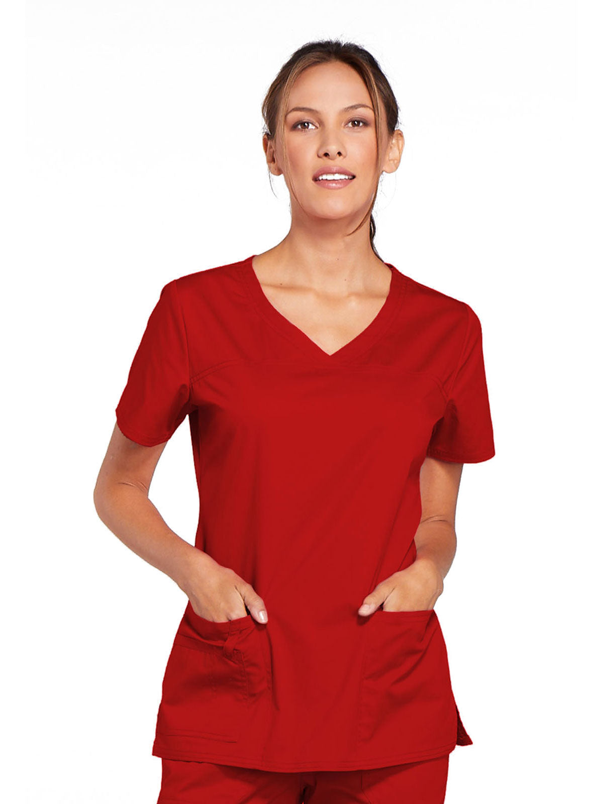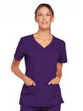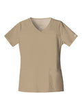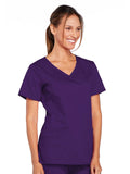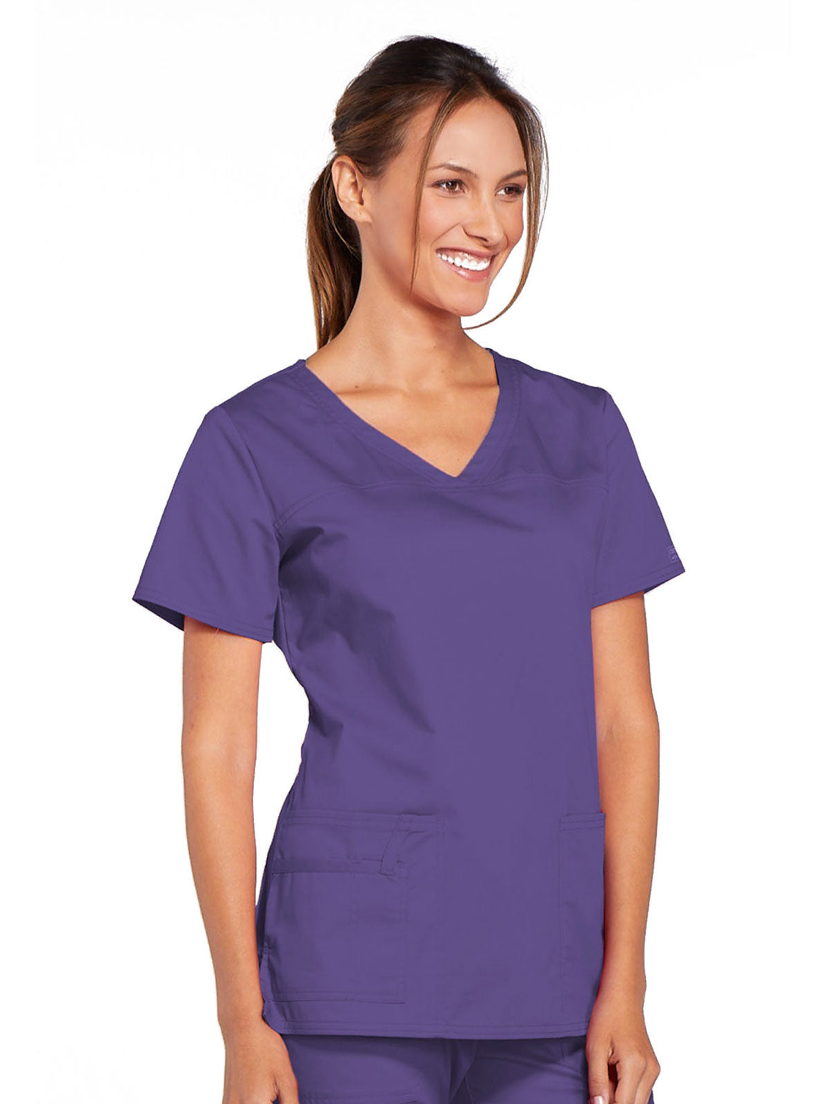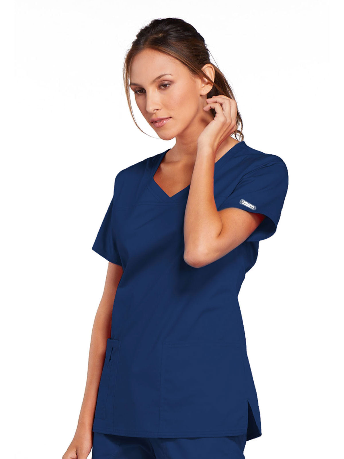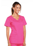A Modern Classic Cherokee workwear core fit V-neck top features crossover front yokes and patch pockets. The right side pocket has a sectional pocket and I.D. loop. A back yoke, back princess seams, and side vents complete the picture. Center back length: 27".