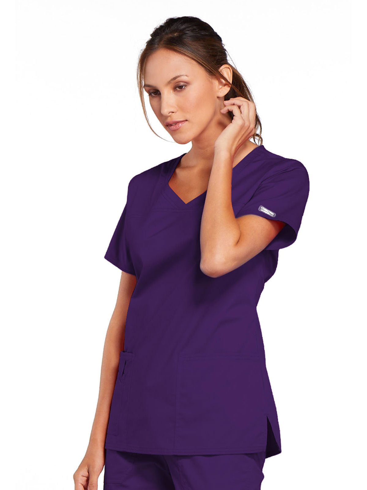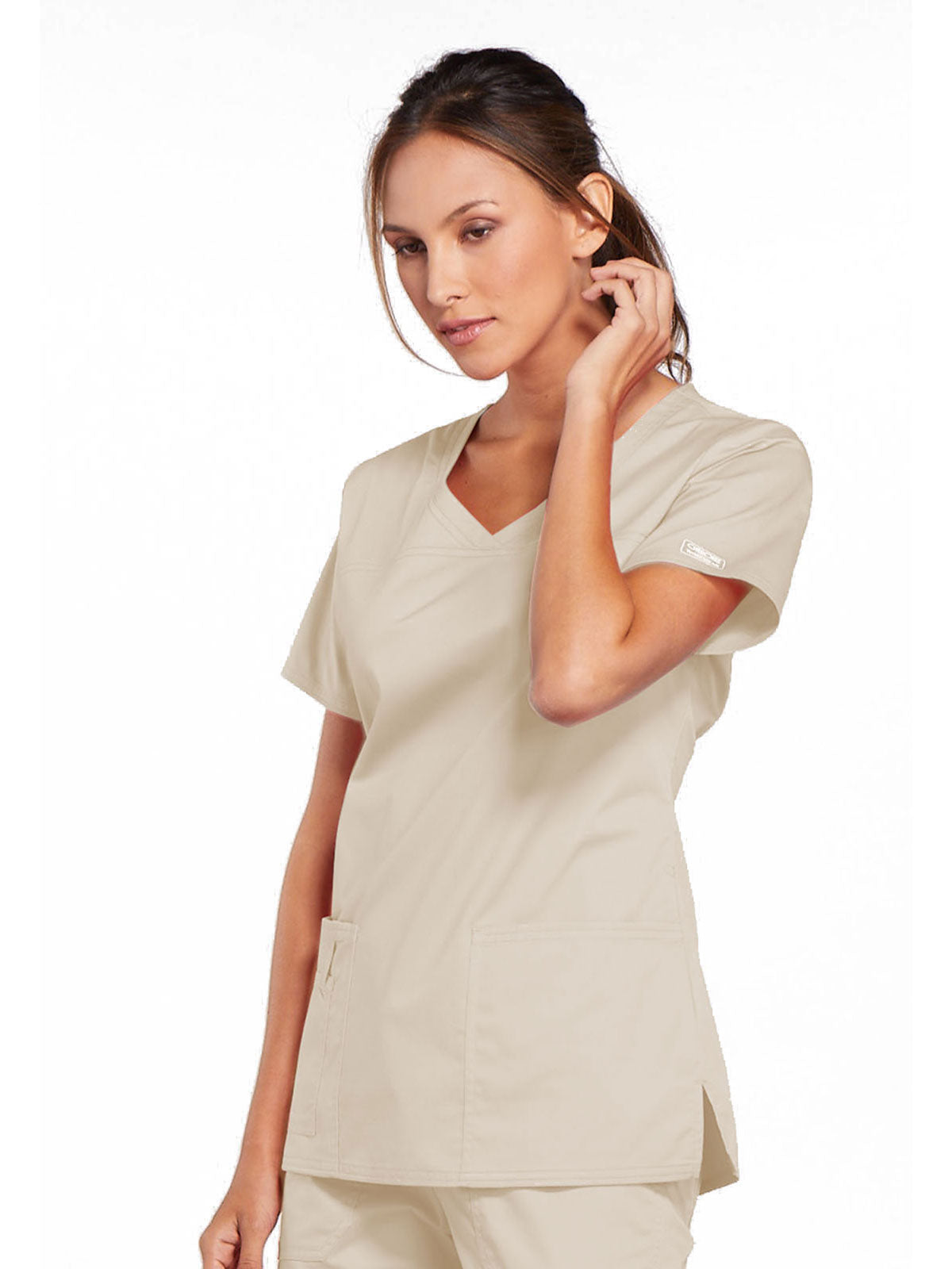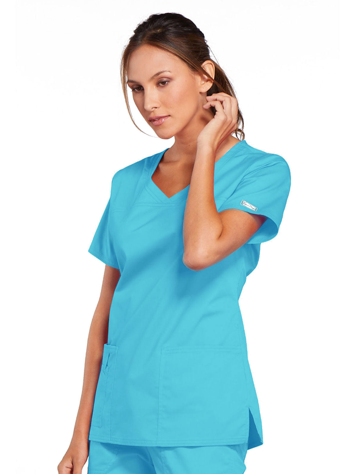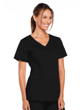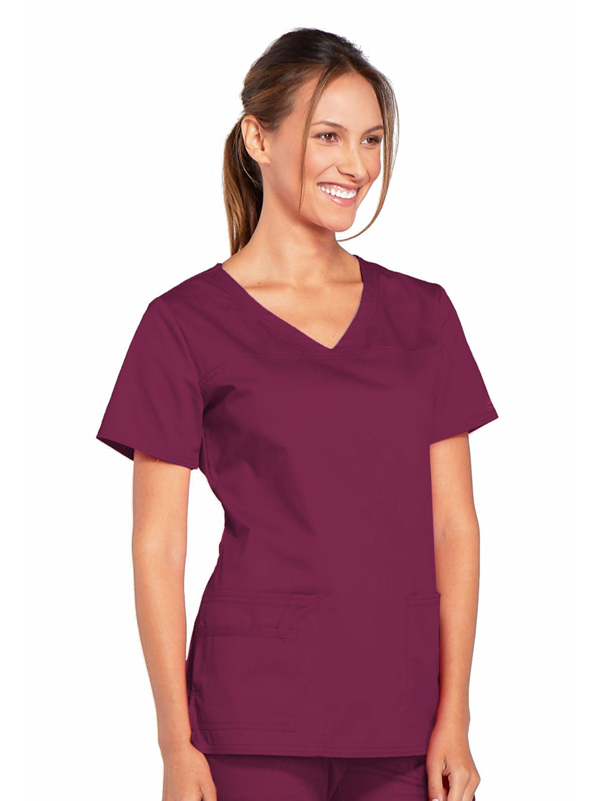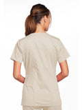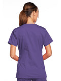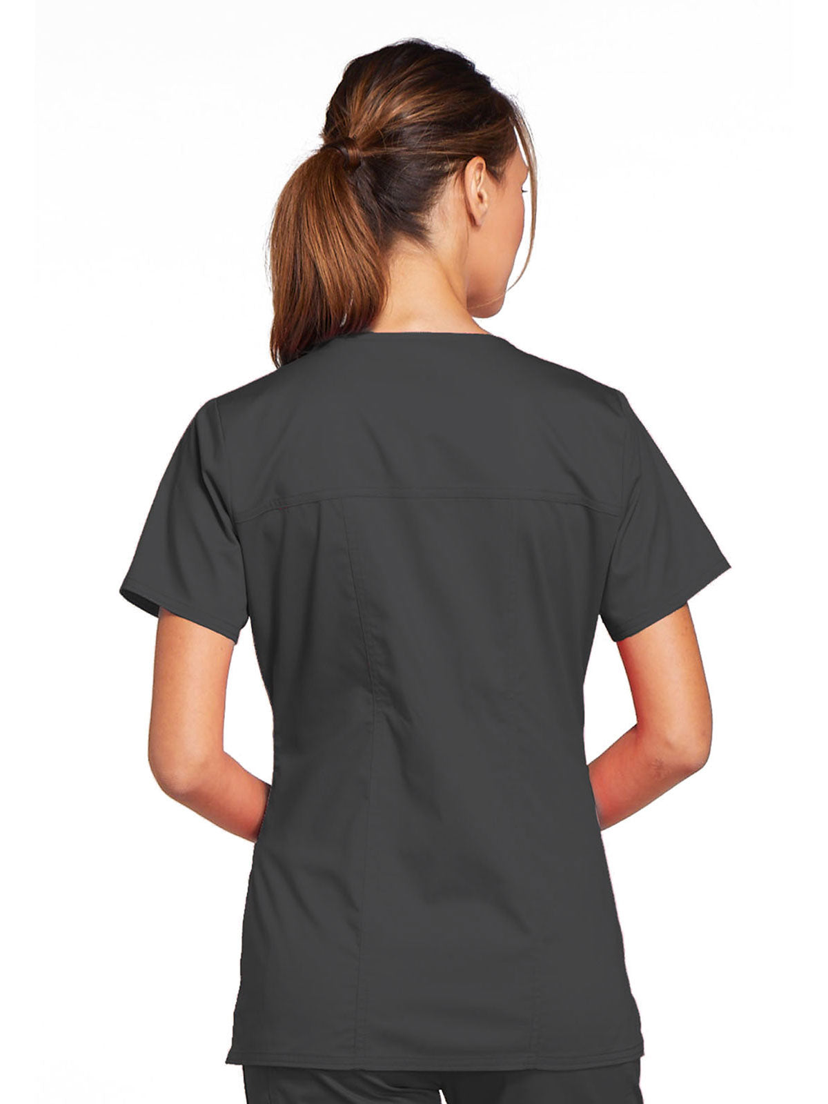A Modern Classic Cherokee workwear core fit V-neck top features crossover front yokes and patch pockets. The right side pocket has a sectional pocket and I.D. loop. A back yoke, back princess seams, and side vents complete the picture. Center back length: 27".