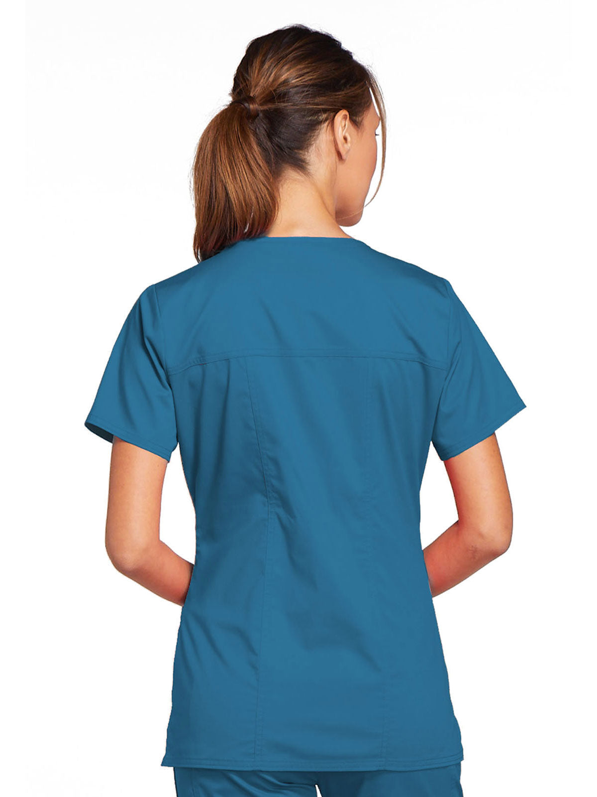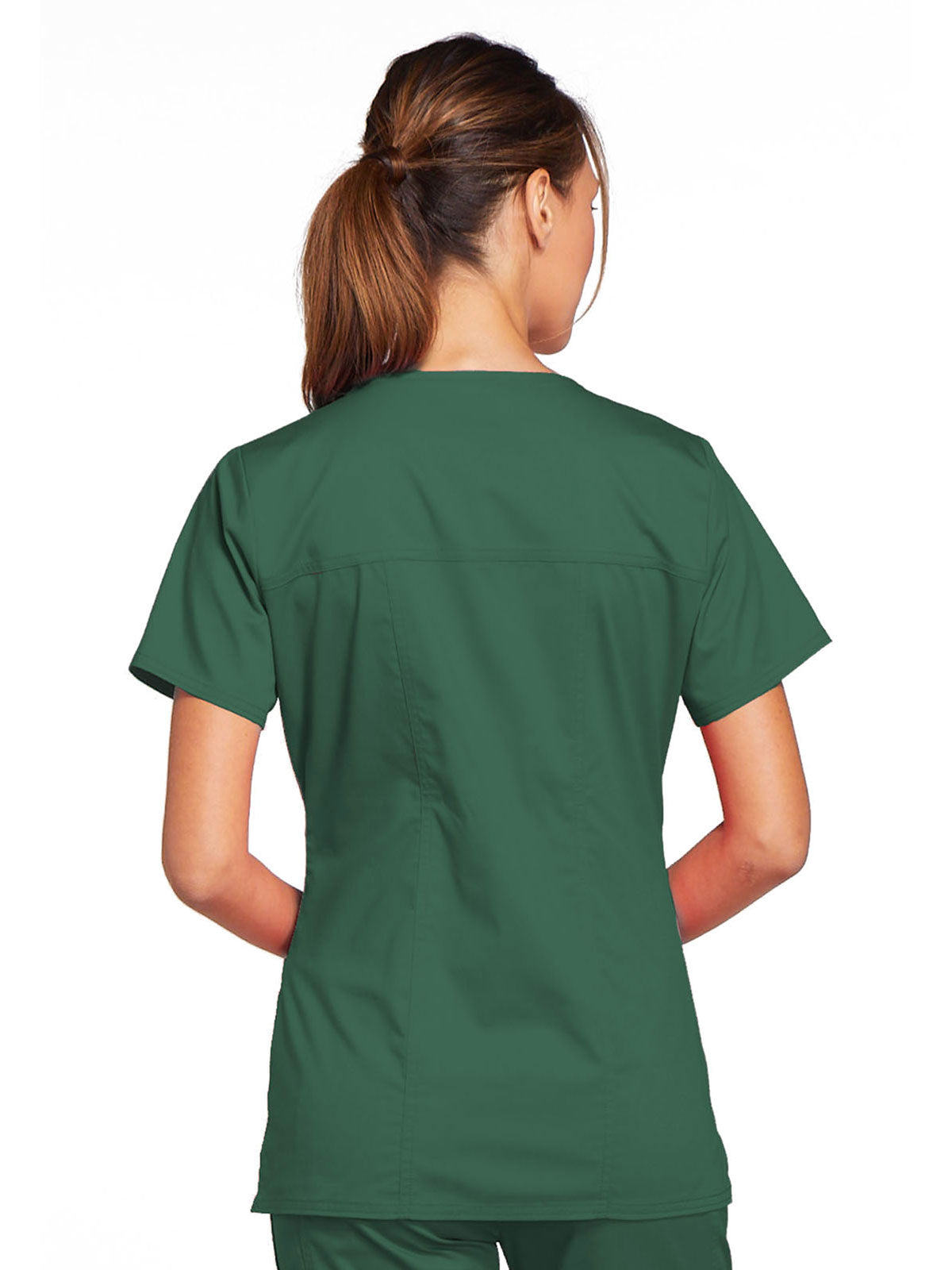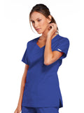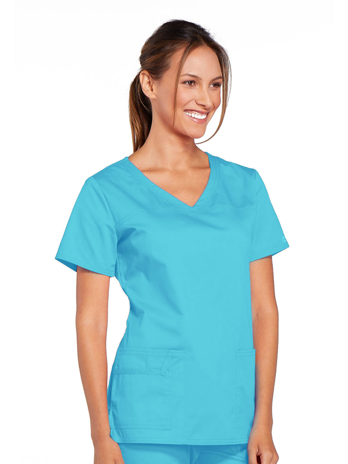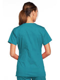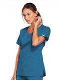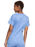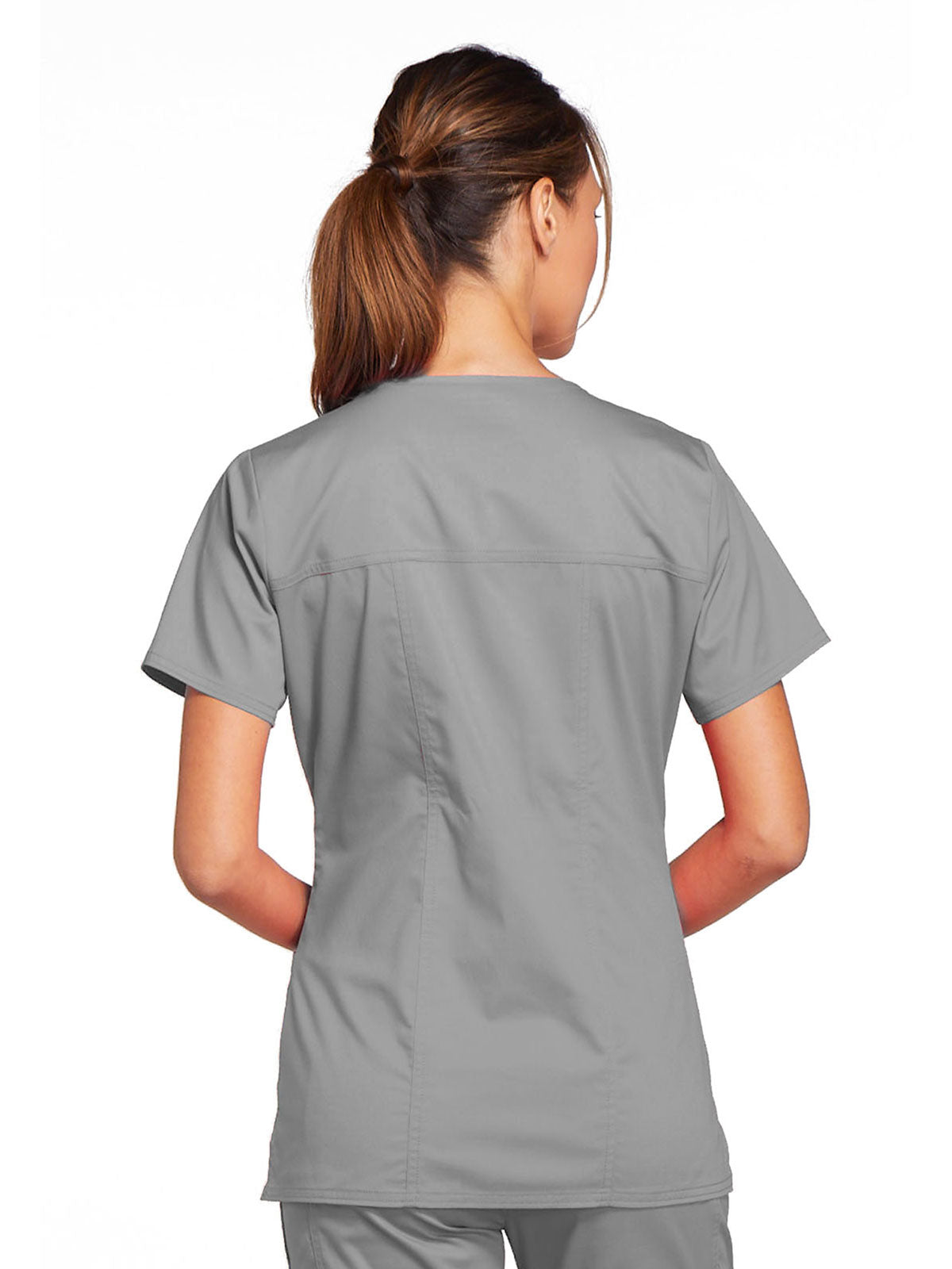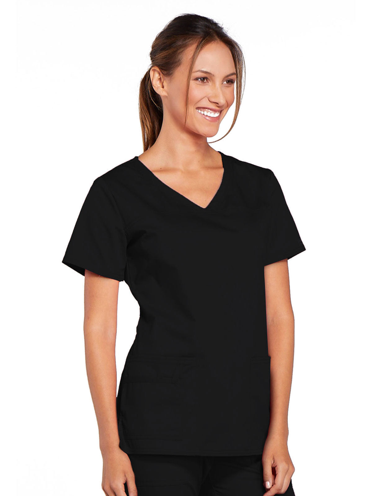 A Modern Classic Cherokee workwear core fit V-neck top features crossover front yokes and patch pockets. The right side pocket has a sectional pocket and I.D. loop. A back yoke, back princess seams, and side vents complete the picture. Center back length: 27".