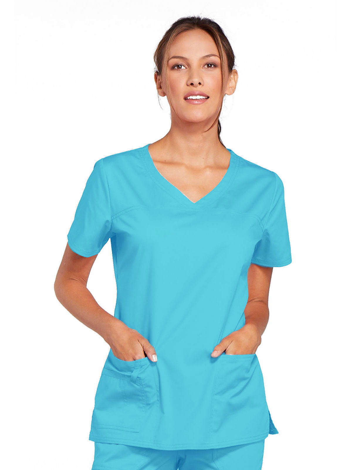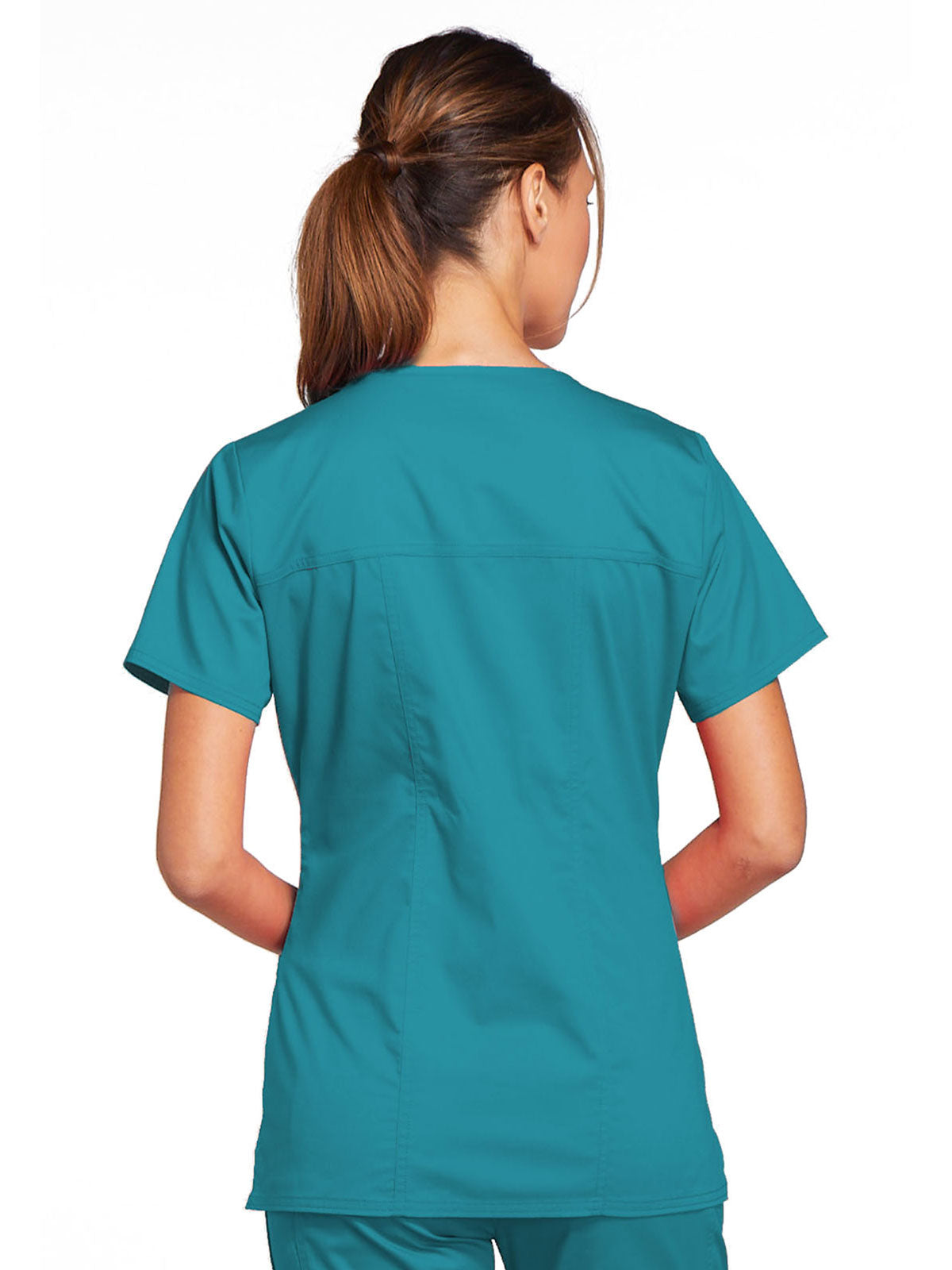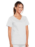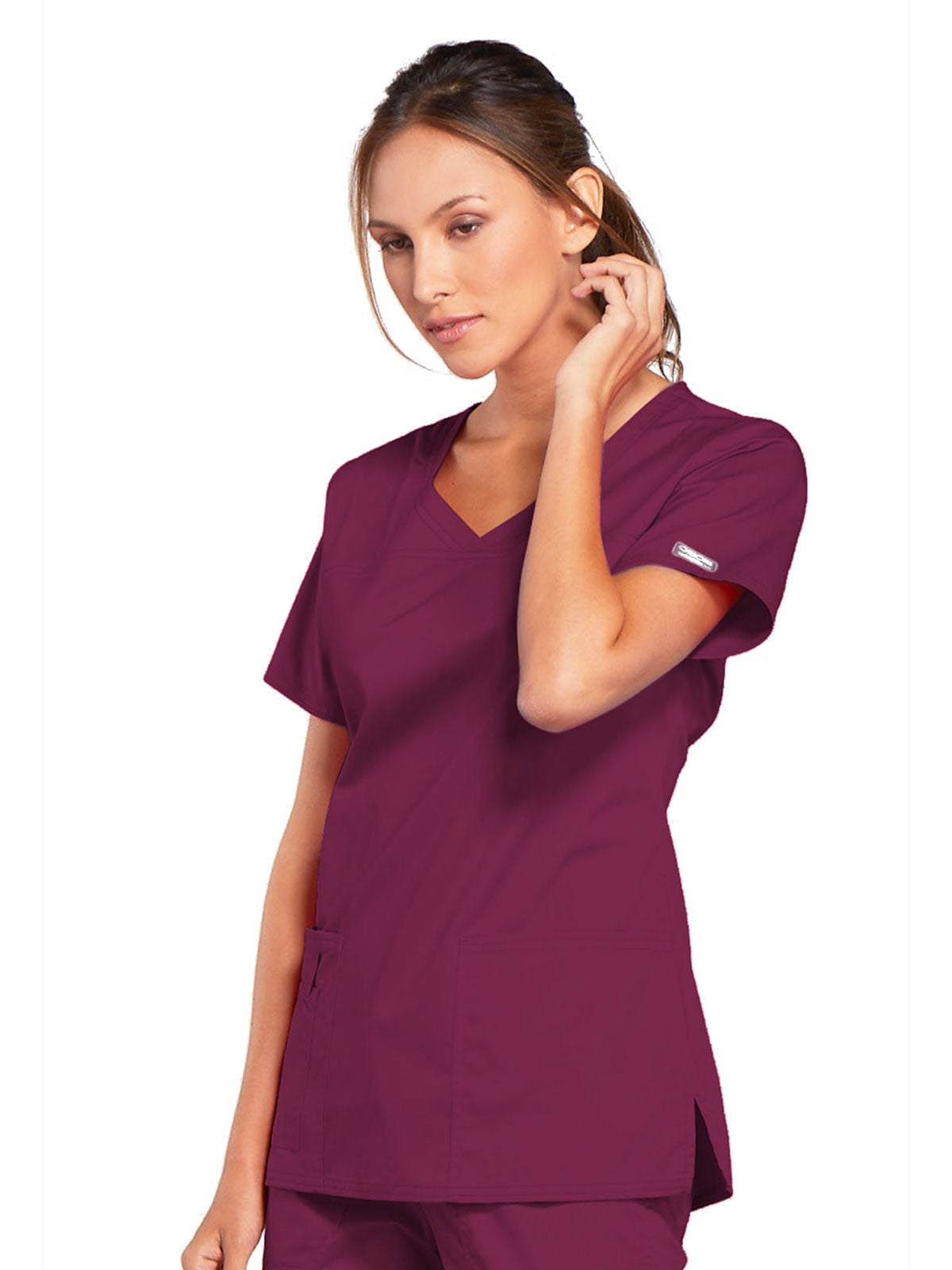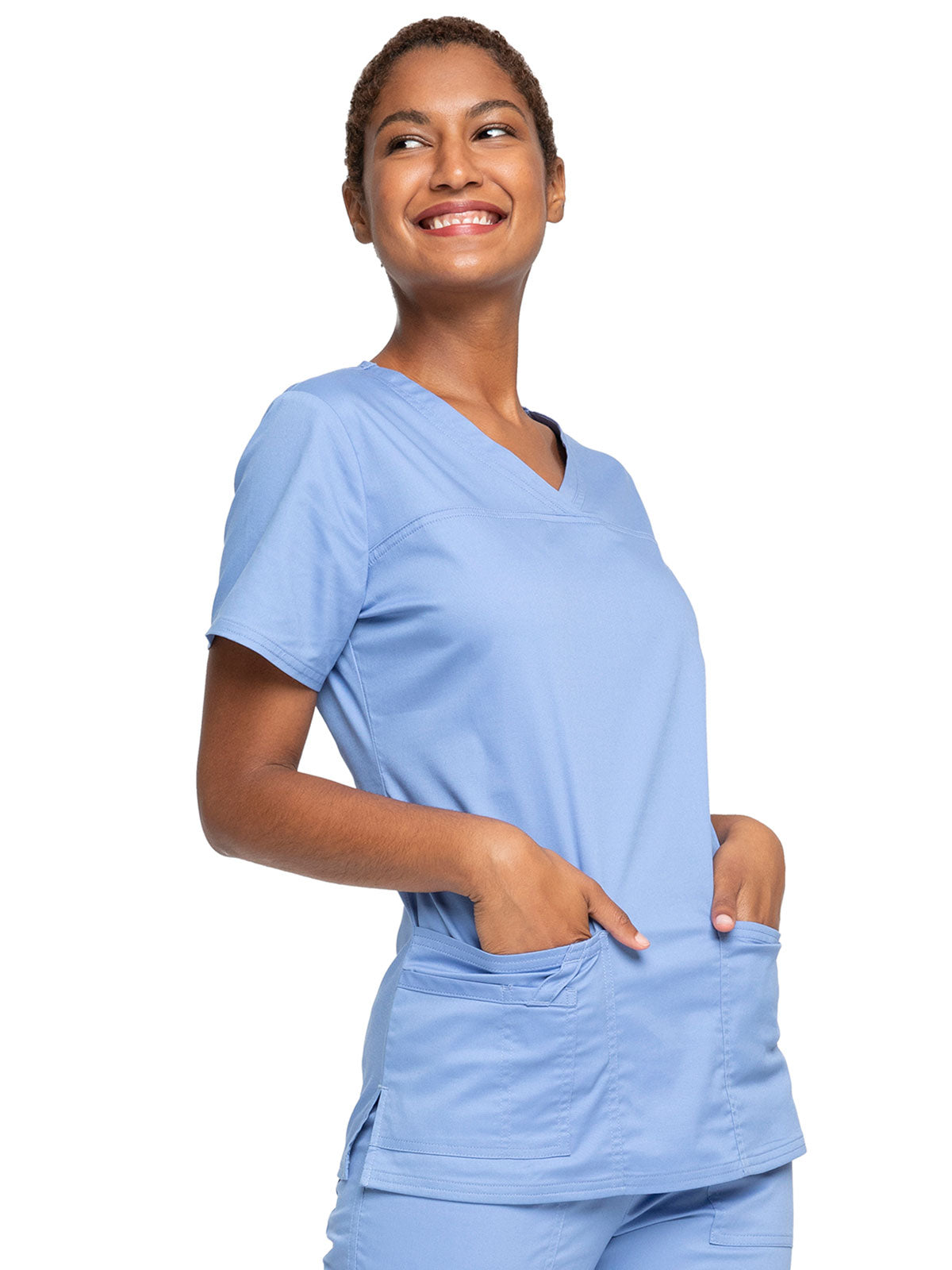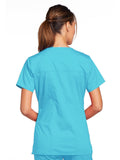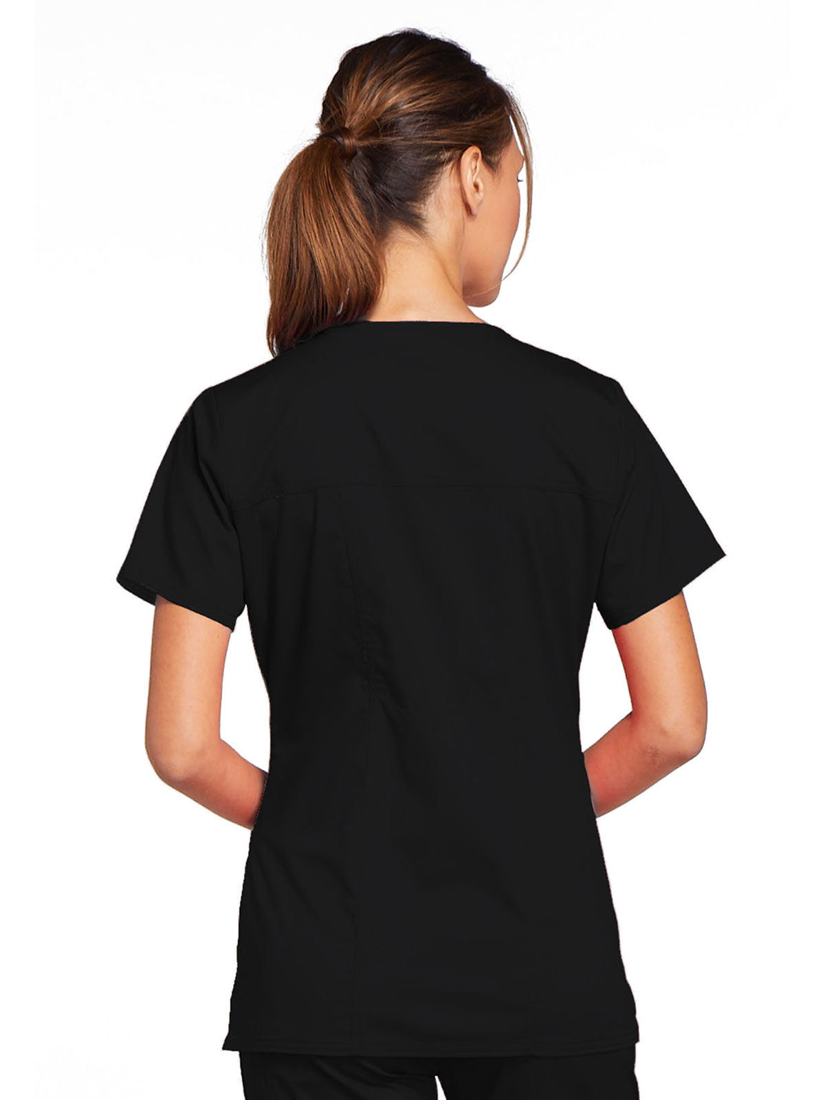 A Modern Classic Cherokee workwear core fit V-neck top features crossover front yokes and patch pockets. The right side pocket has a sectional pocket and I.D. loop. A back yoke, back princess seams, and side vents complete the picture. Center back length: 27".