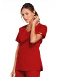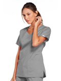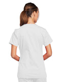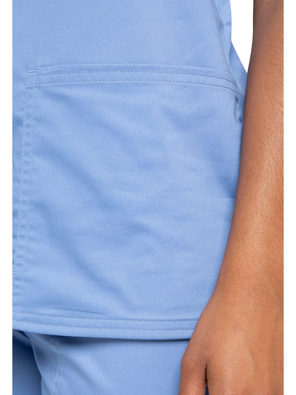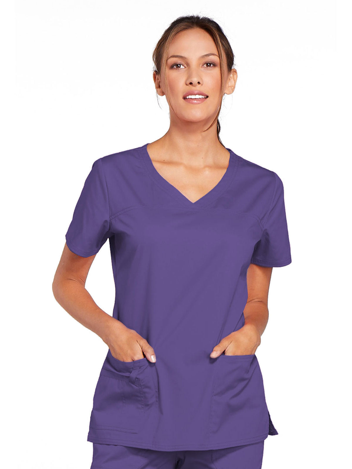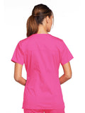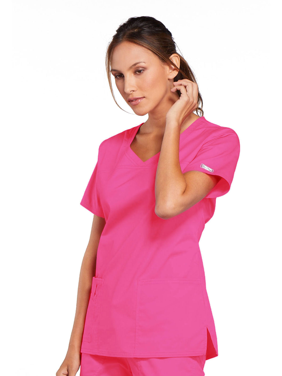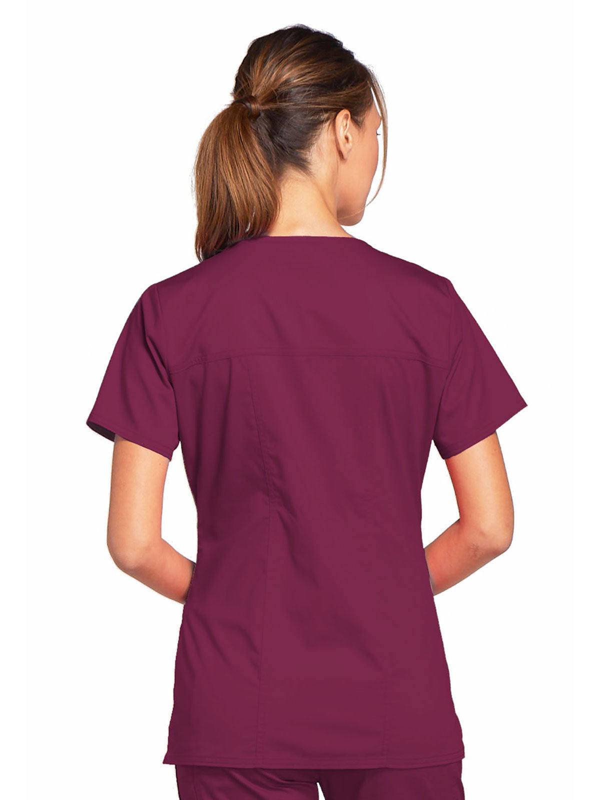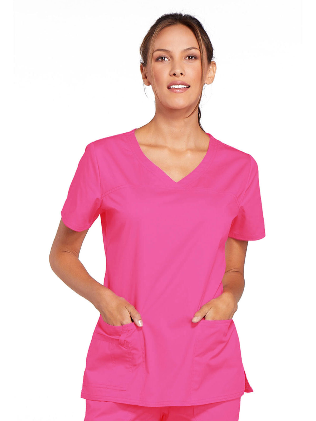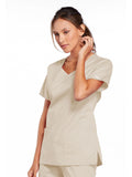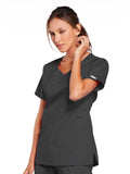 A Modern Classic Cherokee workwear core fit V-neck top features crossover front yokes and patch pockets. The right side pocket has a sectional pocket and I.D. loop. A back yoke, back princess seams, and side vents complete the picture. Center back length: 27".
