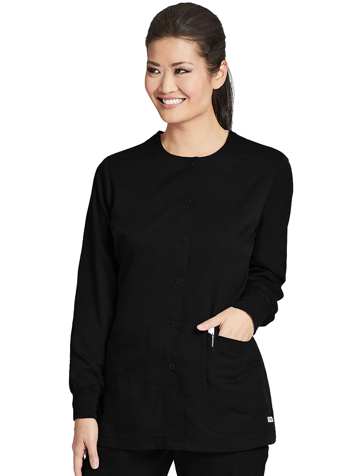 Stay comfortable on chilly mornings, late nights, or just when the office feels a little too cold with this women's Grey's Anatomy Classic warm-up jacket. Sweat-wicking and soft to the touch, this top keeps you dry no matter what your shift brings. Snap buttons make quick changes easy.