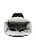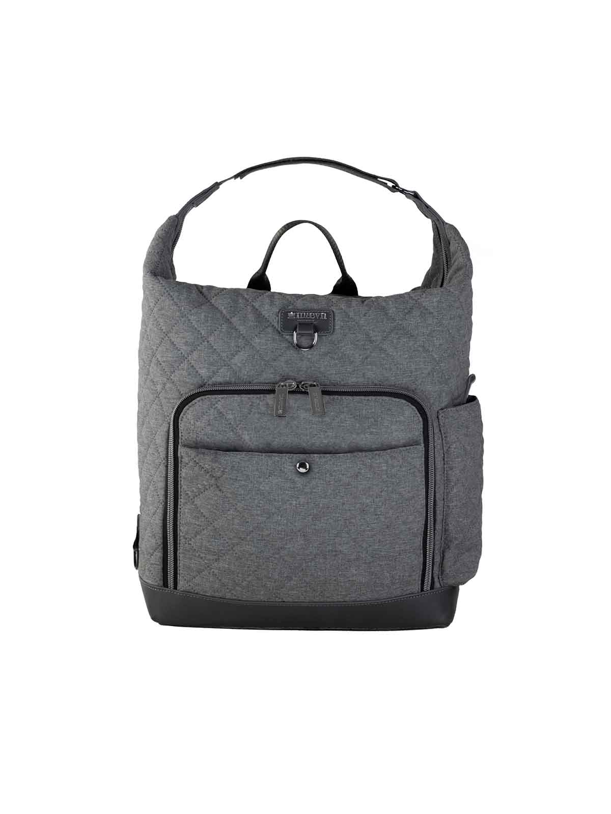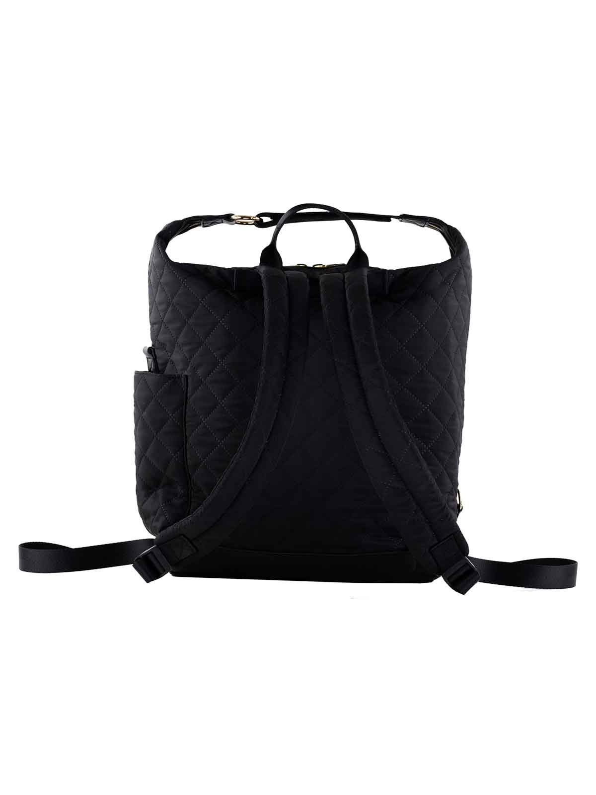 * Plush, water-resistant materials with a decorative quilted texture and vegan leather trim