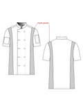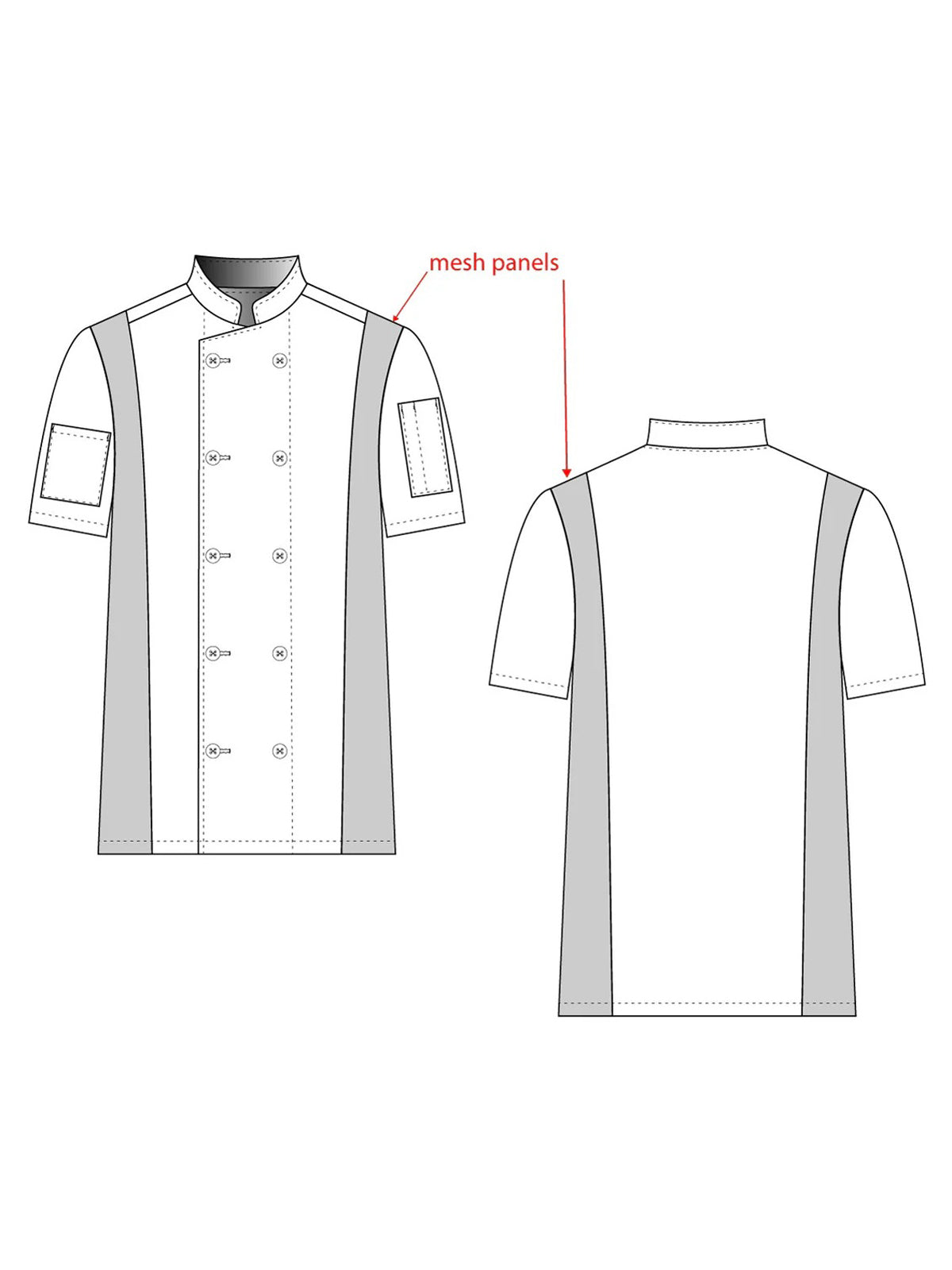 Chef Code Cool Breeze side vent chef coat with mesh vent inlay on each side. Double breasted front with cloth covered buttons, pockets on both sleeves and durable construction. 5oz fine line baby twill, Cotton/Poly.