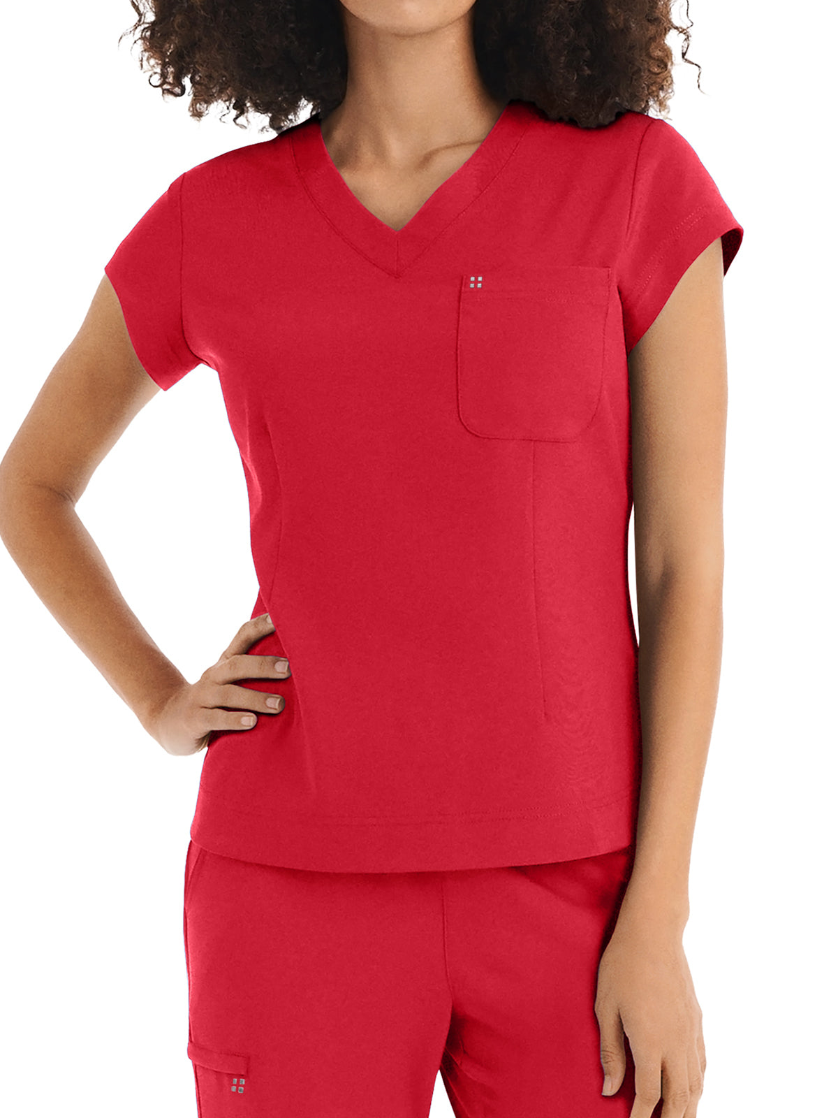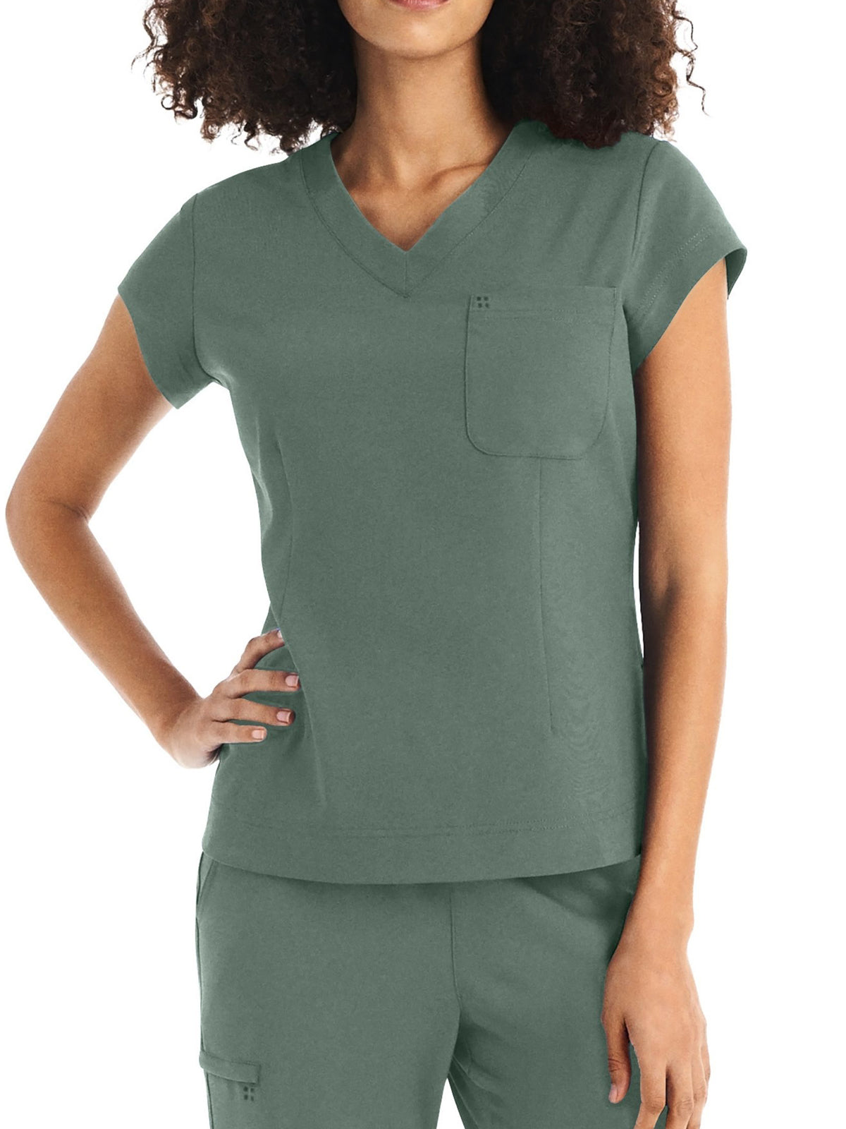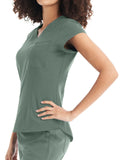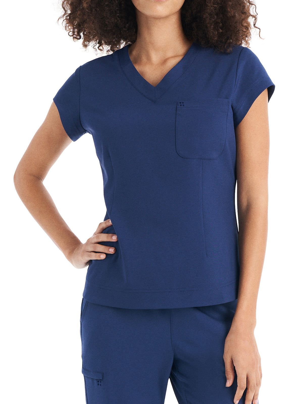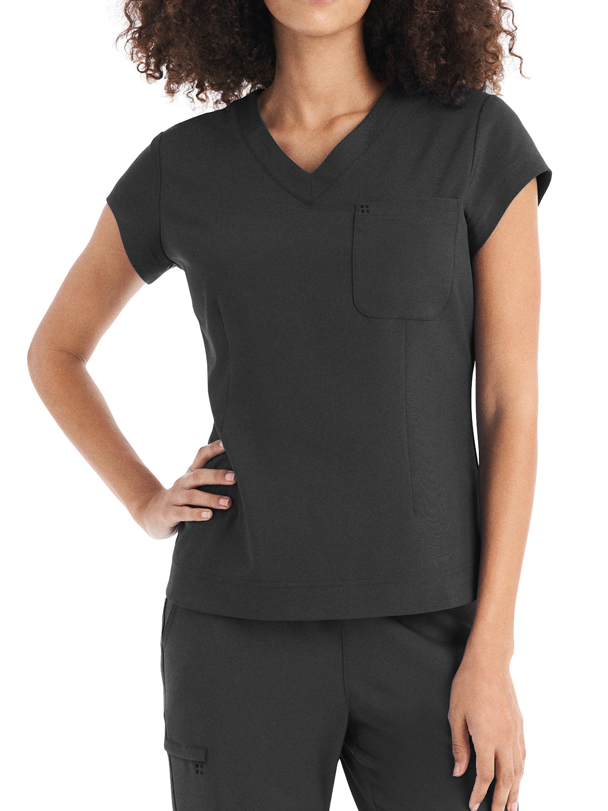 This Modern Fit v-neck top offers a tailored fit with front princess darts and back princess seams. Features a single chest pocket and shirttail hem for an easy tuck-in option. Cap sleeves and back side knit panels offer easy movement and added comfort.