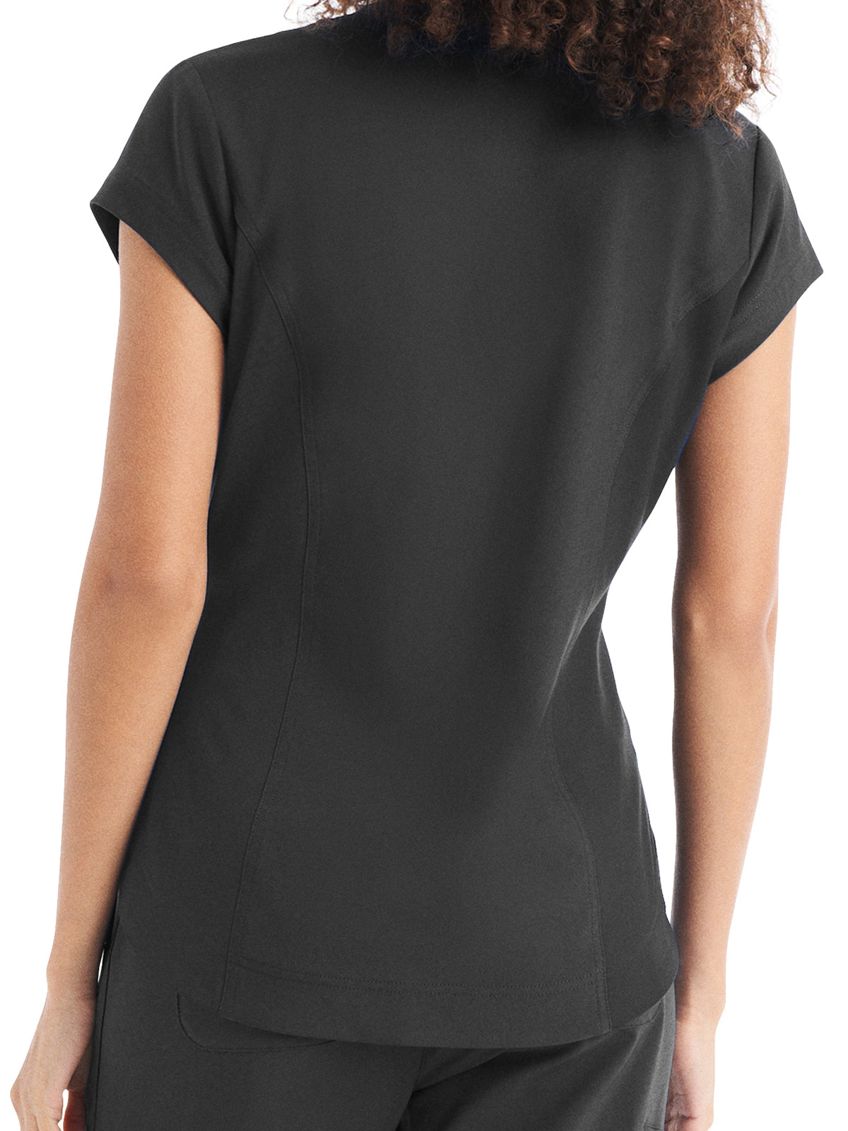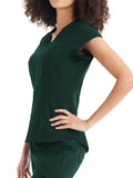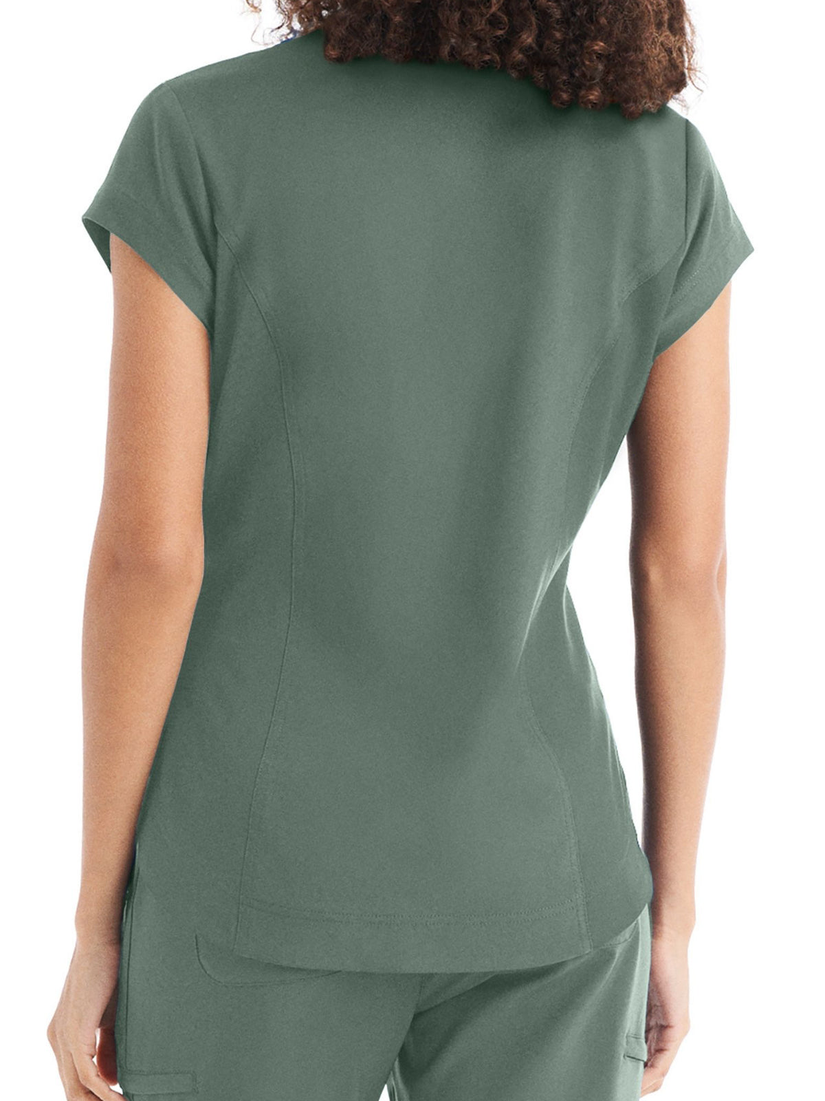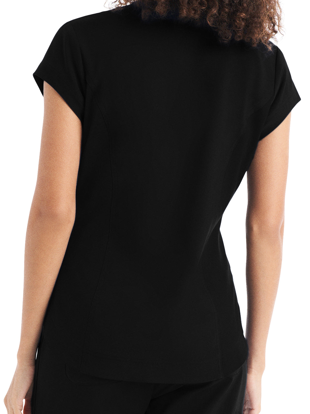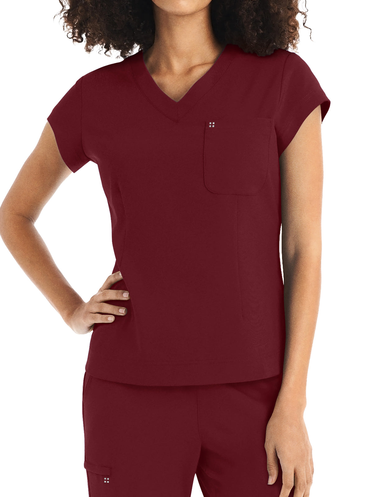 This Modern Fit v-neck top offers a tailored fit with front princess darts and back princess seams. Features a single chest pocket and shirttail hem for an easy tuck-in option. Cap sleeves and back side knit panels offer easy movement and added comfort.