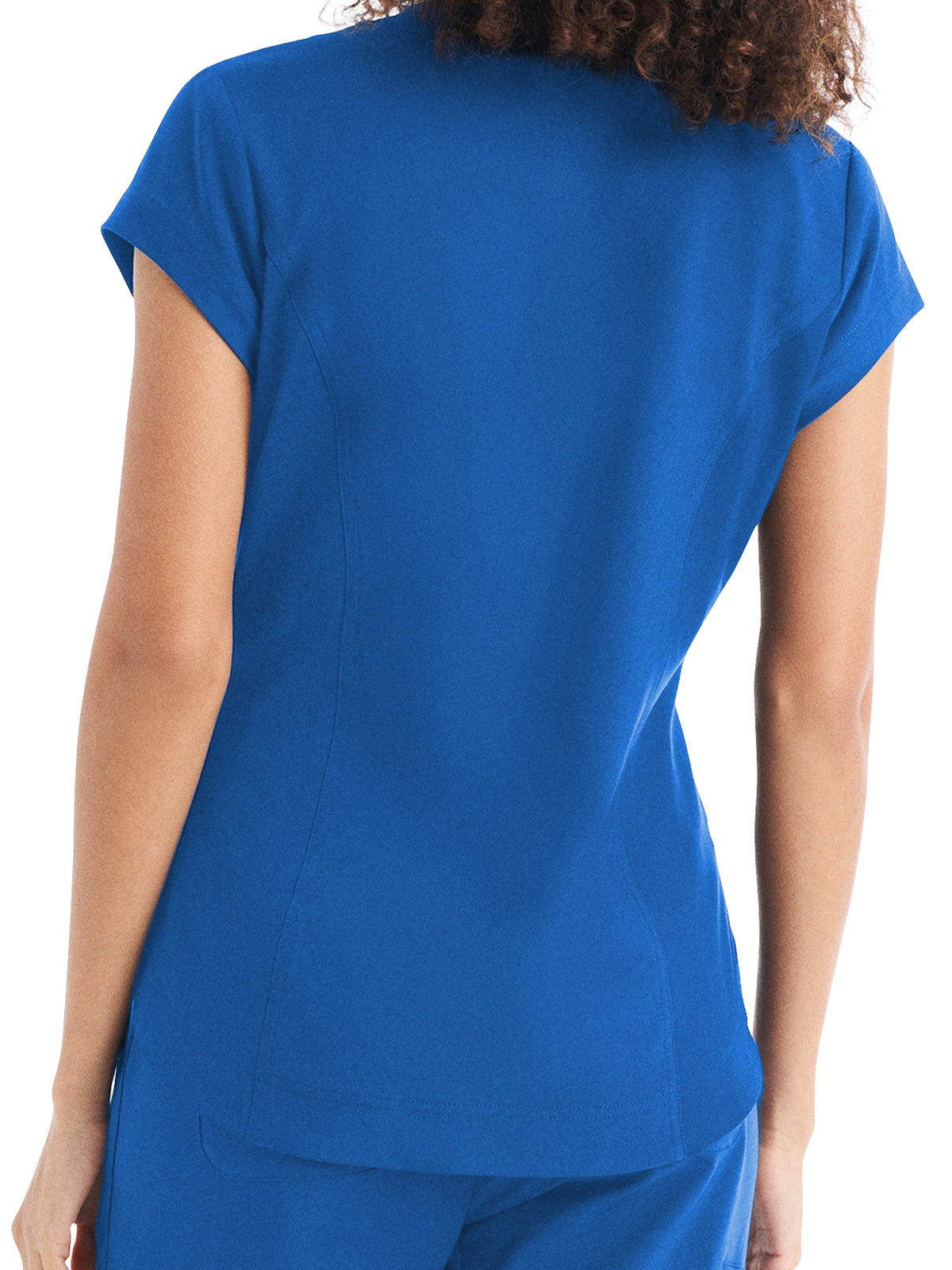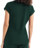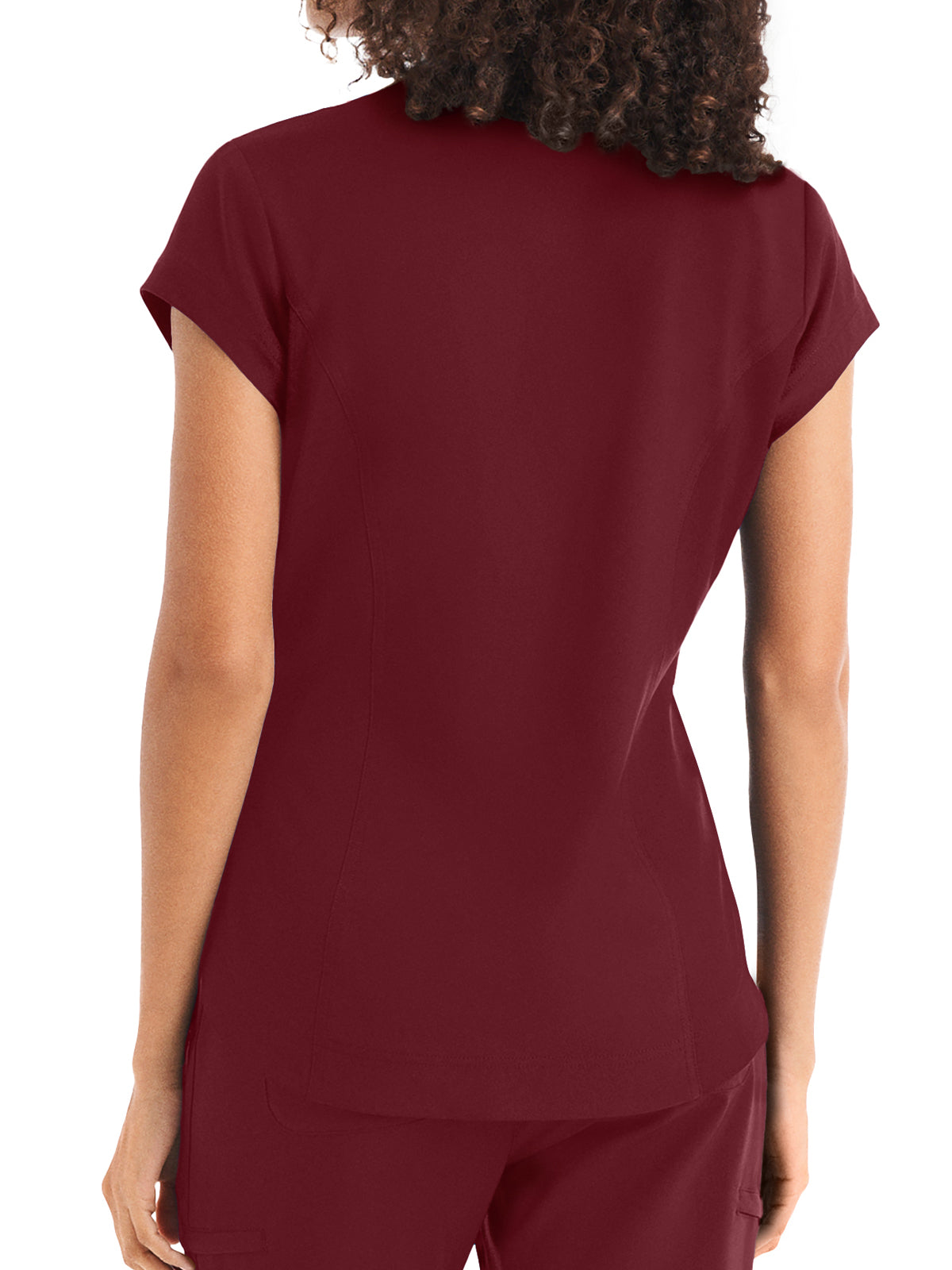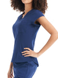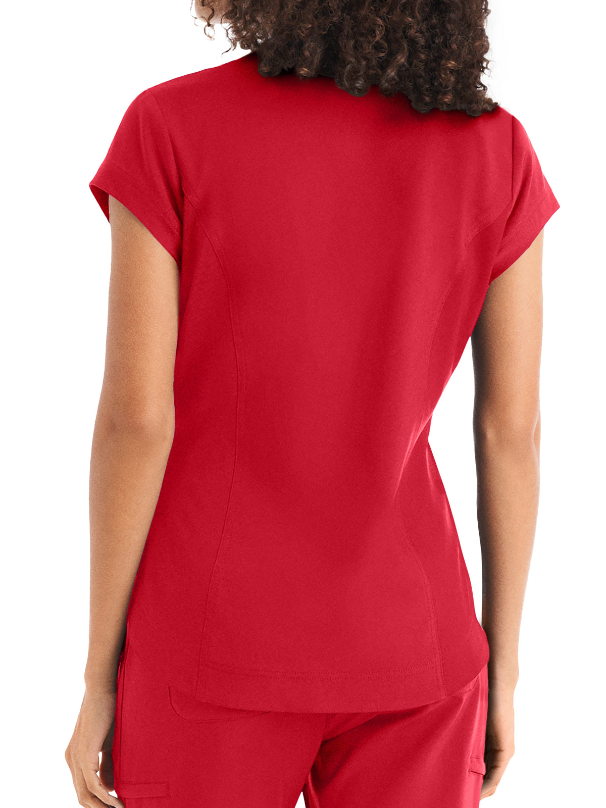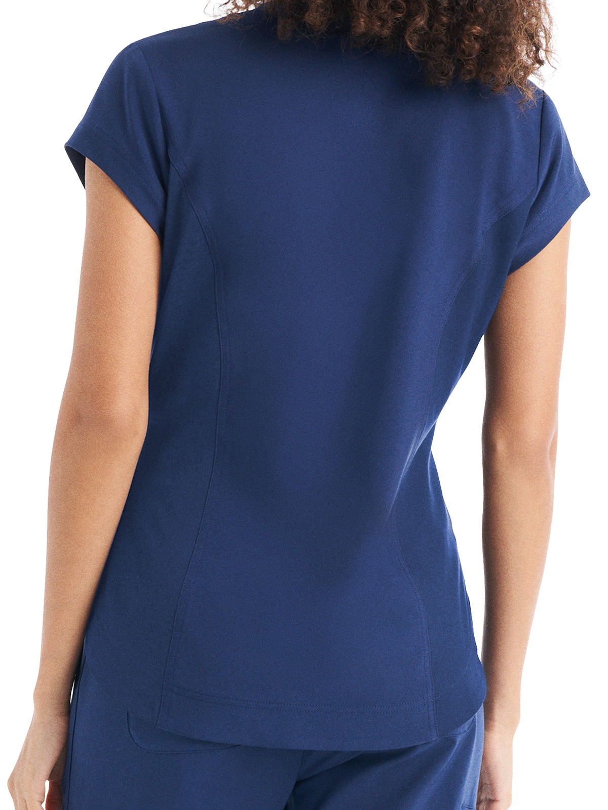 This Modern Fit v-neck top offers a tailored fit with front princess darts and back princess seams. Features a single chest pocket and shirttail hem for an easy tuck-in option. Cap sleeves and back side knit panels offer easy movement and added comfort.