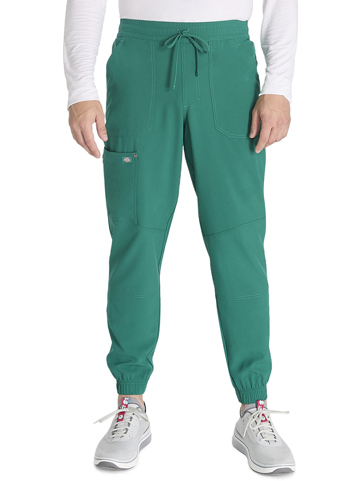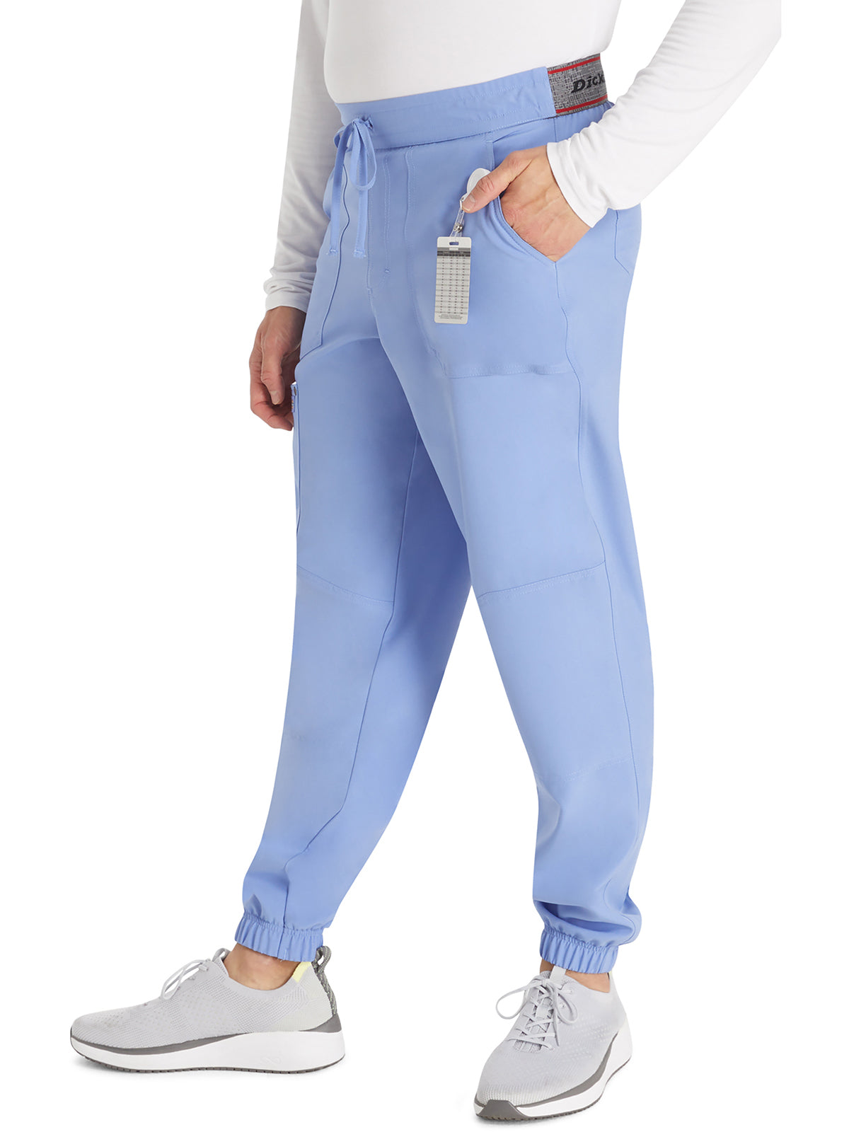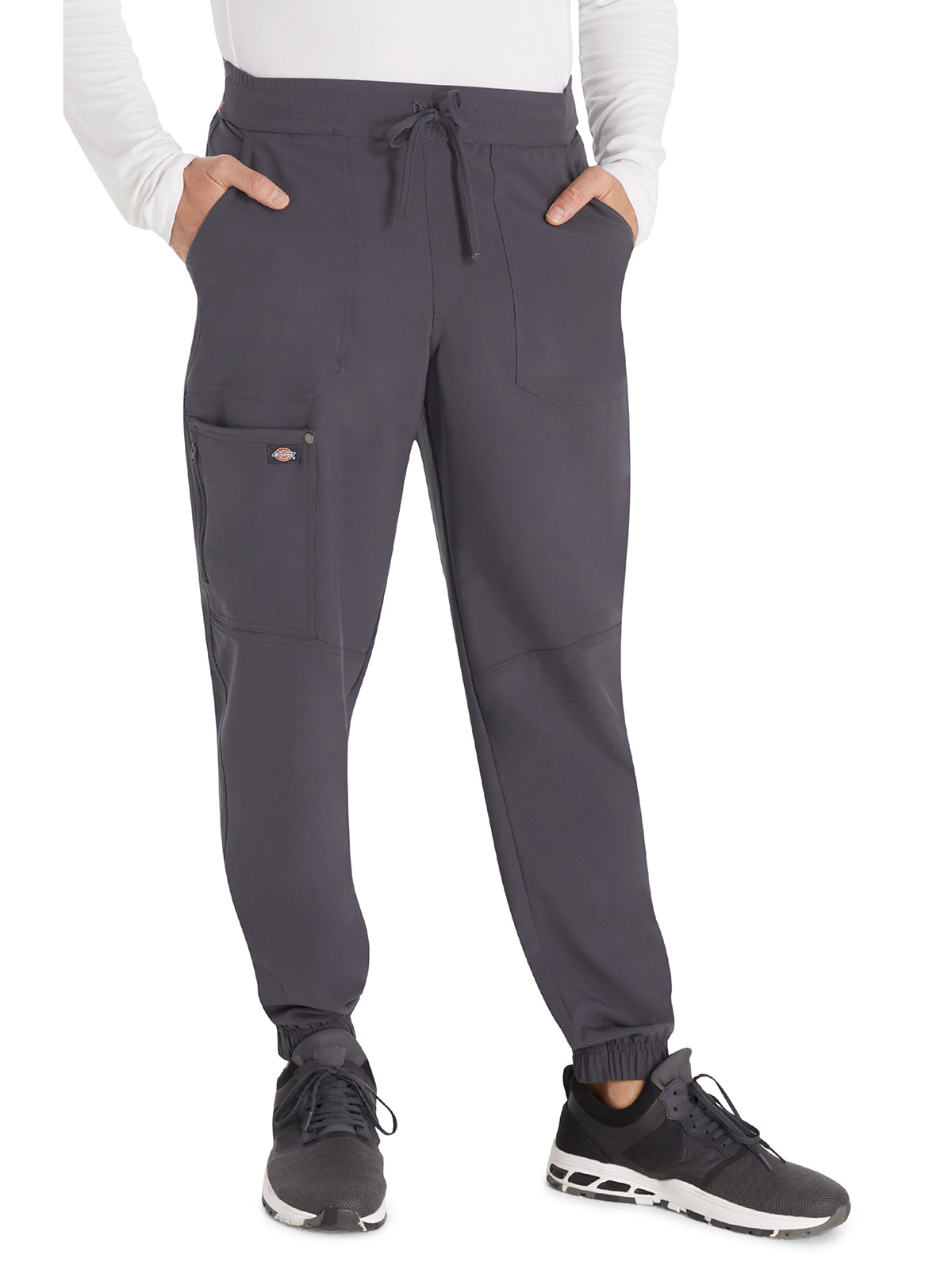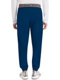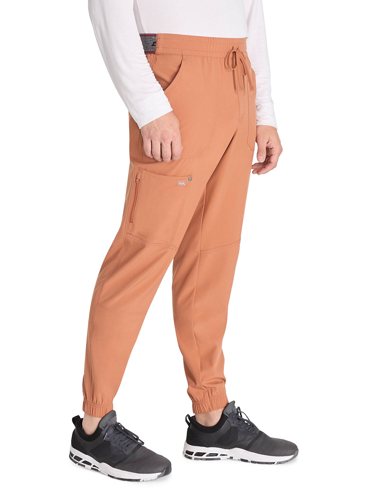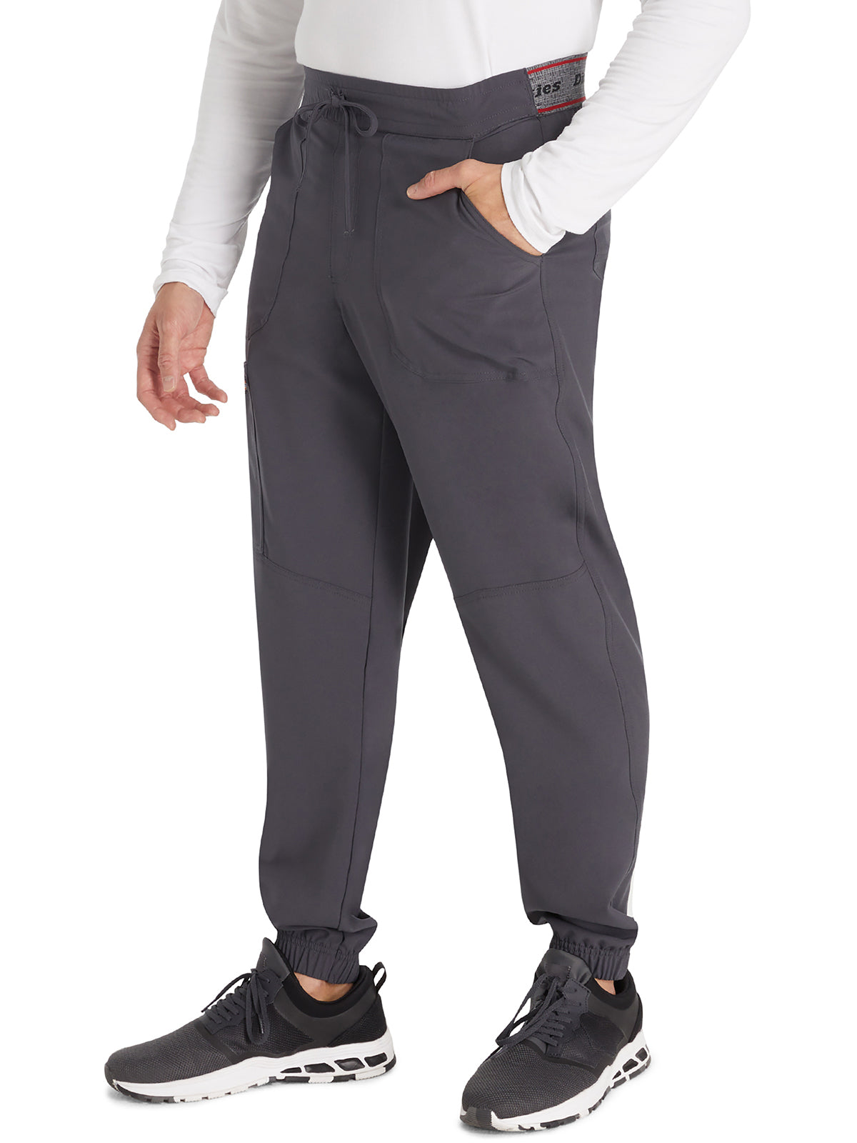 Logo and stitching details upgrade this work-to-weekend Men's fit mid rise jogger. Mock fly with drawstring plus logo elastic on back waist for style and fit. There are six pockets for organized storage: two front pockets, double cargo pocket (one top entry, one zipper closure), and two back patch pockets with decorative stitching. Stylized knee seams and decorative leg stitching add design interest. Decorative topstitching on all seams and elasticized cuffs completes the look. Tapered jogger leg, 10 ½" opening. Inseam: 30 ½"