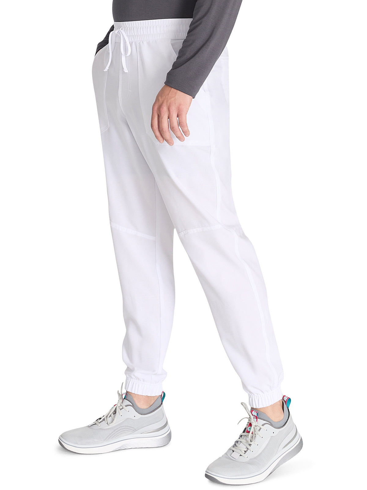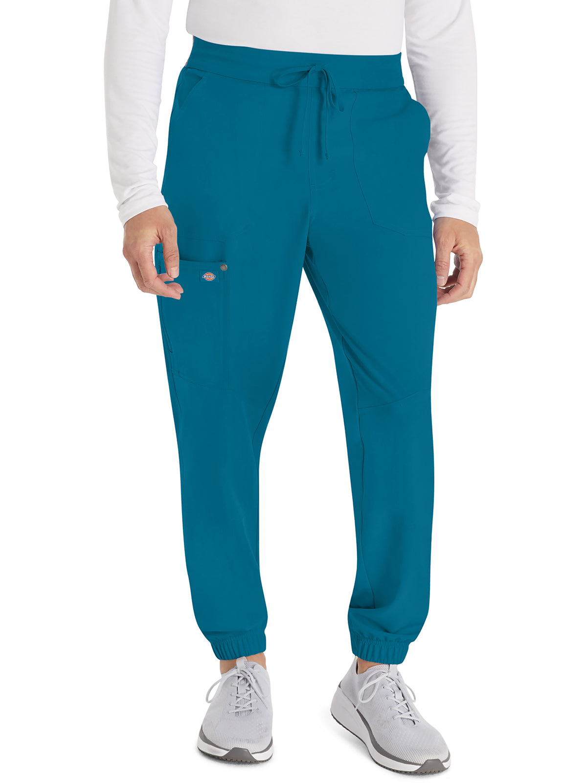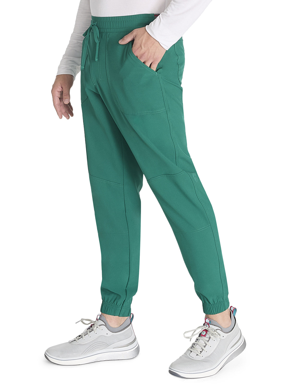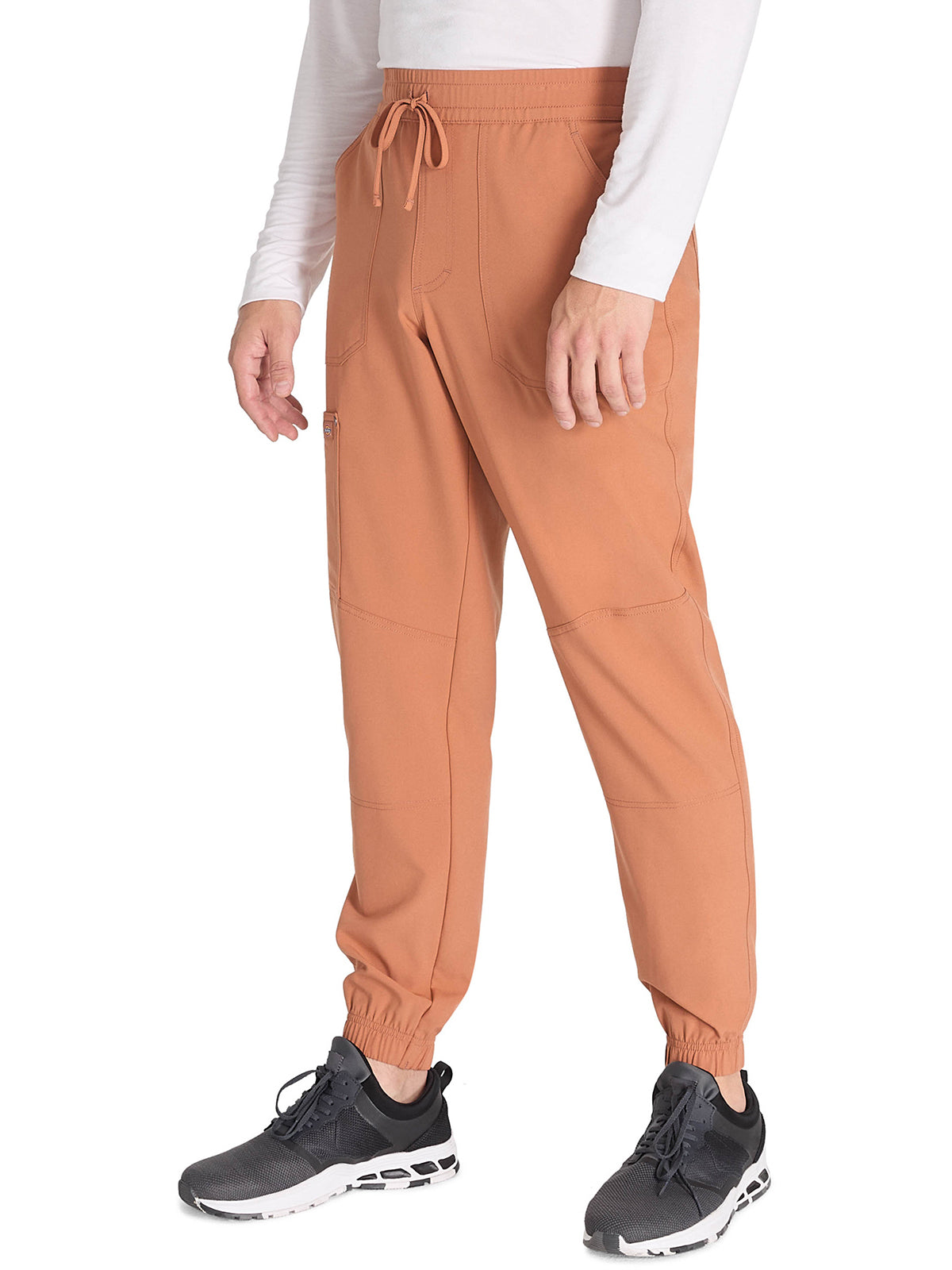 Logo and stitching details upgrade this work-to-weekend Men's fit mid rise jogger. Mock fly with drawstring plus logo elastic on back waist for style and fit. There are six pockets for organized storage: two front pockets, double cargo pocket (one top entry, one zipper closure), and two back patch pockets with decorative stitching. Stylized knee seams and decorative leg stitching add design interest. Decorative topstitching on all seams and elasticized cuffs completes the look. Tapered jogger leg, 10 ½" opening. Inseam: 30 ½"