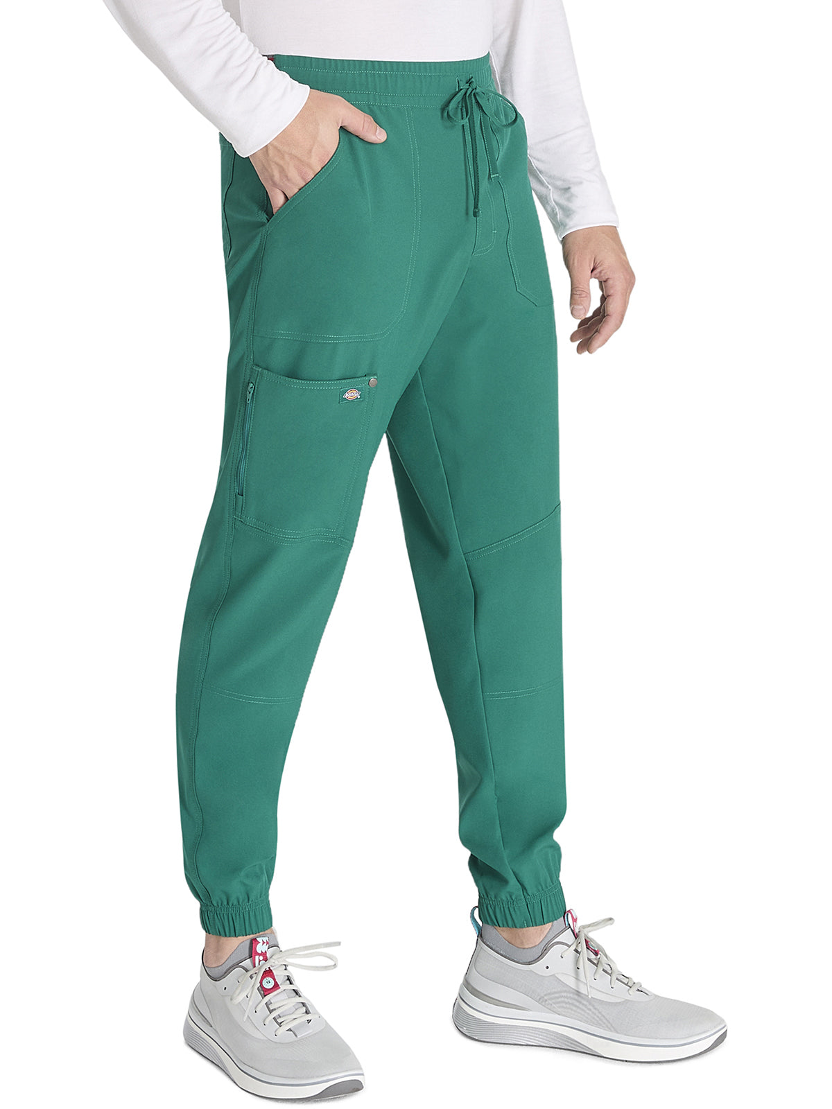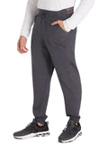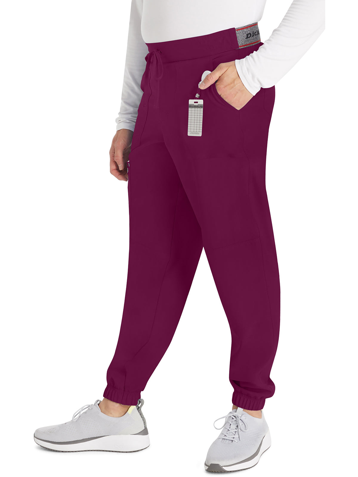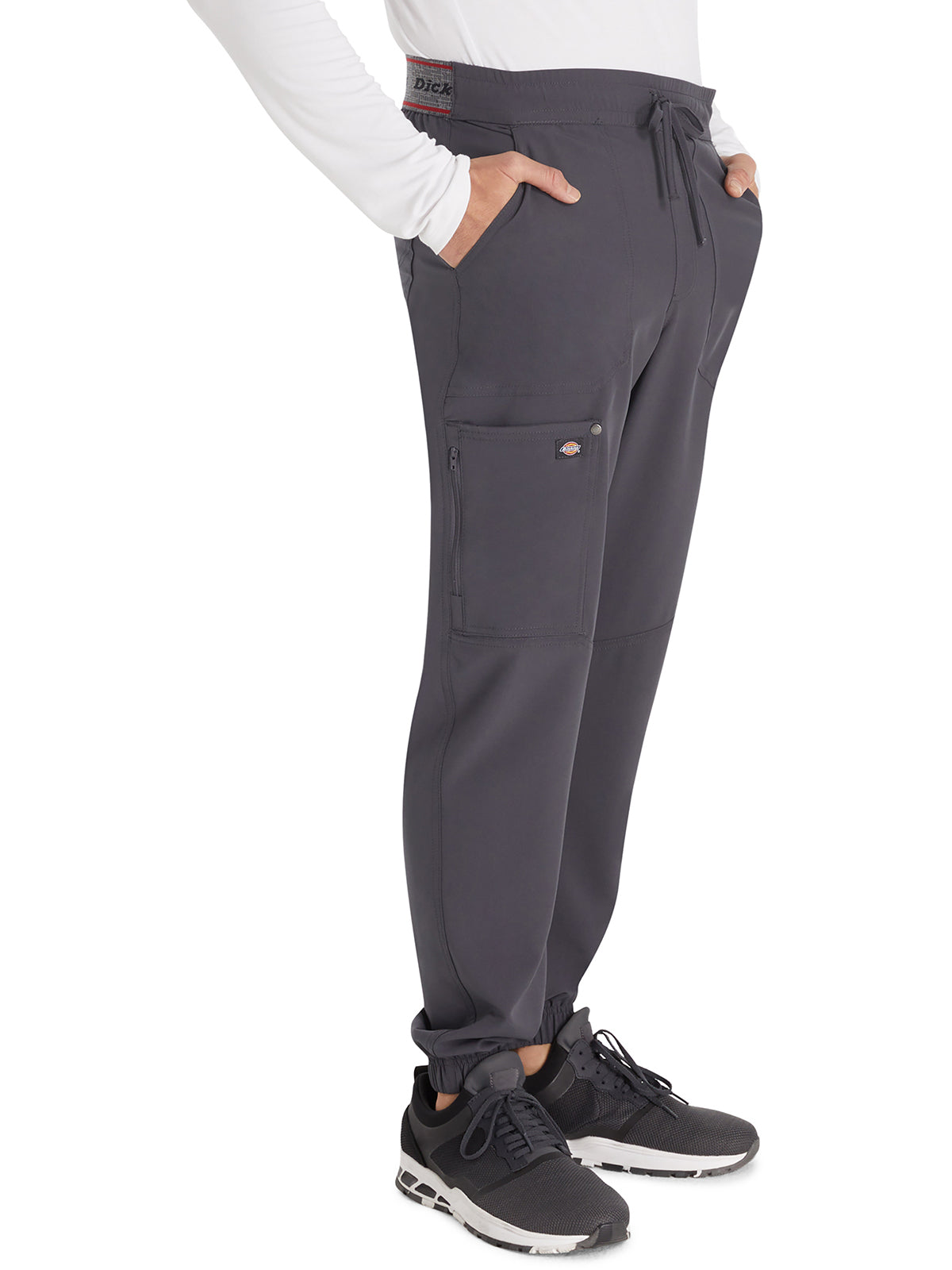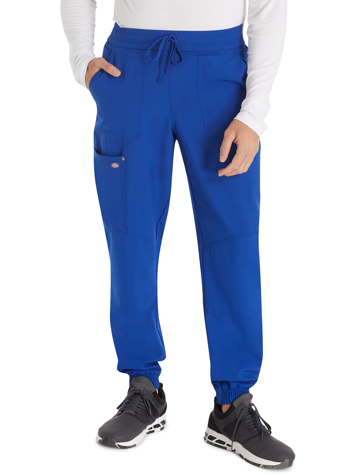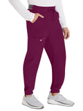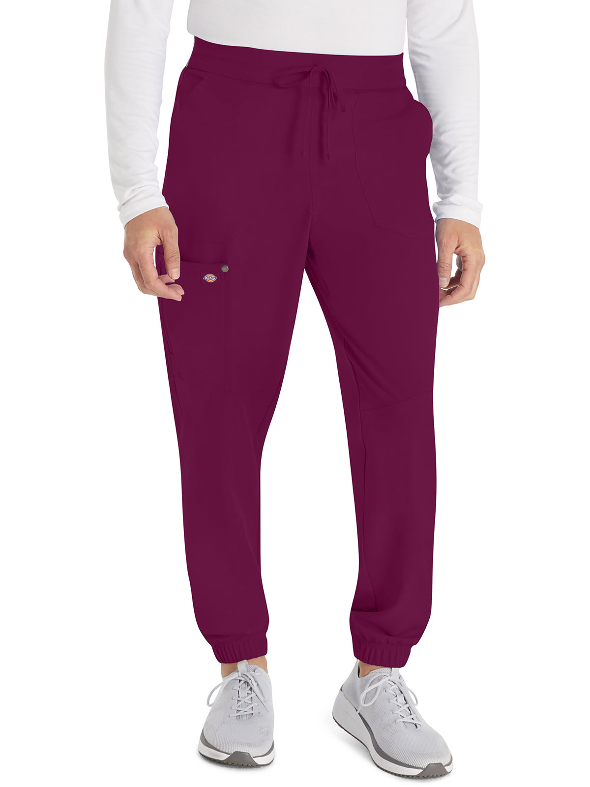 Logo and stitching details upgrade this work-to-weekend Men's fit mid rise jogger. Mock fly with drawstring plus logo elastic on back waist for style and fit. There are six pockets for organized storage: two front pockets, double cargo pocket (one top entry, one zipper closure), and two back patch pockets with decorative stitching. Stylized knee seams and decorative leg stitching add design interest. Decorative topstitching on all seams and elasticized cuffs completes the look. Tapered jogger leg, 10 ½" opening. Inseam: 30 ½"