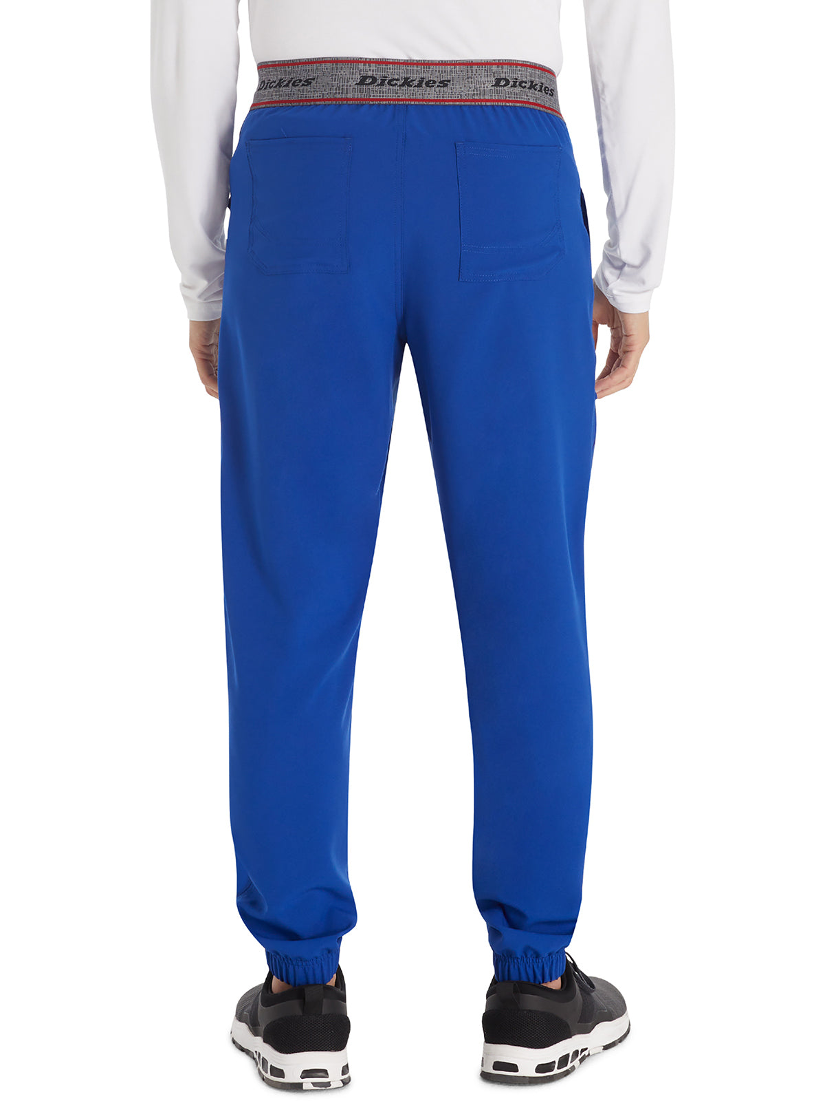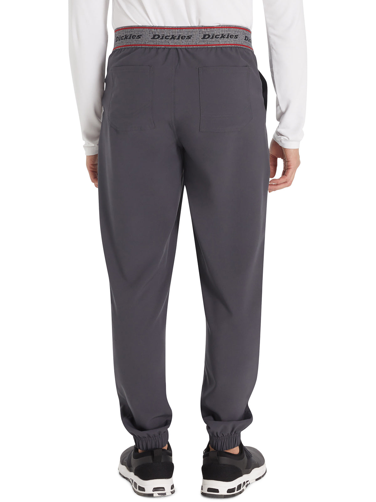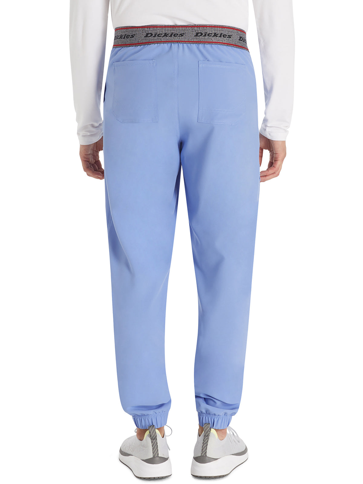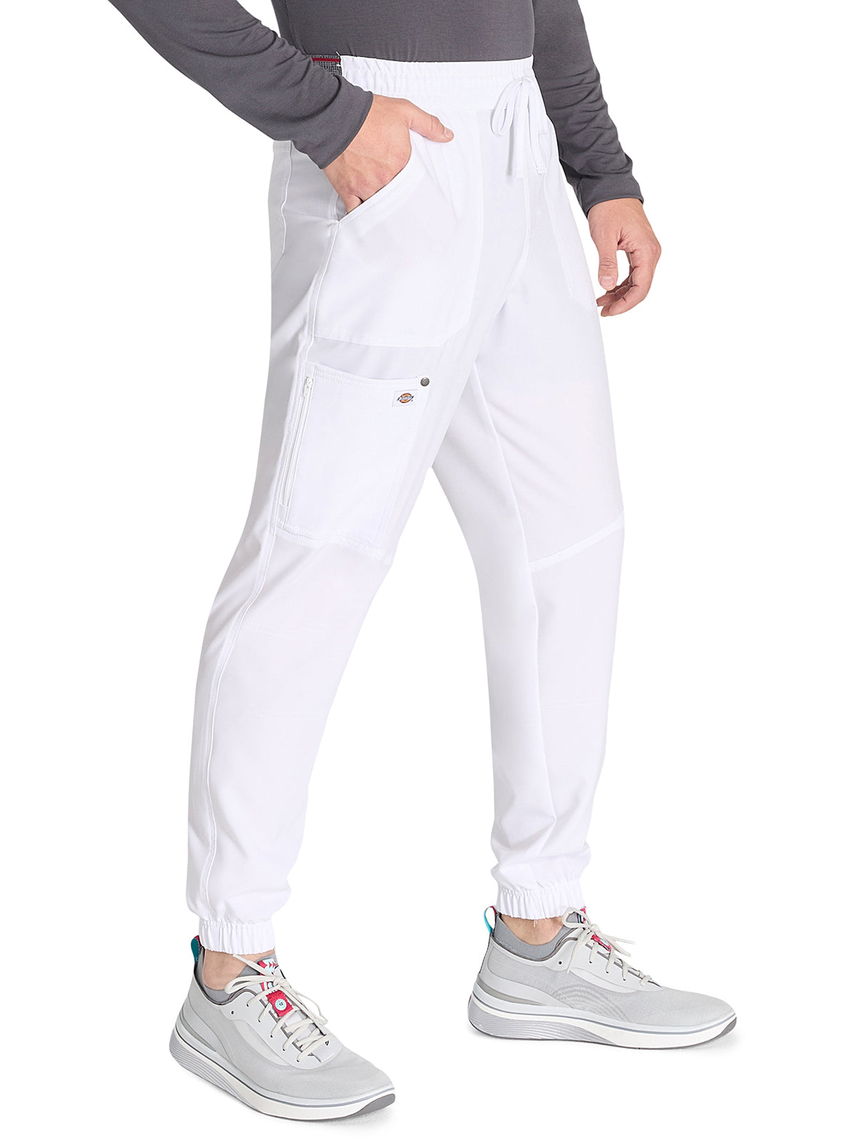 Logo and stitching details upgrade this work-to-weekend Men's fit mid rise jogger. Mock fly with drawstring plus logo elastic on back waist for style and fit. There are six pockets for organized storage: two front pockets, double cargo pocket (one top entry, one zipper closure), and two back patch pockets with decorative stitching. Stylized knee seams and decorative leg stitching add design interest. Decorative topstitching on all seams and elasticized cuffs completes the look. Tapered jogger leg, 10 ½" opening. Inseam: 30 ½"