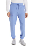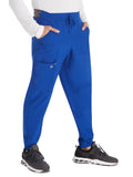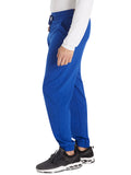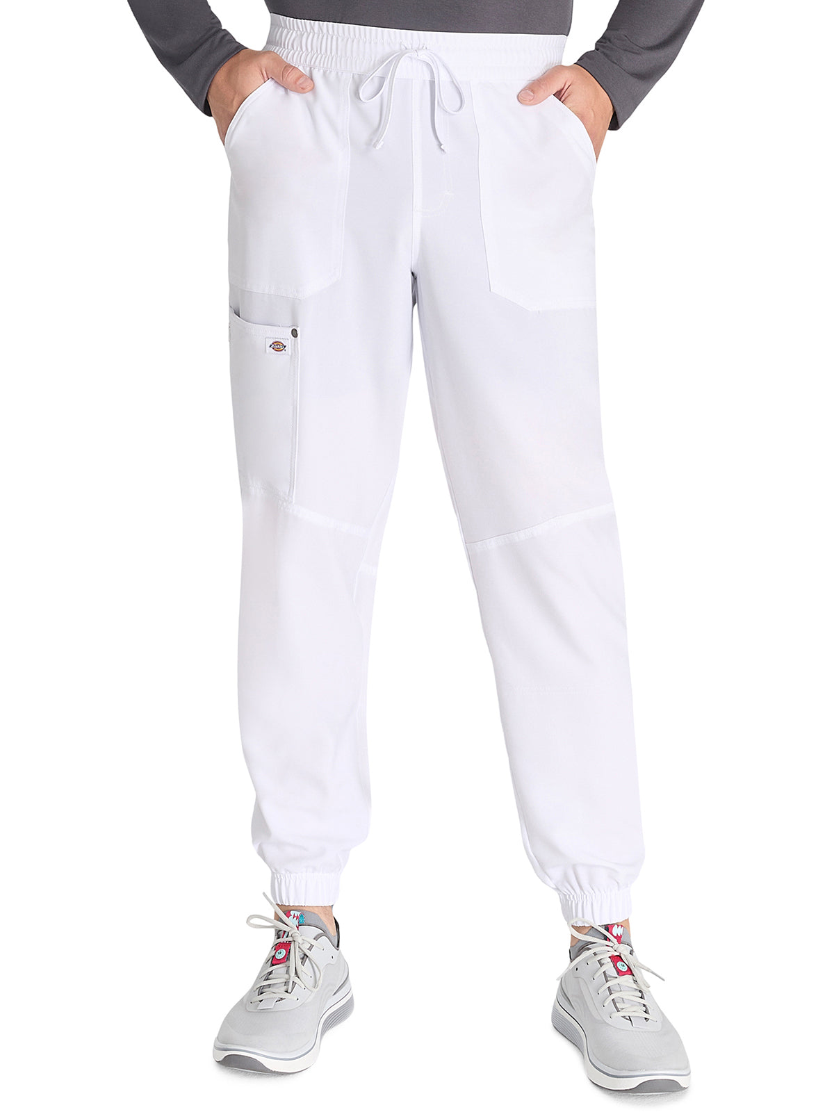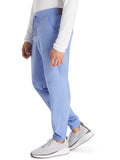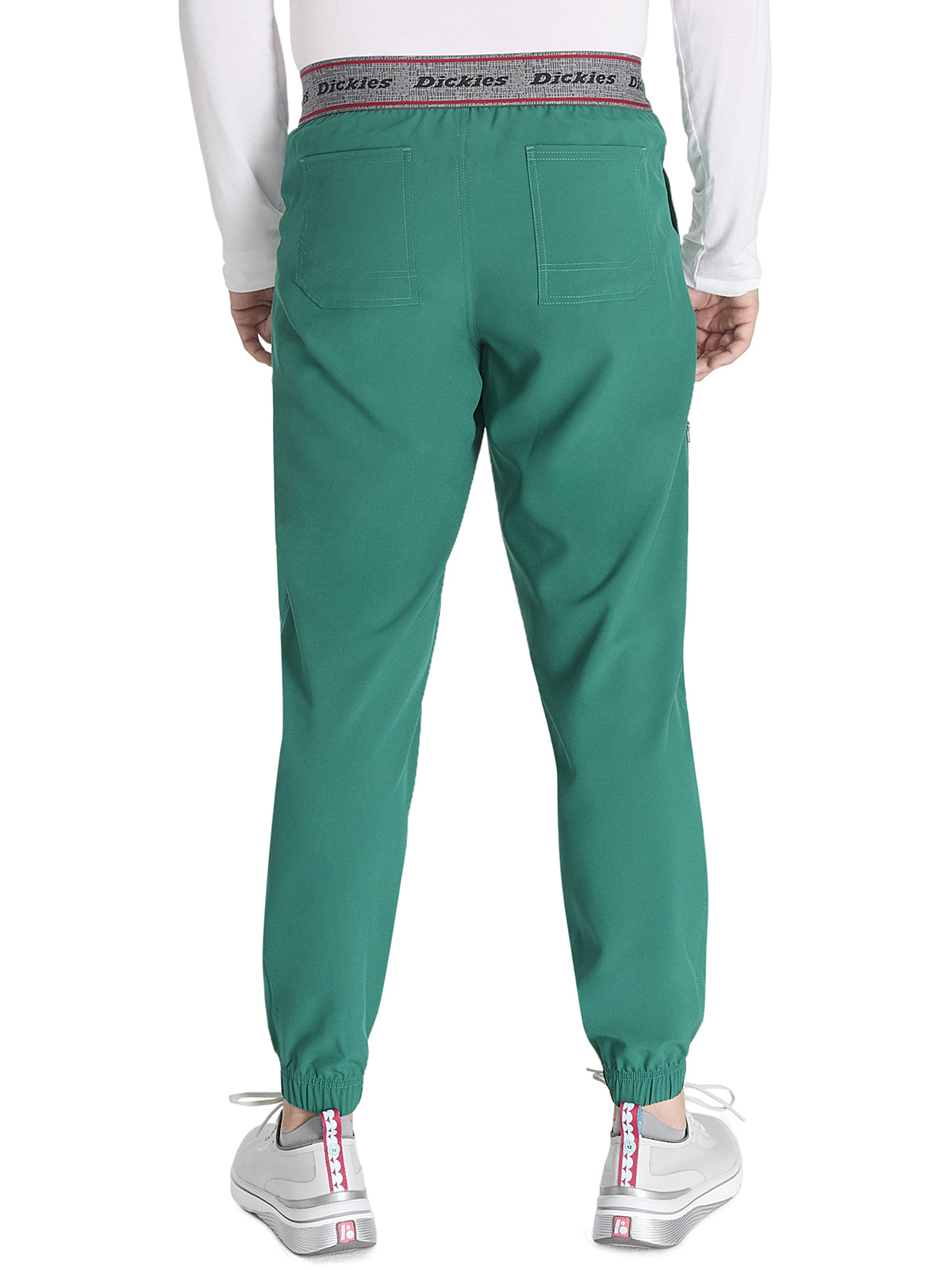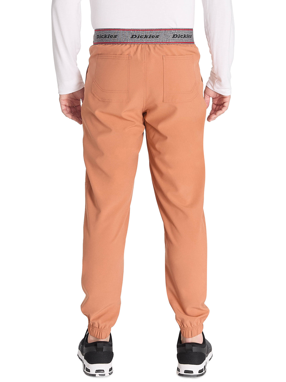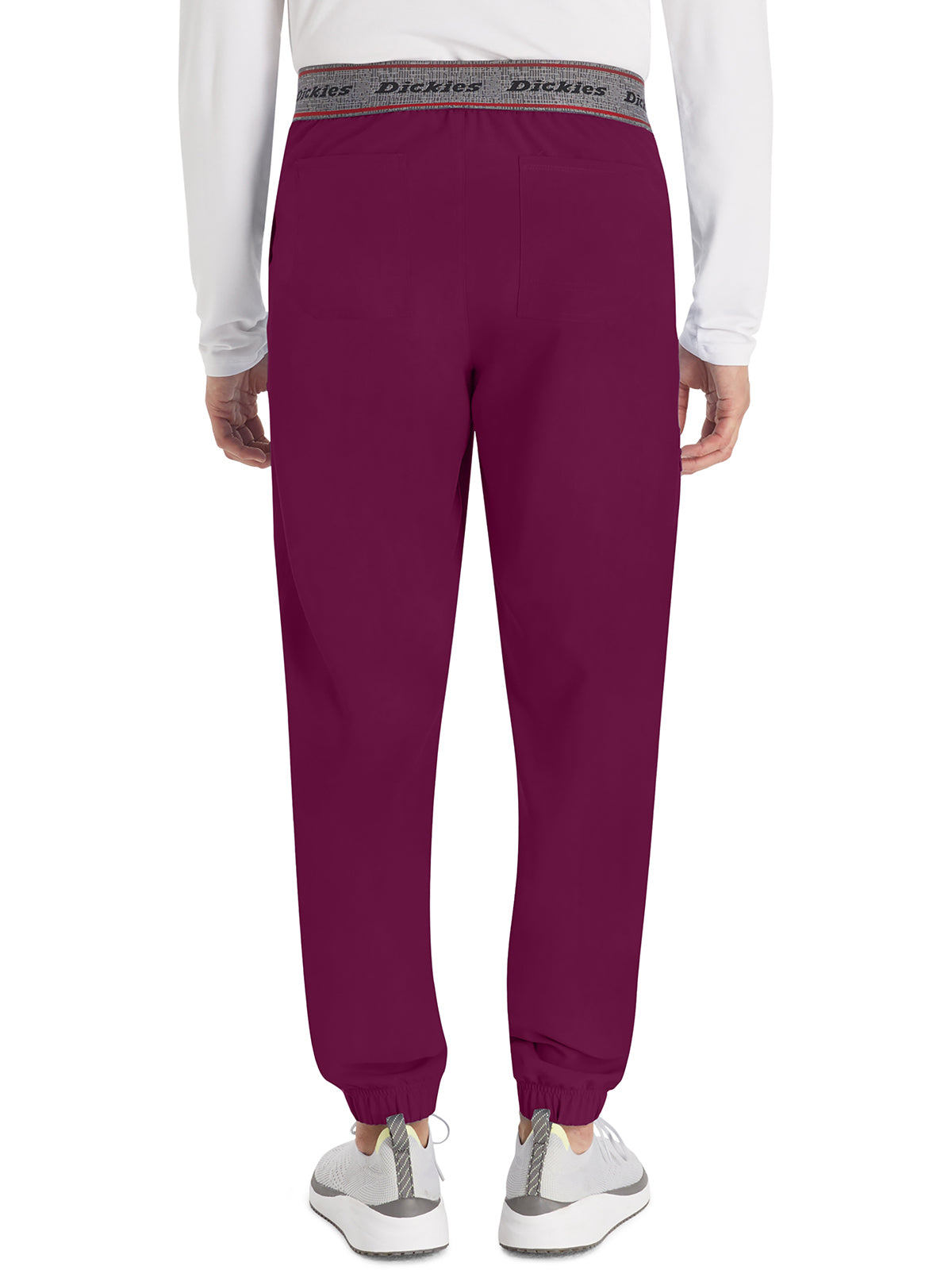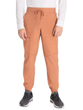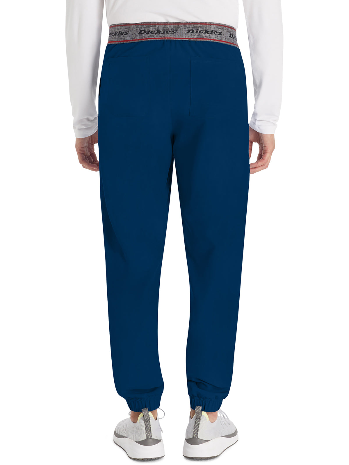Logo and stitching details upgrade this work-to-weekend Men's fit mid rise jogger. Mock fly with drawstring plus logo elastic on back waist for style and fit. There are six pockets for organized storage: two front pockets, double cargo pocket (one top entry, one zipper closure), and two back patch pockets with decorative stitching. Stylized knee seams and decorative leg stitching add design interest. Decorative topstitching on all seams and elasticized cuffs completes the look. Tapered jogger leg, 10 ½" opening. Inseam: 30 ½"