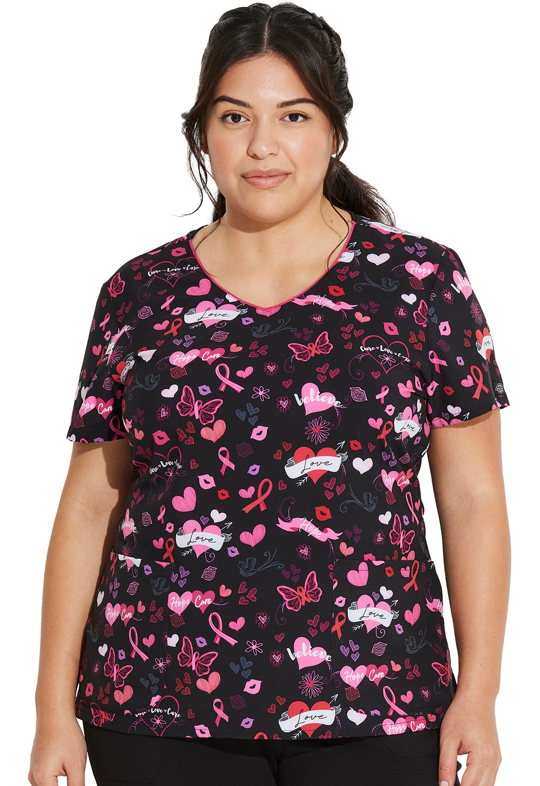 A contemporary fit v-neck print top features two patch pockets, back darts for fit and shaping, and side vents. Center back length: 26".