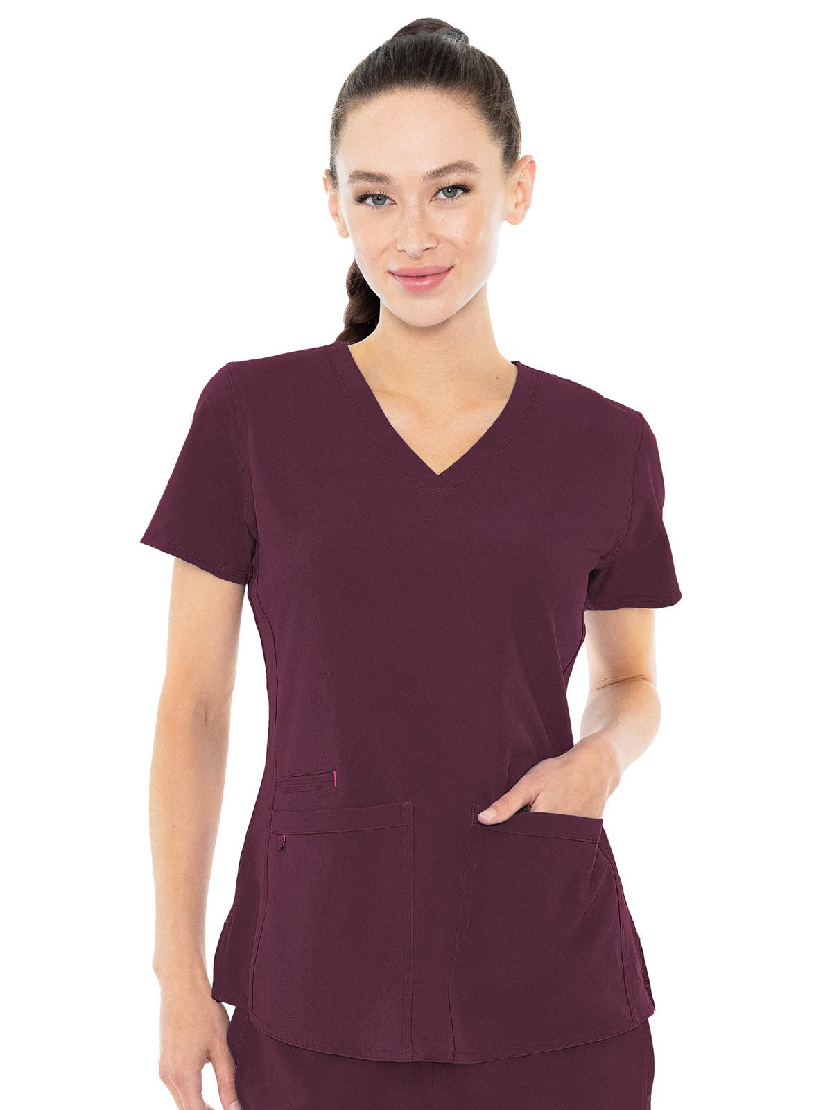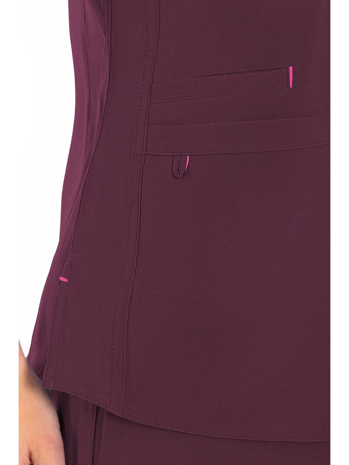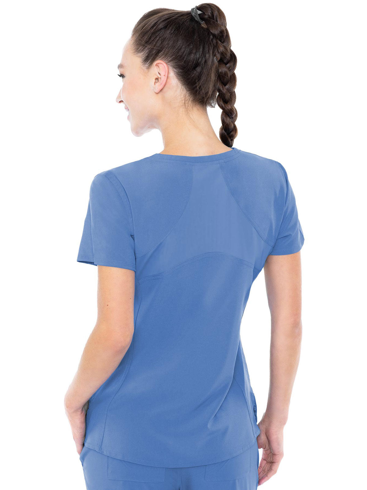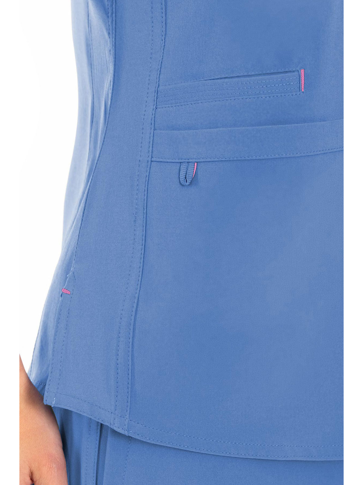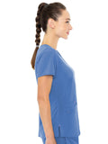 A curved hemline adds more coverage to the Energy by Med Couture Women's Serena V-Neck Racerback Shirttail Solid Scrub Top. Multiple pockets give you storage options for every item.