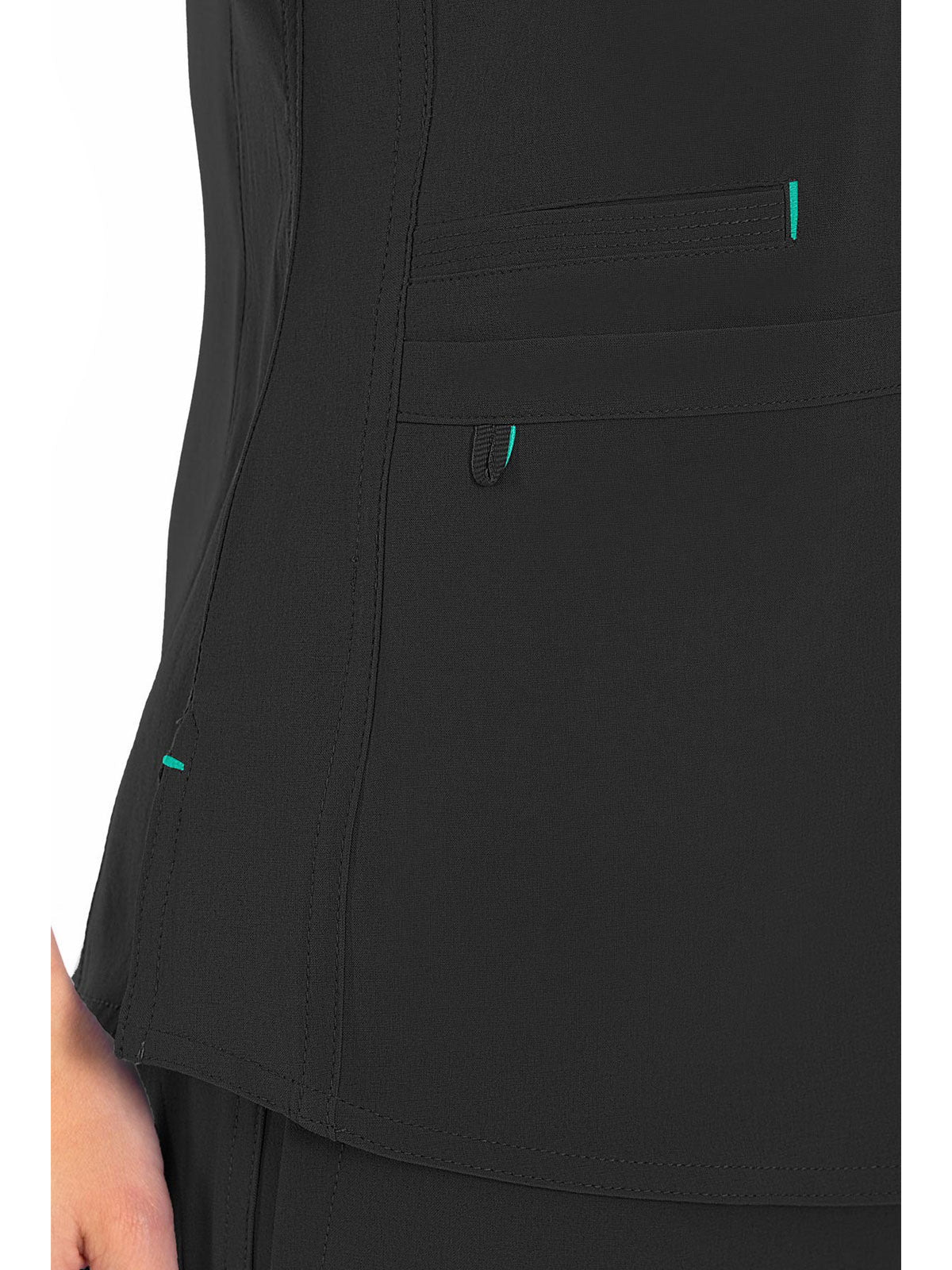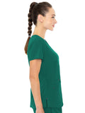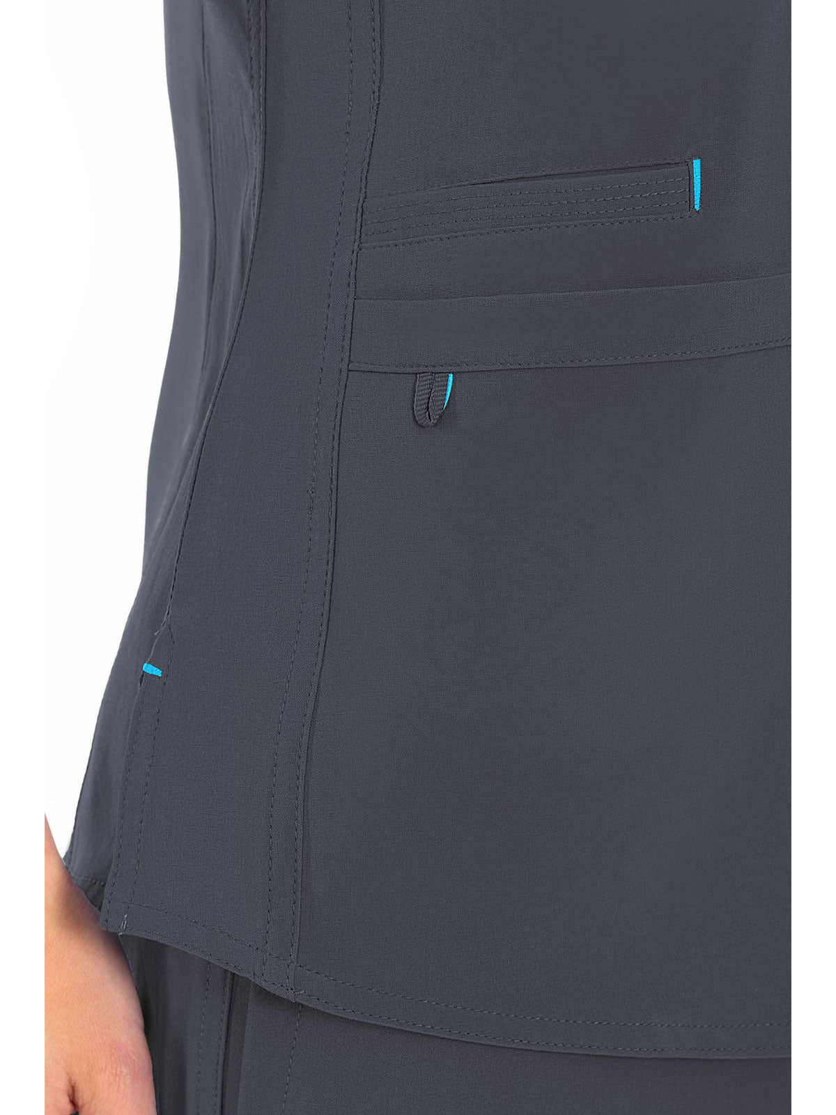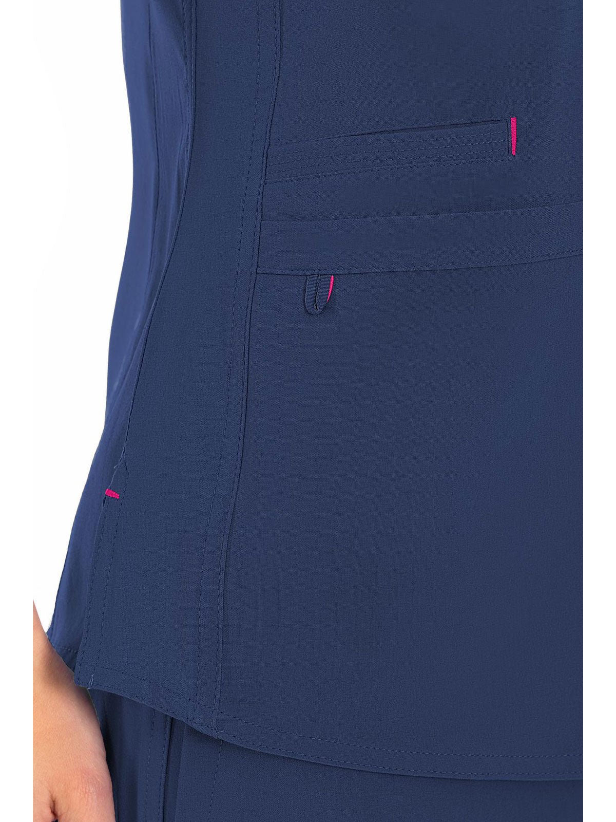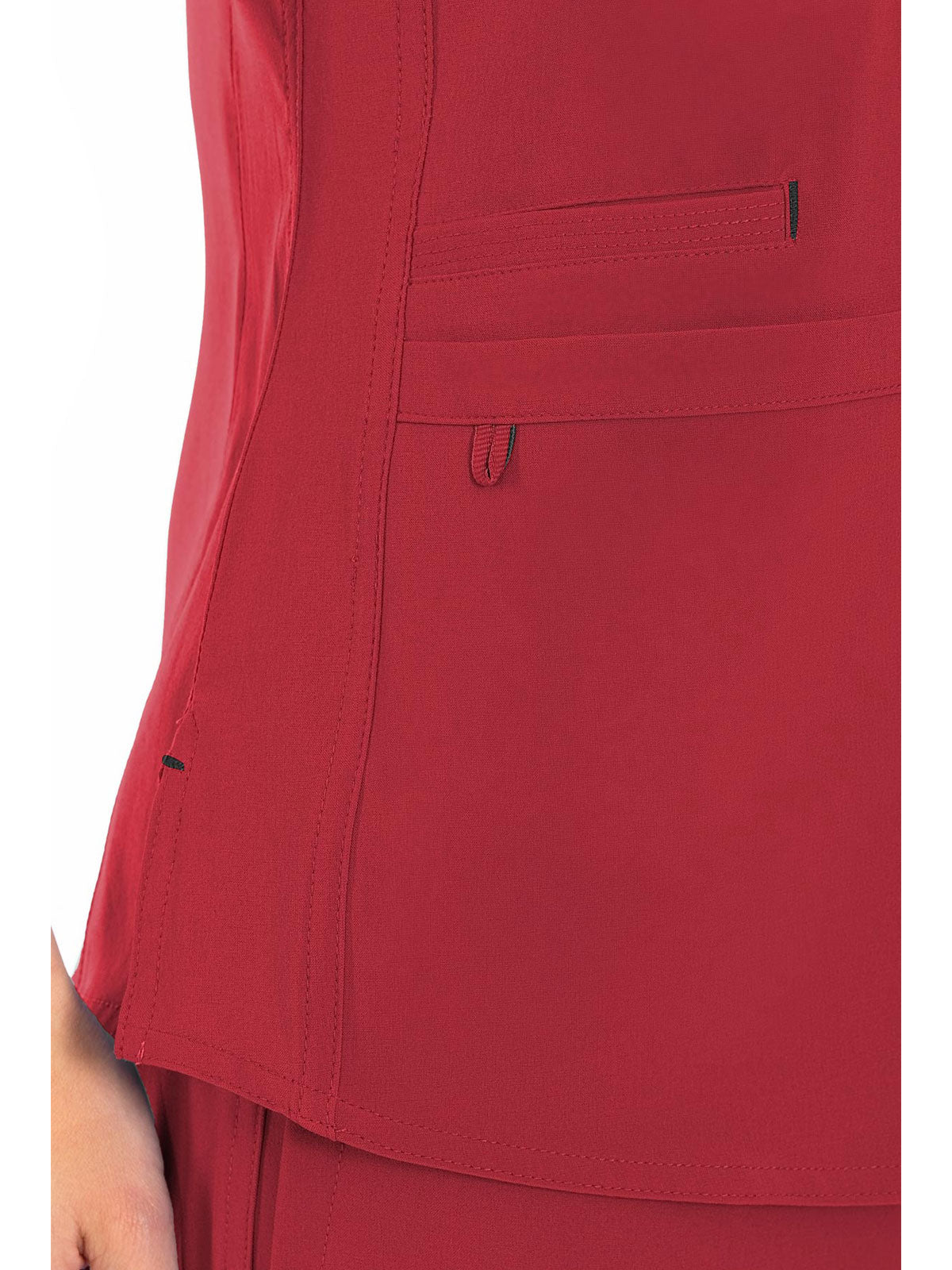 A curved hemline adds more coverage to the Energy by Med Couture Women's Serena V-Neck Racerback Shirttail Solid Scrub Top. Multiple pockets give you storage options for every item.