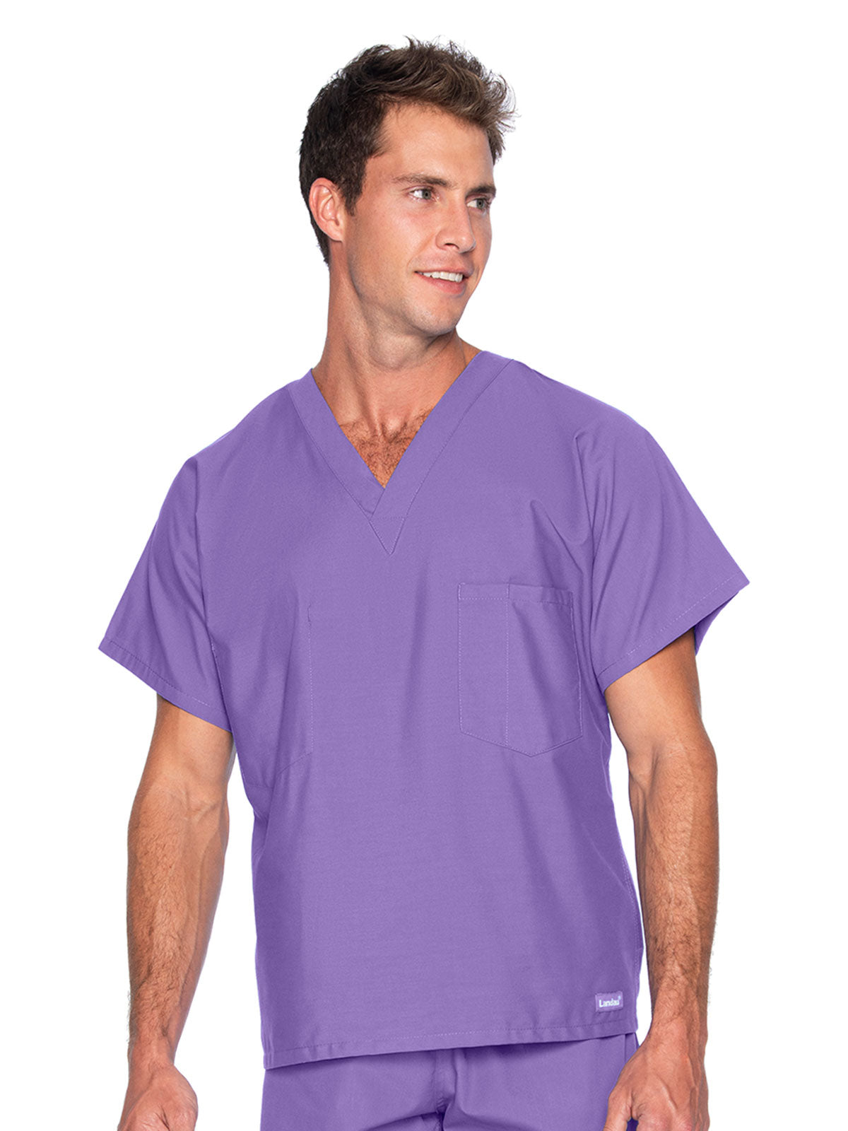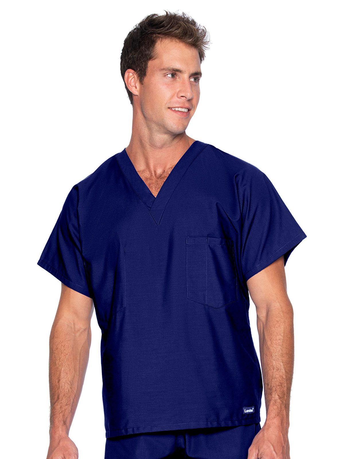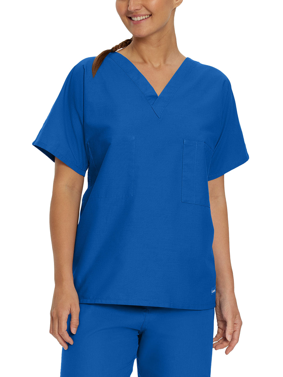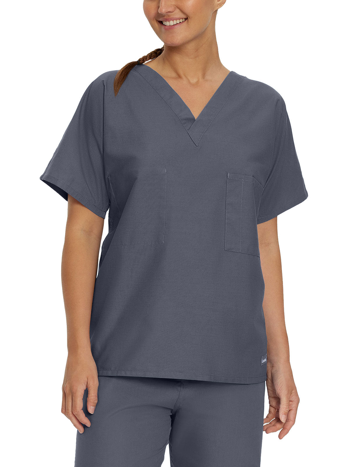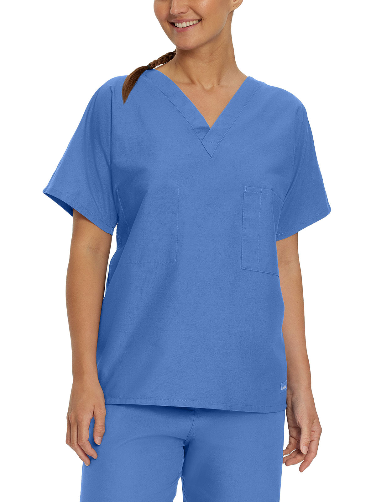 Landau Scrubs move with you all day long. The 7502 is a reversible, unisex V-neck top with reinforced neck facing, dolman sleeves and a breast pocket on both sides. Made of polyester/cotton fabric.