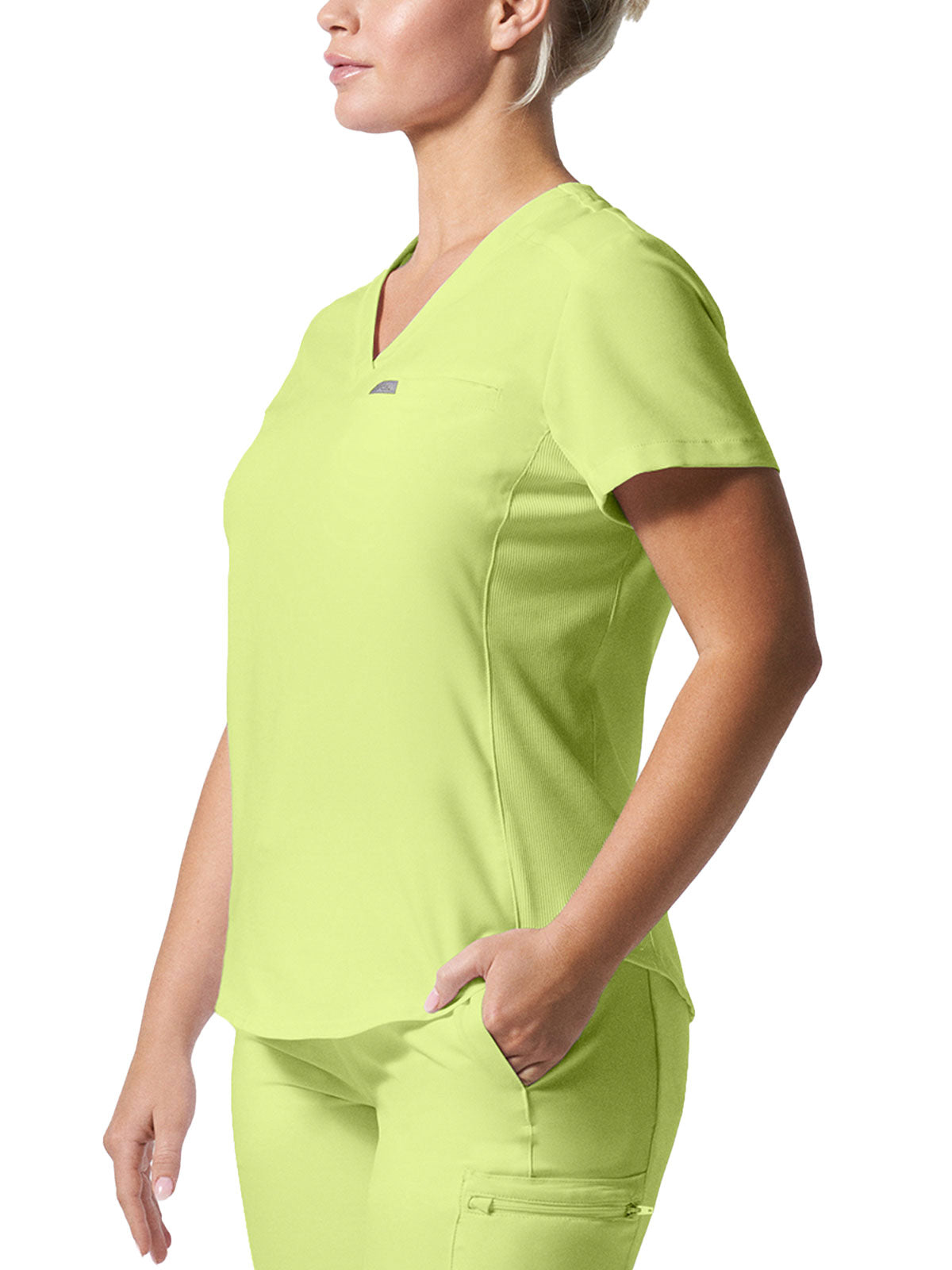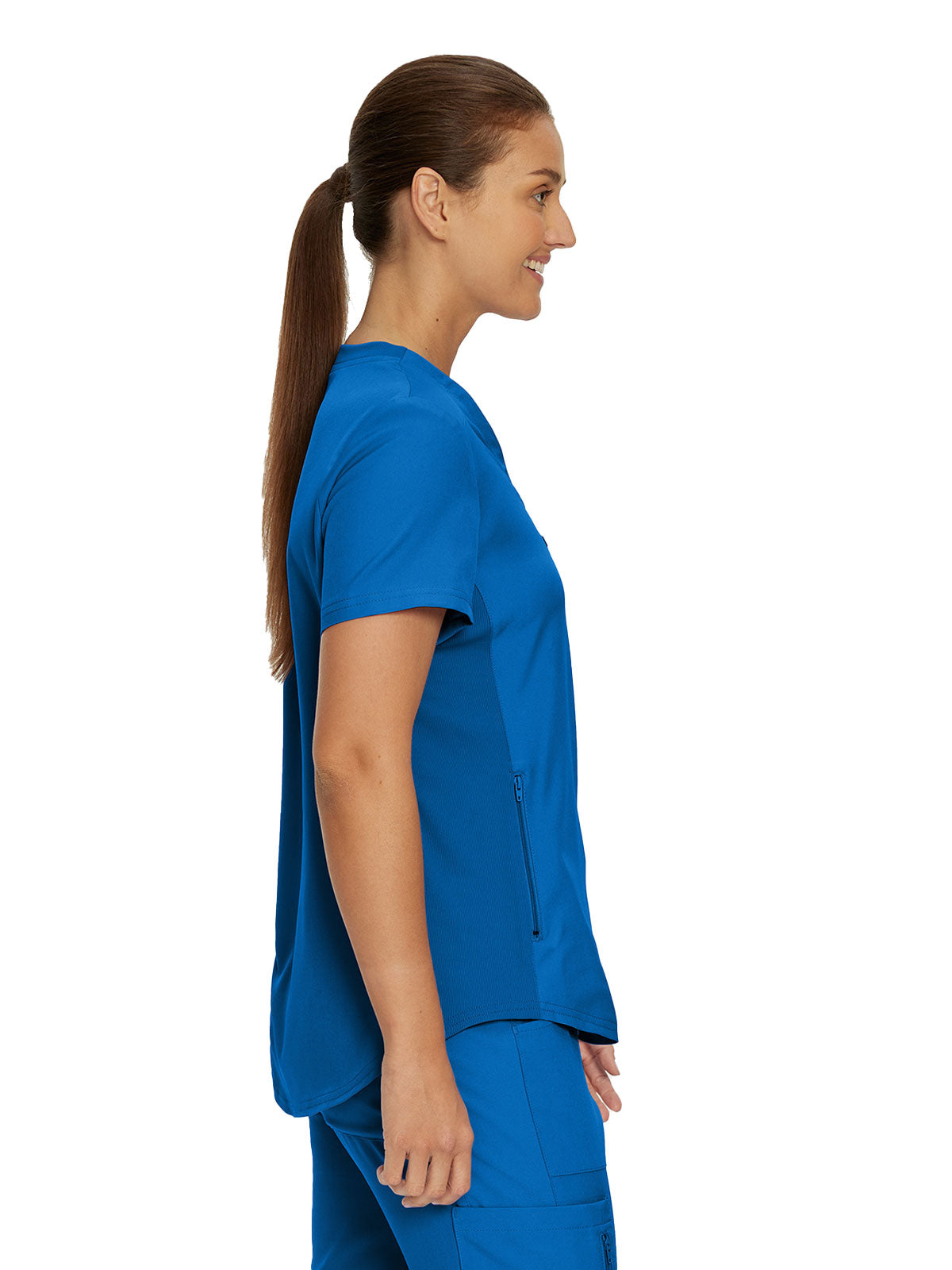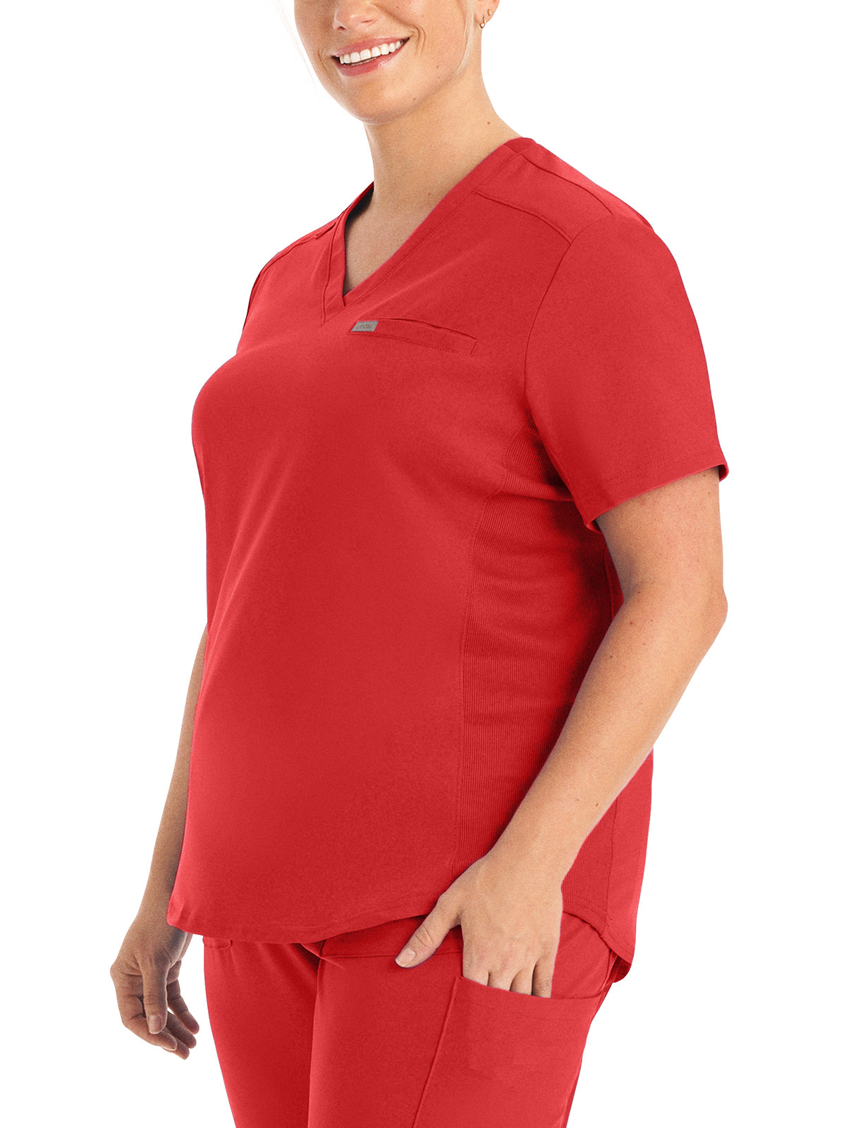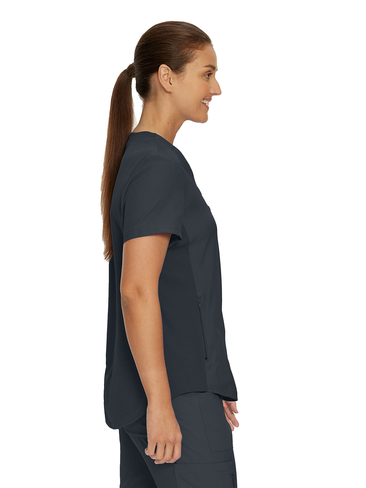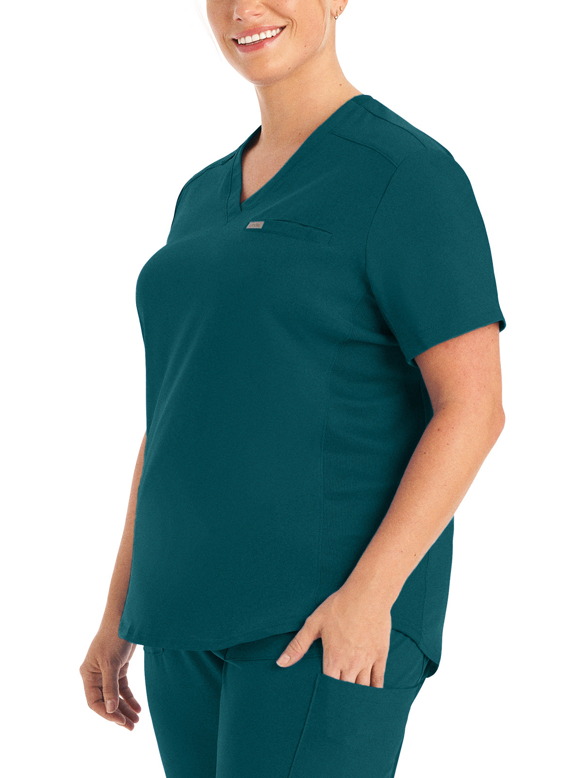 This modern fit scrub top features a soft rib-knit back neckband and rib-knit side panels for a comfortable and sleek fit. With a front welt chest pocket and right front zip security pocket, this top is the definition of a high-functioning style. Our modern tailored fit flatters your shape, while our moisture-wicking super stretch fabric provides the comfort and flexibility your work requires throughout the day.