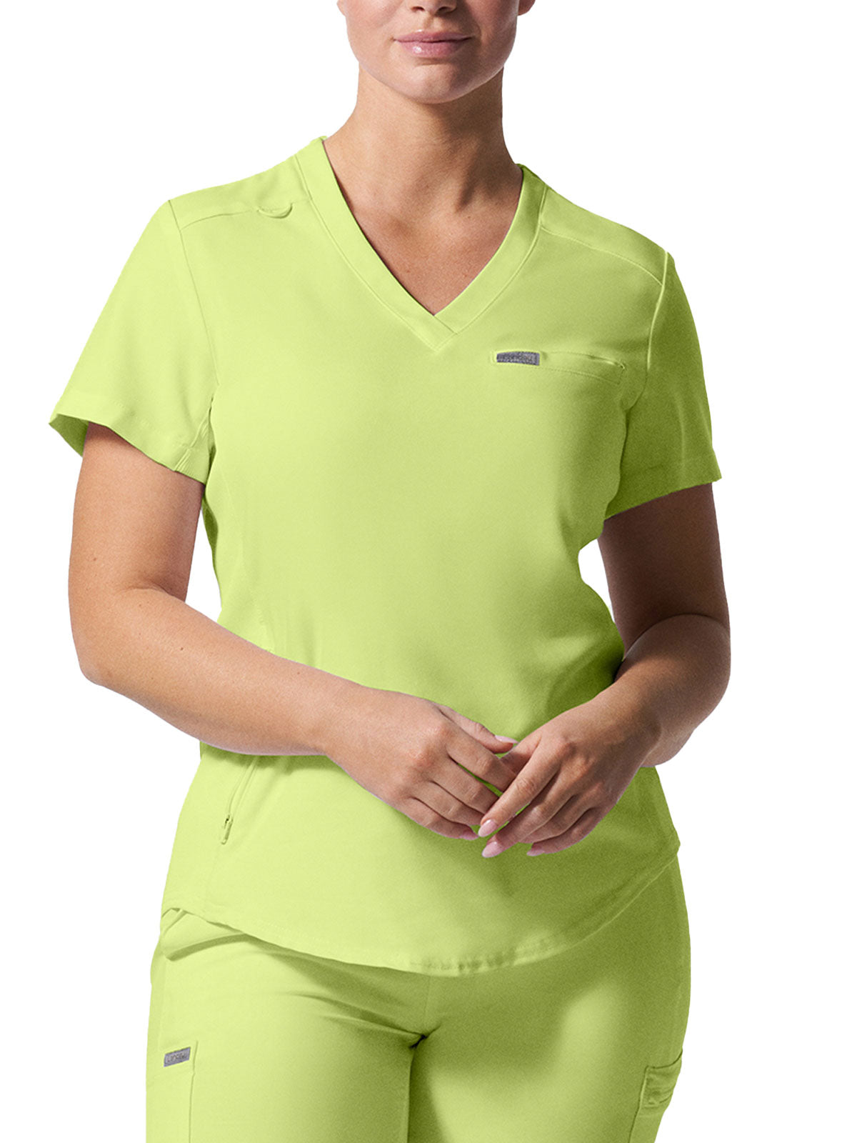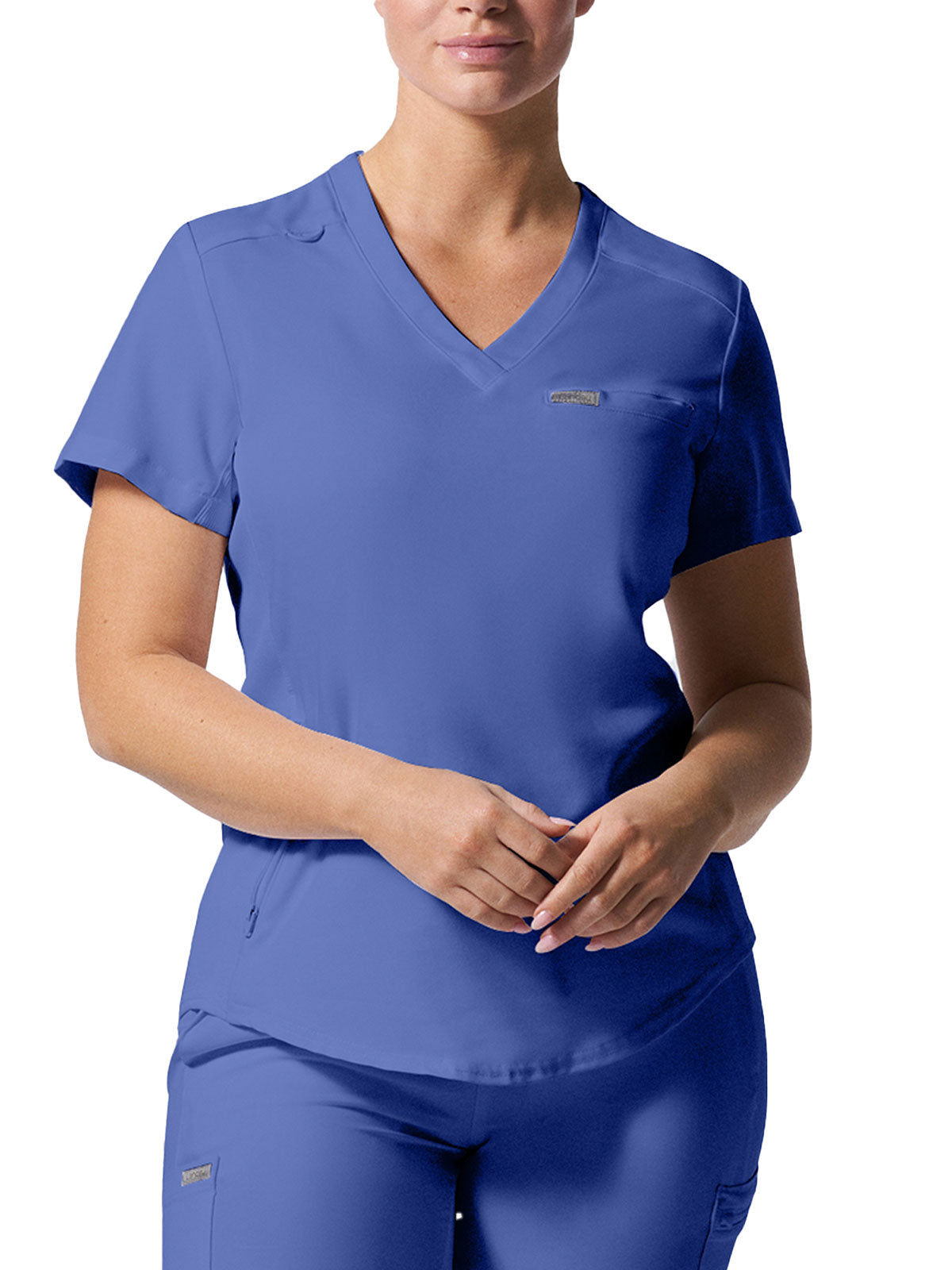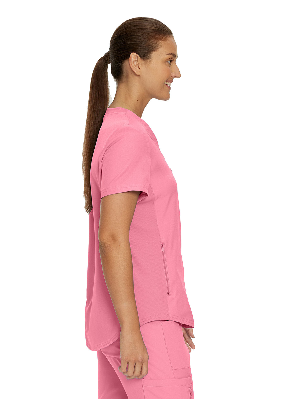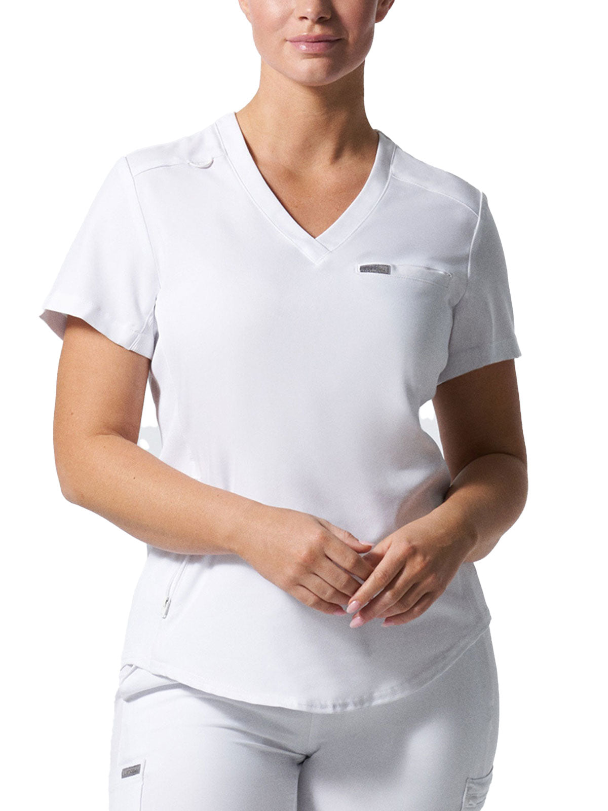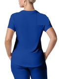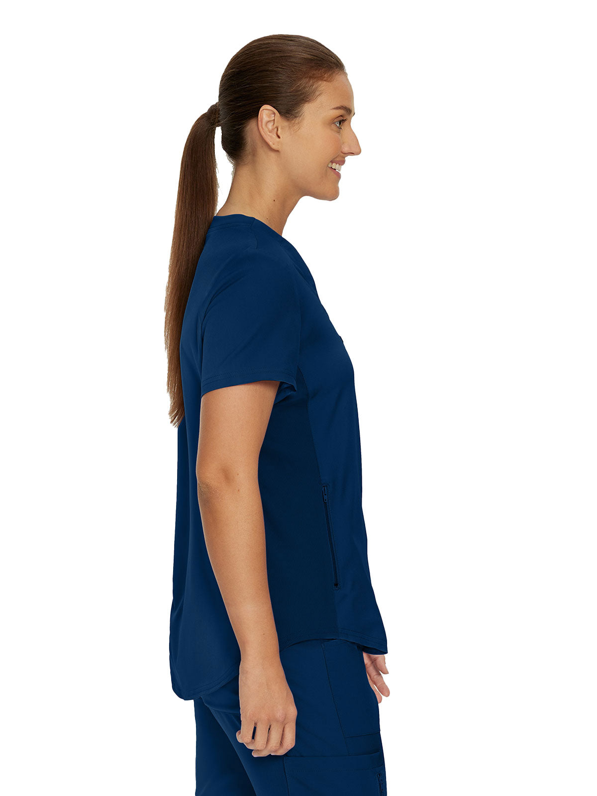 This modern fit scrub top features a soft rib-knit back neckband and rib-knit side panels for a comfortable and sleek fit. With a front welt chest pocket and right front zip security pocket, this top is the definition of a high-functioning style. Our modern tailored fit flatters your shape, while our moisture-wicking super stretch fabric provides the comfort and flexibility your work requires throughout the day.