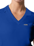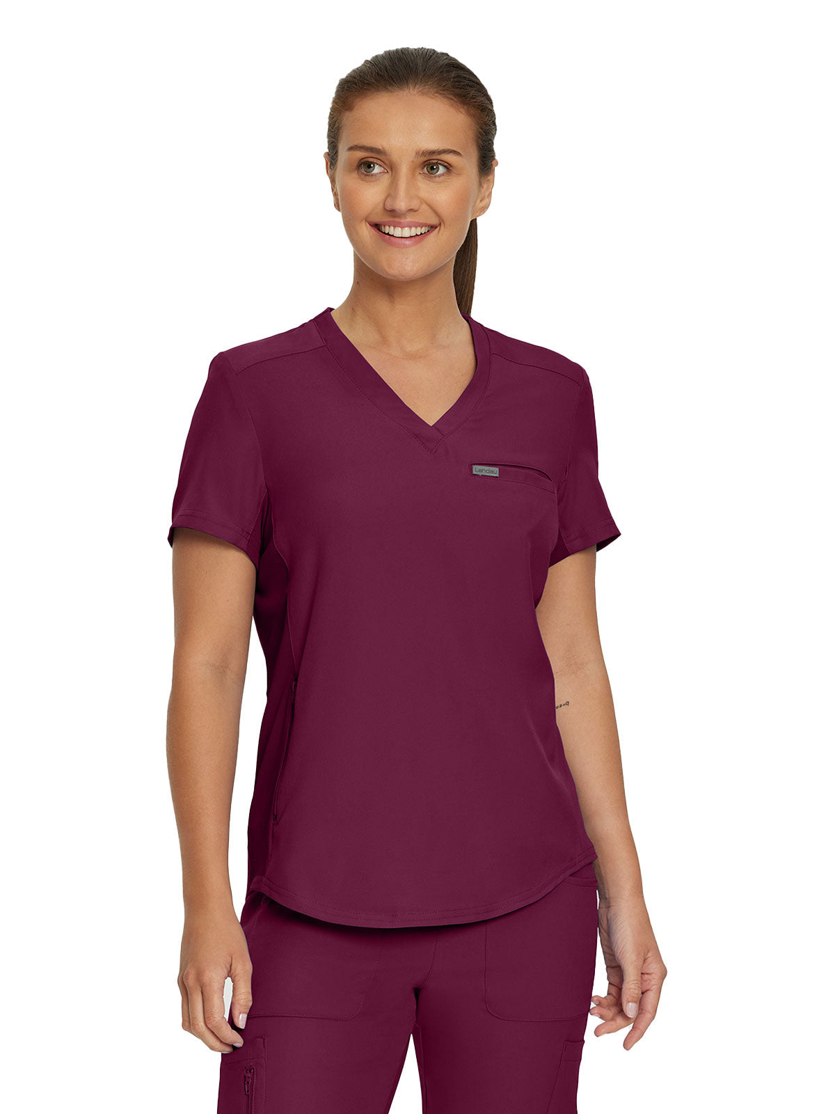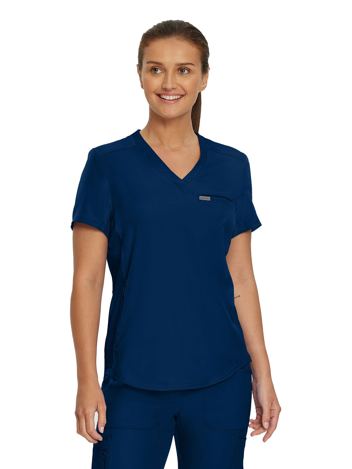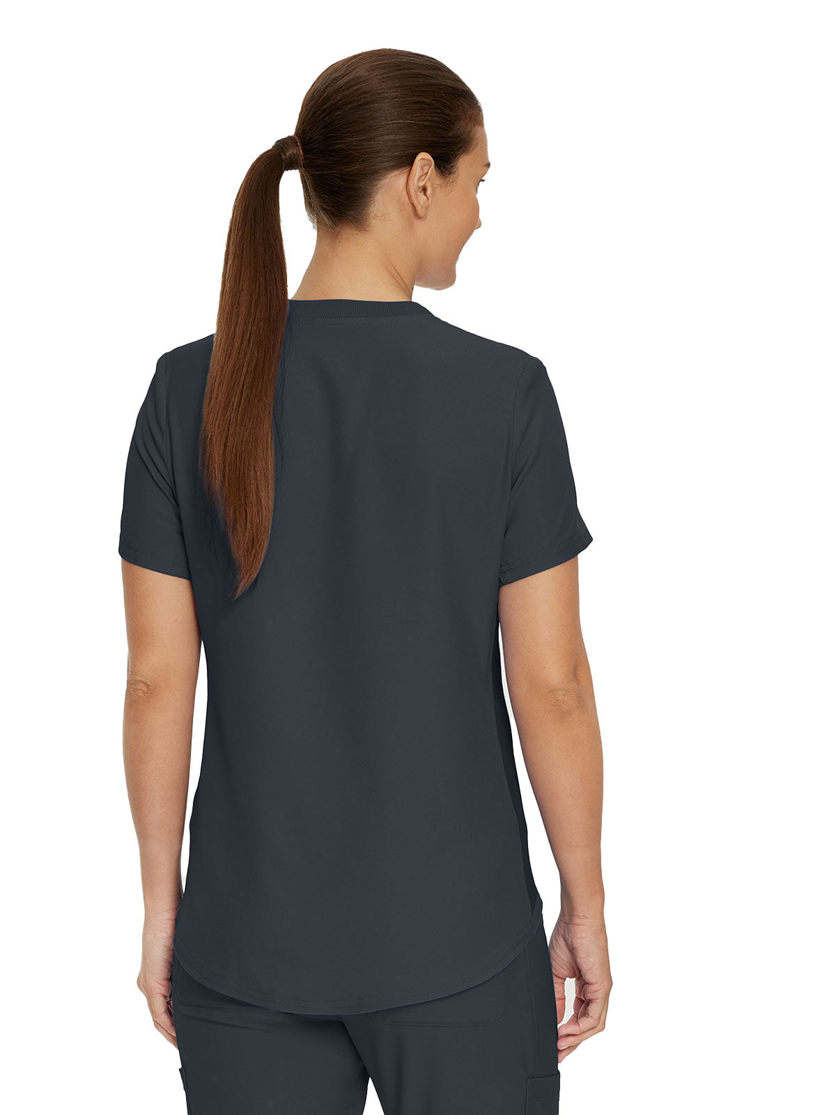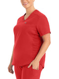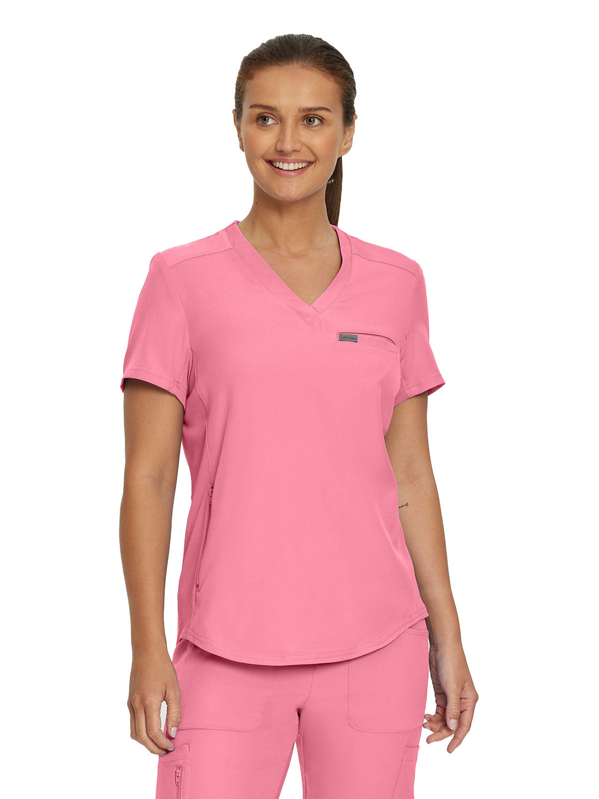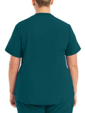 This modern fit scrub top features a soft rib-knit back neckband and rib-knit side panels for a comfortable and sleek fit. With a front welt chest pocket and right front zip security pocket, this top is the definition of a high-functioning style. Our modern tailored fit flatters your shape, while our moisture-wicking super stretch fabric provides the comfort and flexibility your work requires throughout the day.